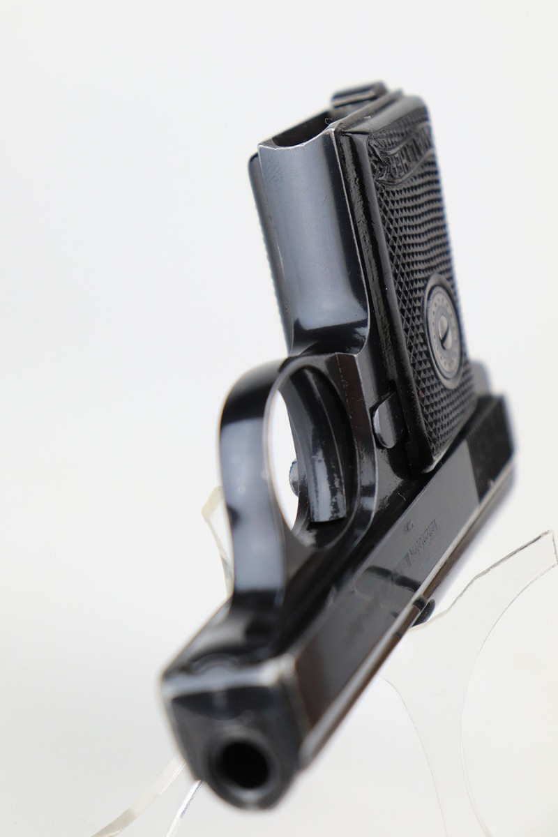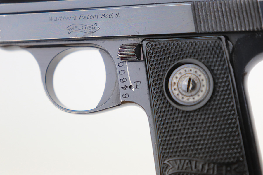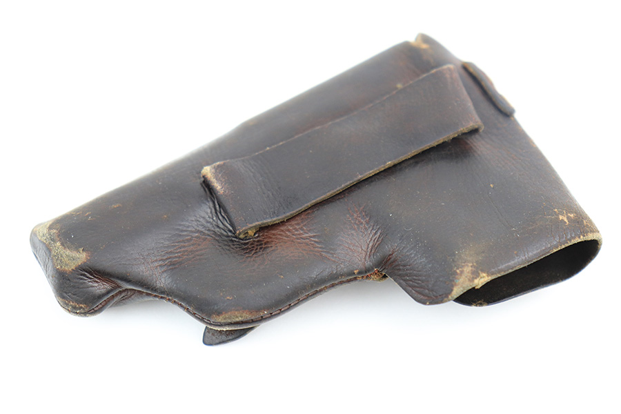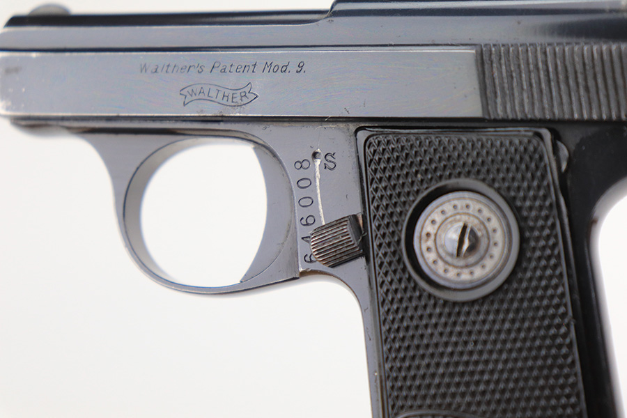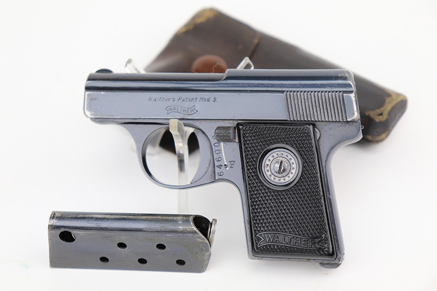 4/21/22 – This is an excellent, honest example of a Walther Model 9 from the late 1930’s that comes with period original soft leather holster. The gun has about 97% of the original blue remaining, with muzzle wear on both sides of the slide and a little bluing loss on the rear of the slide’s right side. Excellent grips with minimal handling wear. Minty bore. Original Walther banner magazine. The holster has a few small tears but has clearly been with this pistol a long time as it is form fit to it.