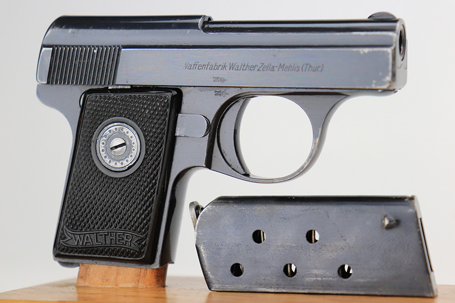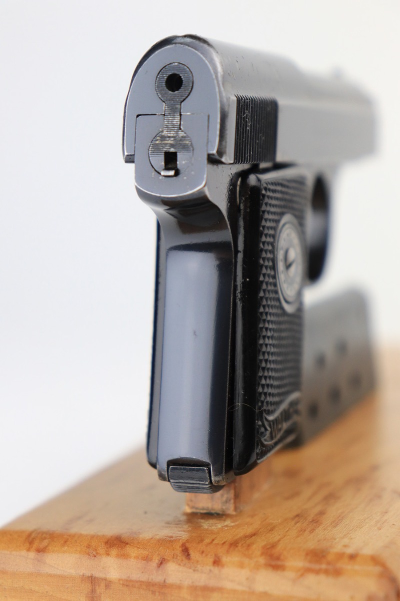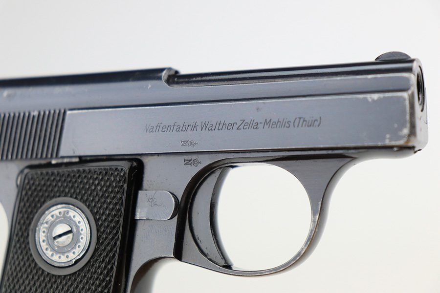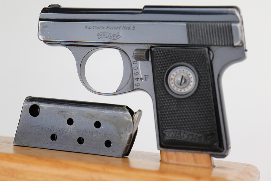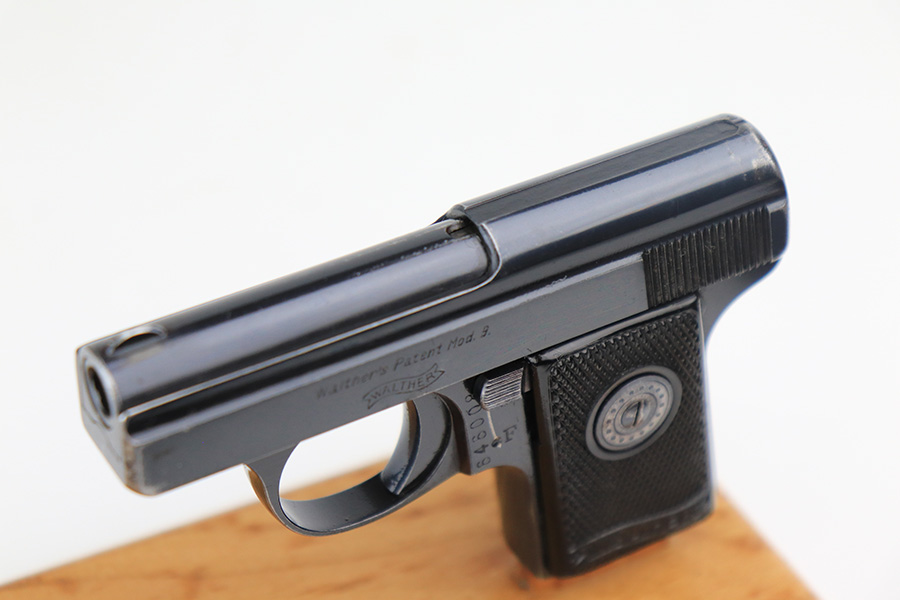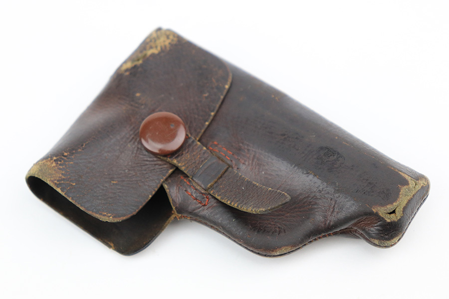 4/21/22 – This is an excellent, honest example of a Walther Model 9 from the late 1930’s that comes with period original soft leather holster. The gun has about 97% of the original blue remaining, with muzzle wear on both sides of the slide and a little bluing loss on the rear of the slide’s right side. Excellent grips with minimal handling wear. Minty bore. Original Walther banner magazine. The holster has a few small tears but has clearly been with this pistol a long time as it is form fit to it.