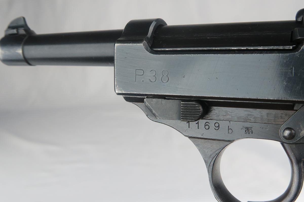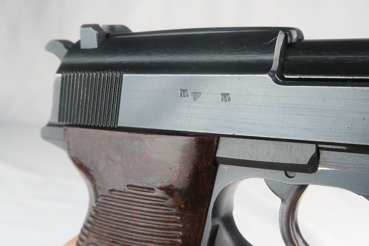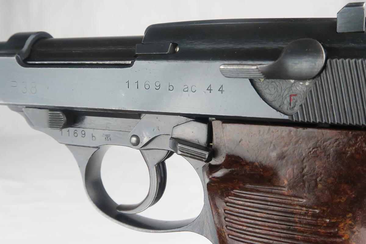 10/24/17 – This is an excellent, matching and original Walther P.38 from 1944. The military bluing rates at over 98%, with minor rub wear on the muzzle and high front edge of the slide. Excellent reddish Walther grips. Eagle/359 proofed magazine. Minty bore.