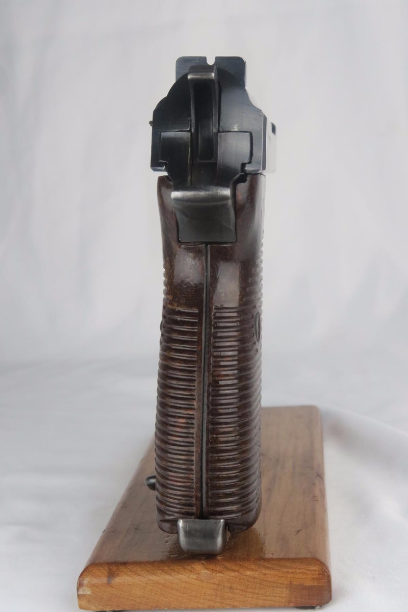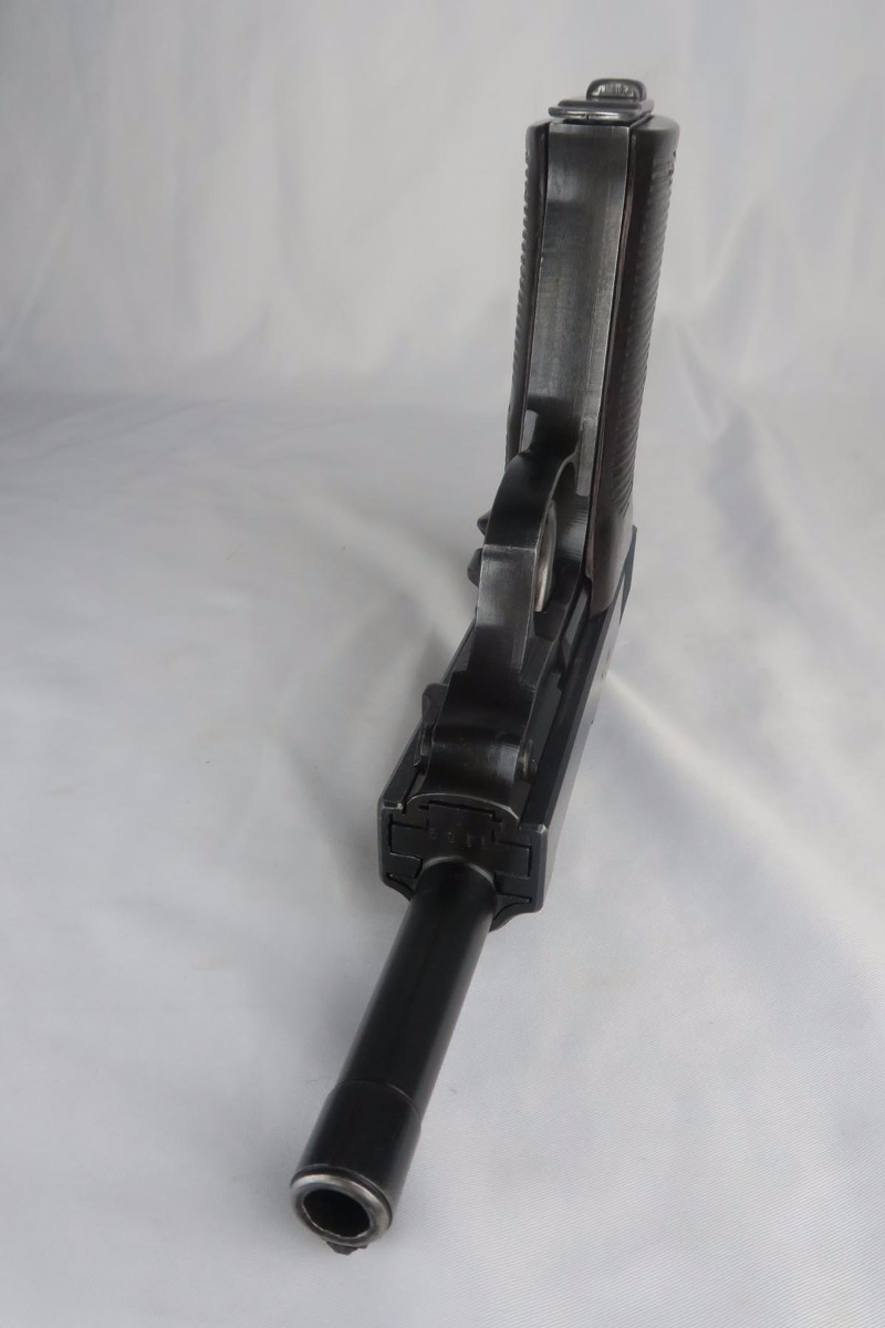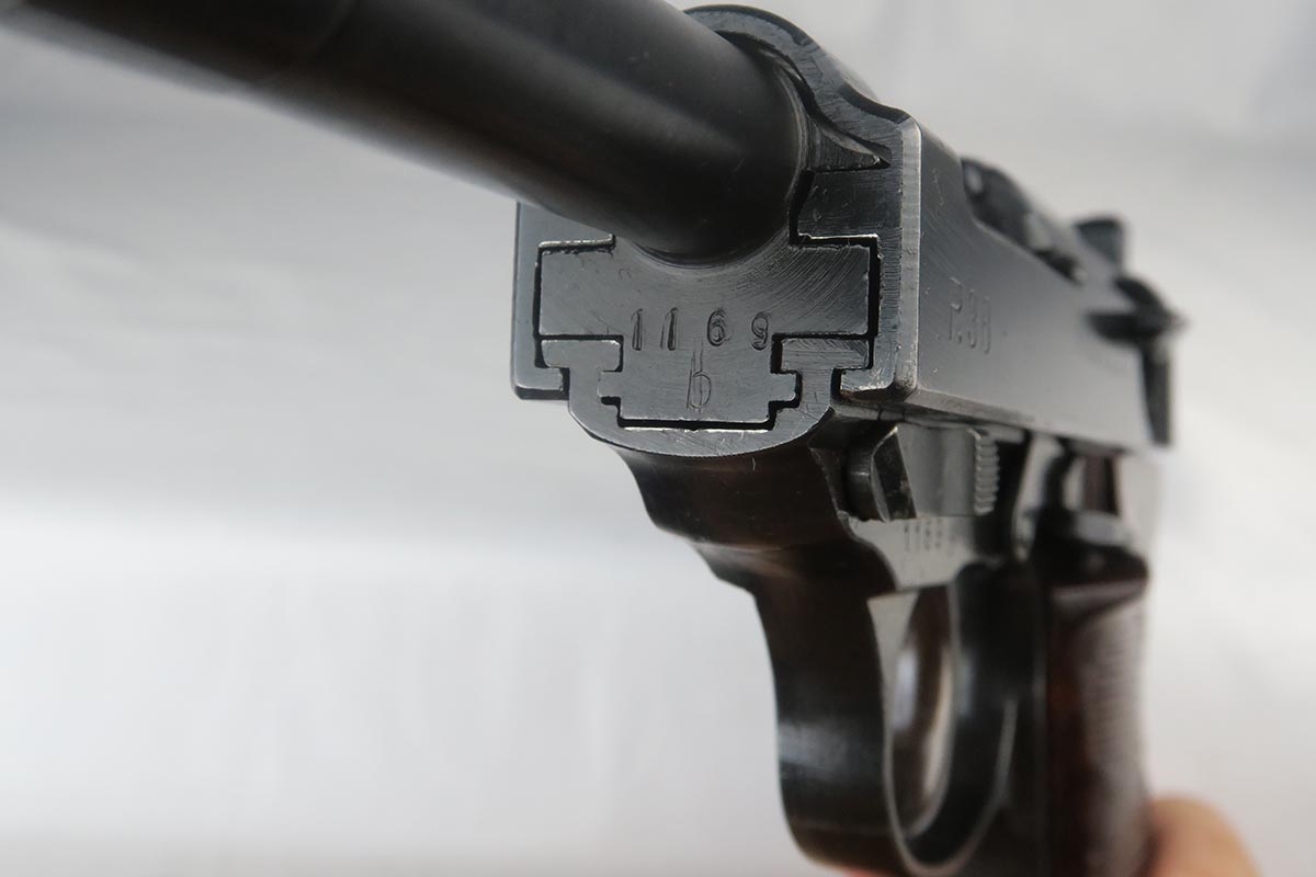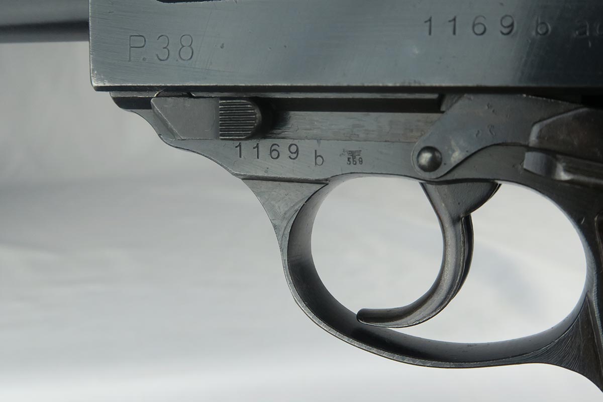 10/24/17 – This is an excellent, matching and original Walther P.38 from 1944. The military bluing rates at over 98%, with minor rub wear on the muzzle and high front edge of the slide. Excellent reddish Walther grips. Eagle/359 proofed magazine. Minty bore.