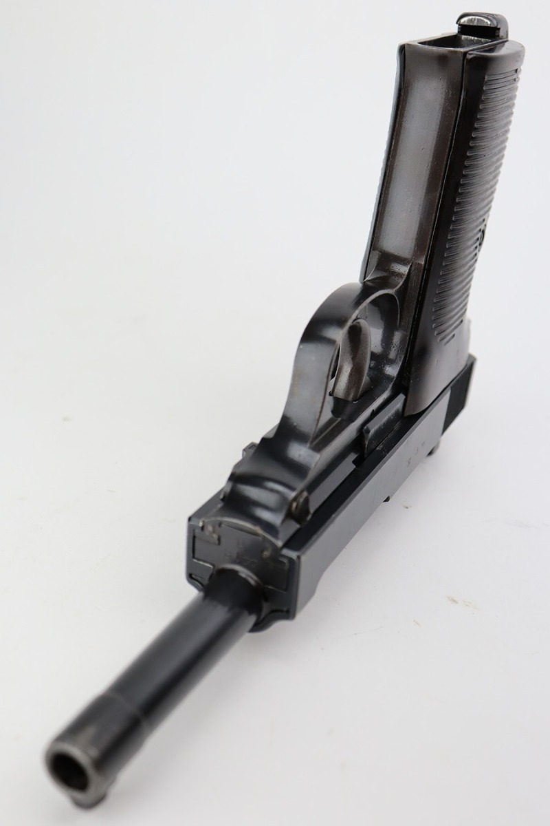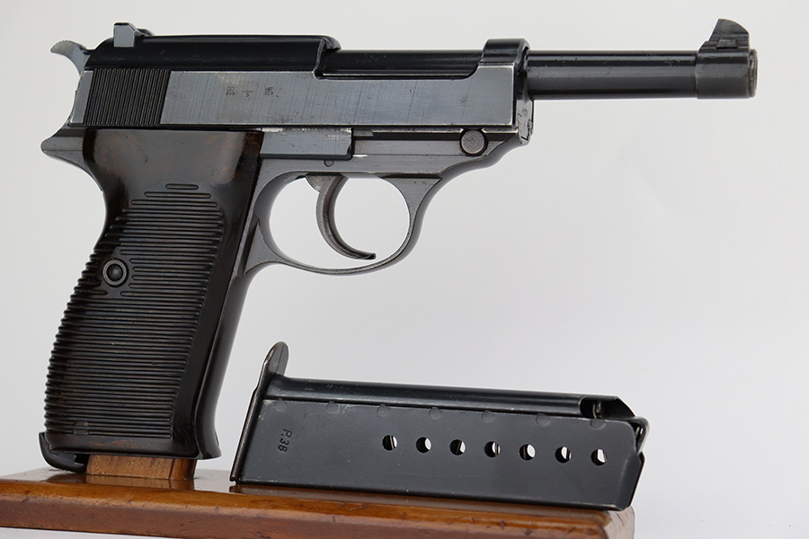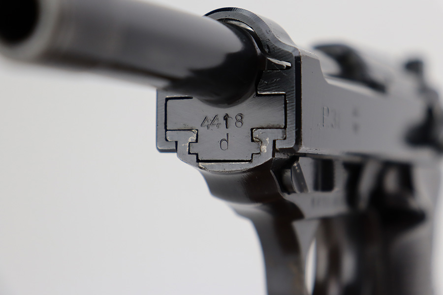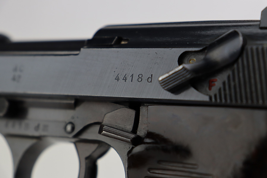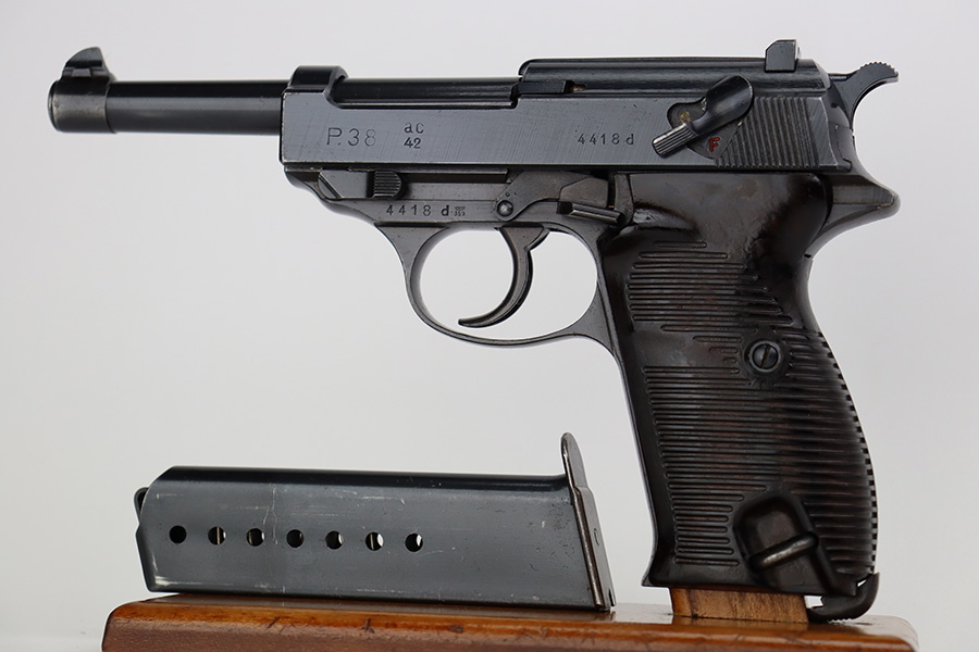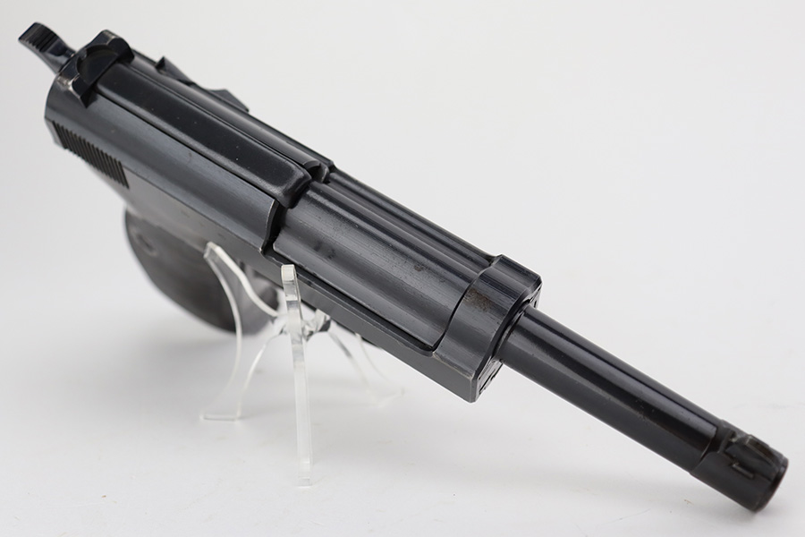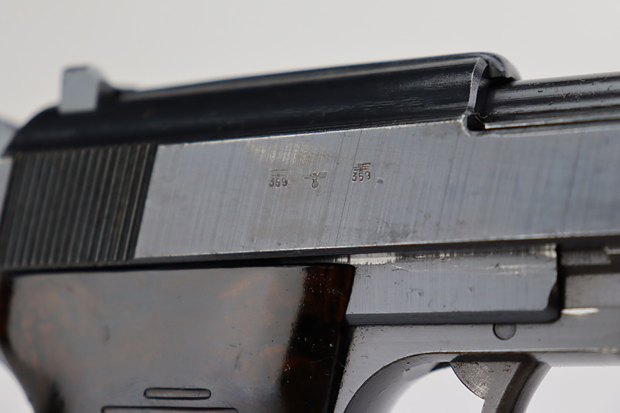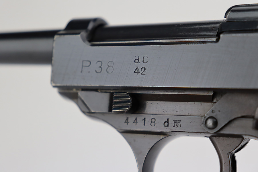 7/7/23 – This is an excellent, original Walther P.38 from 1942. Made in May of 1942, all matching numbered parts but the locking block is an unnumbered Walther example. Terrific bluing throughout with only minor wear around the muzzle and left side of barrel. Strong, shiny bore with just a hint of frost. Excellent brown grips with no cracks or chips. Walther mag. Good mechanics, including de-cocker.