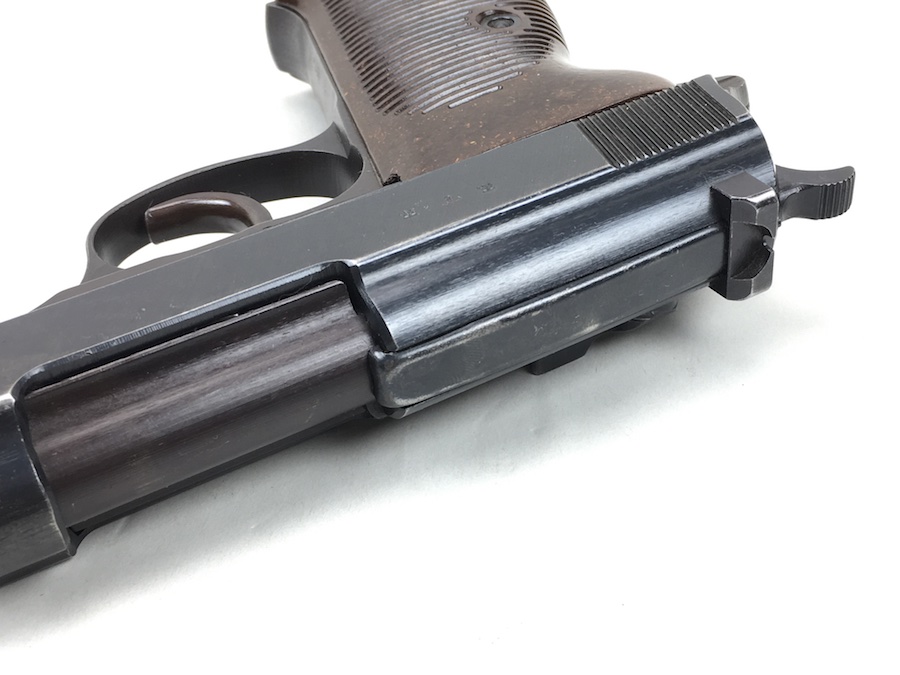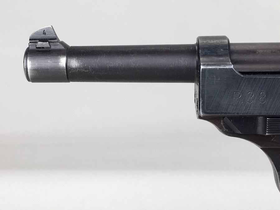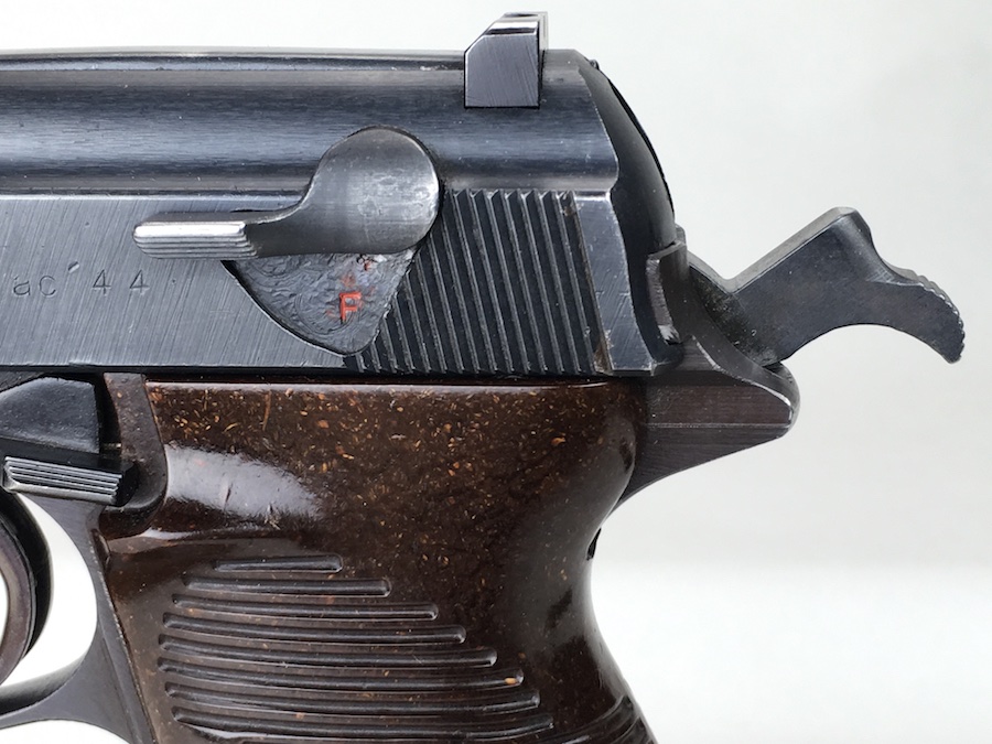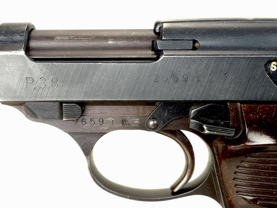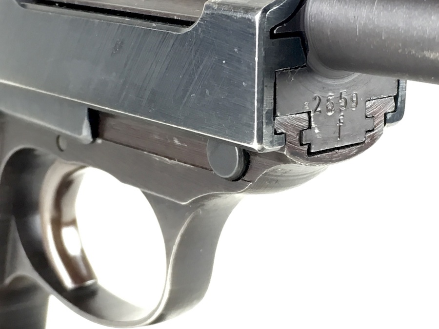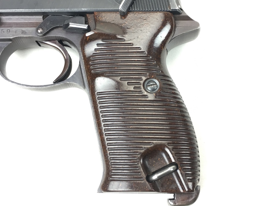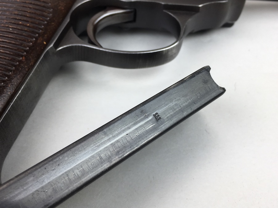 8/26/19 – This is an all matching and original Walther P.38 from 1944. Nice plum hue to the frame. There’s maybe 2-3% wear on slide and barrel. Typical muzzle wear and light edge wear. The front grip strap is excellent. Overall, this pistol has the rougher, late-war finish so it’s difficult to grade. Excellent, shiny bore. Fantastic reddish Walther grips. Walther magazine. All correct parts and fully functional.