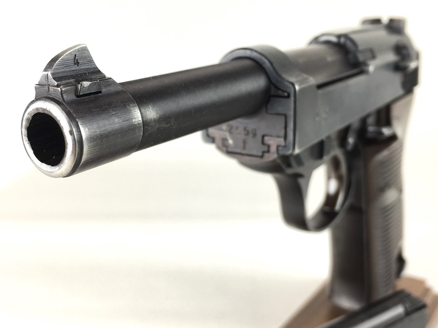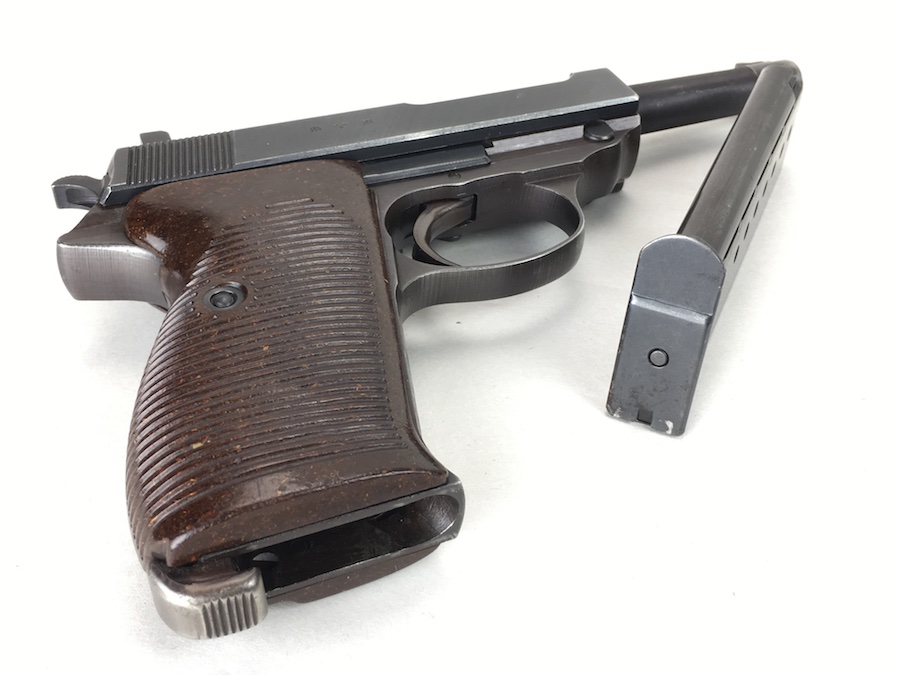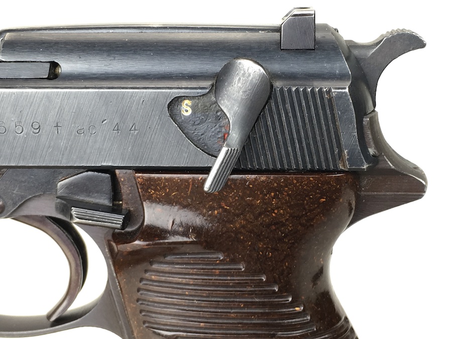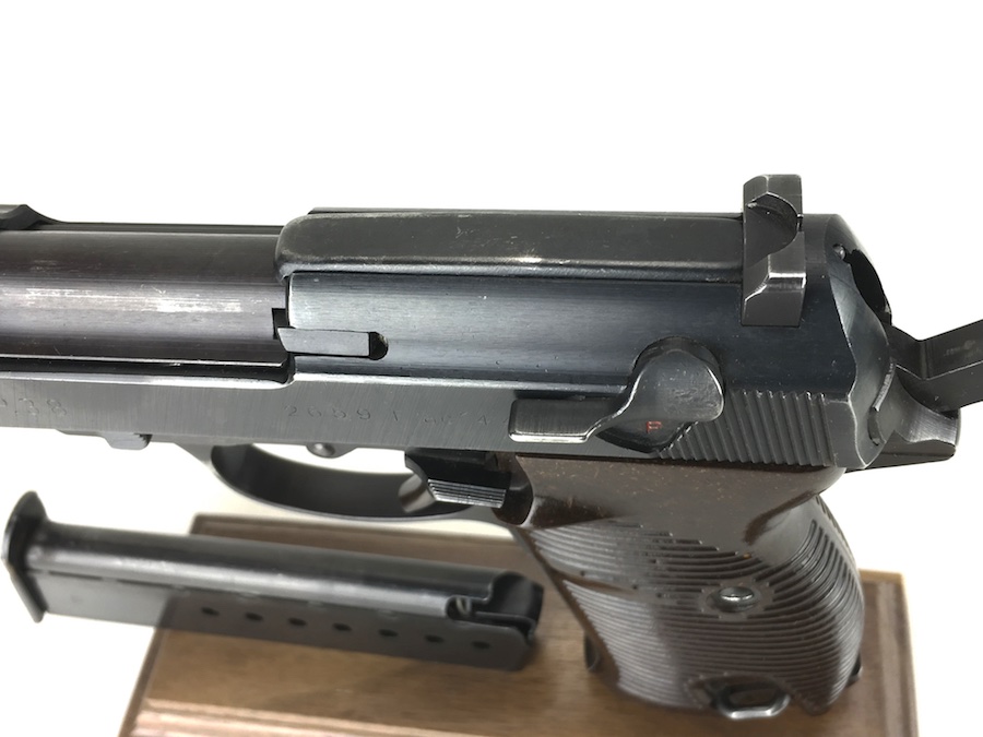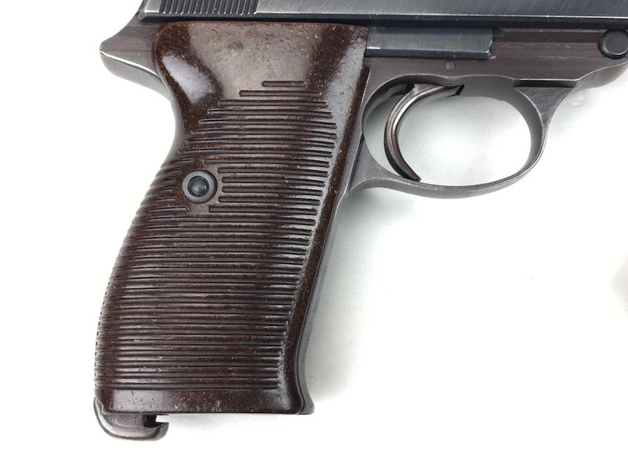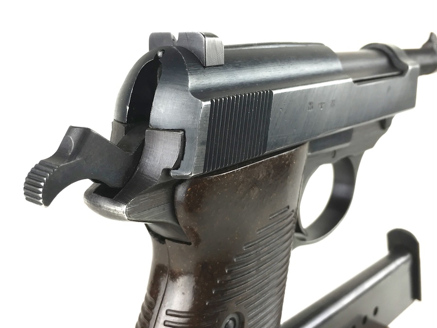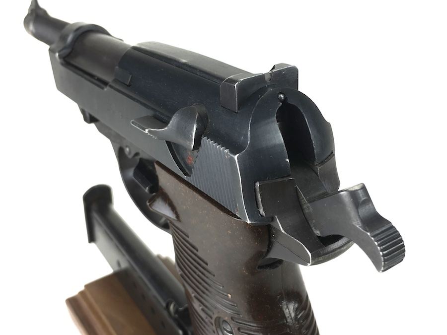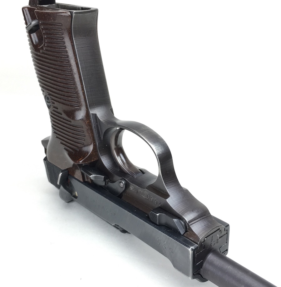 8/26/19 – This is an all matching and original Walther P.38 from 1944. Nice plum hue to the frame. There’s maybe 2-3% wear on slide and barrel. Typical muzzle wear and light edge wear. The front grip strap is excellent. Overall, this pistol has the rougher, late-war finish so it’s difficult to grade. Excellent, shiny bore. Fantastic reddish Walther grips. Walther magazine. All correct parts and fully functional.