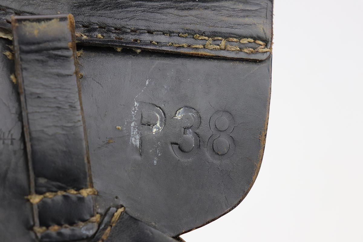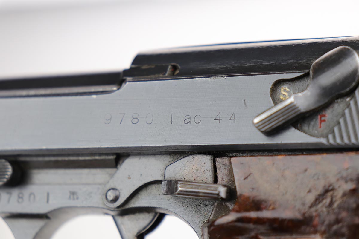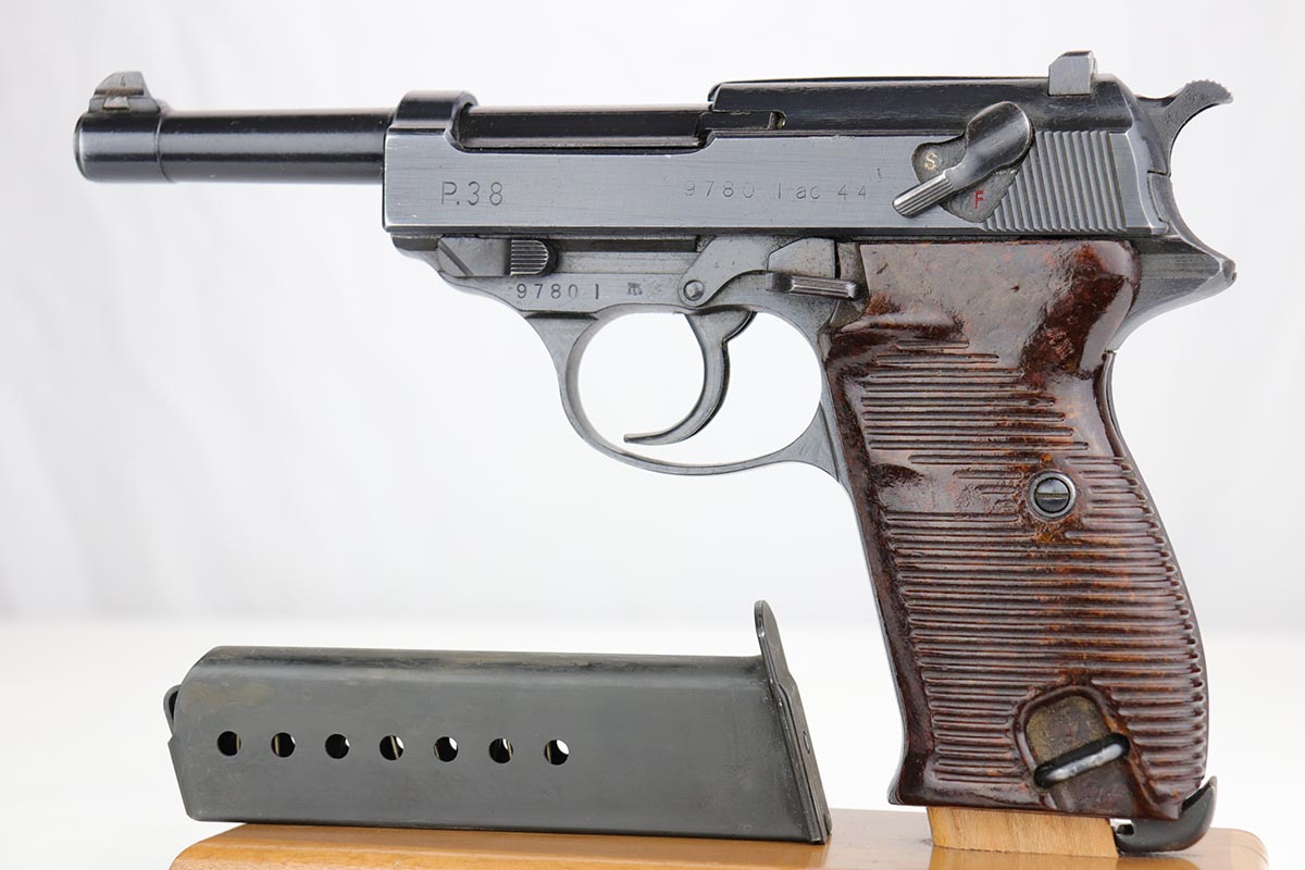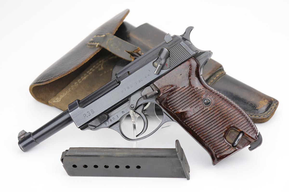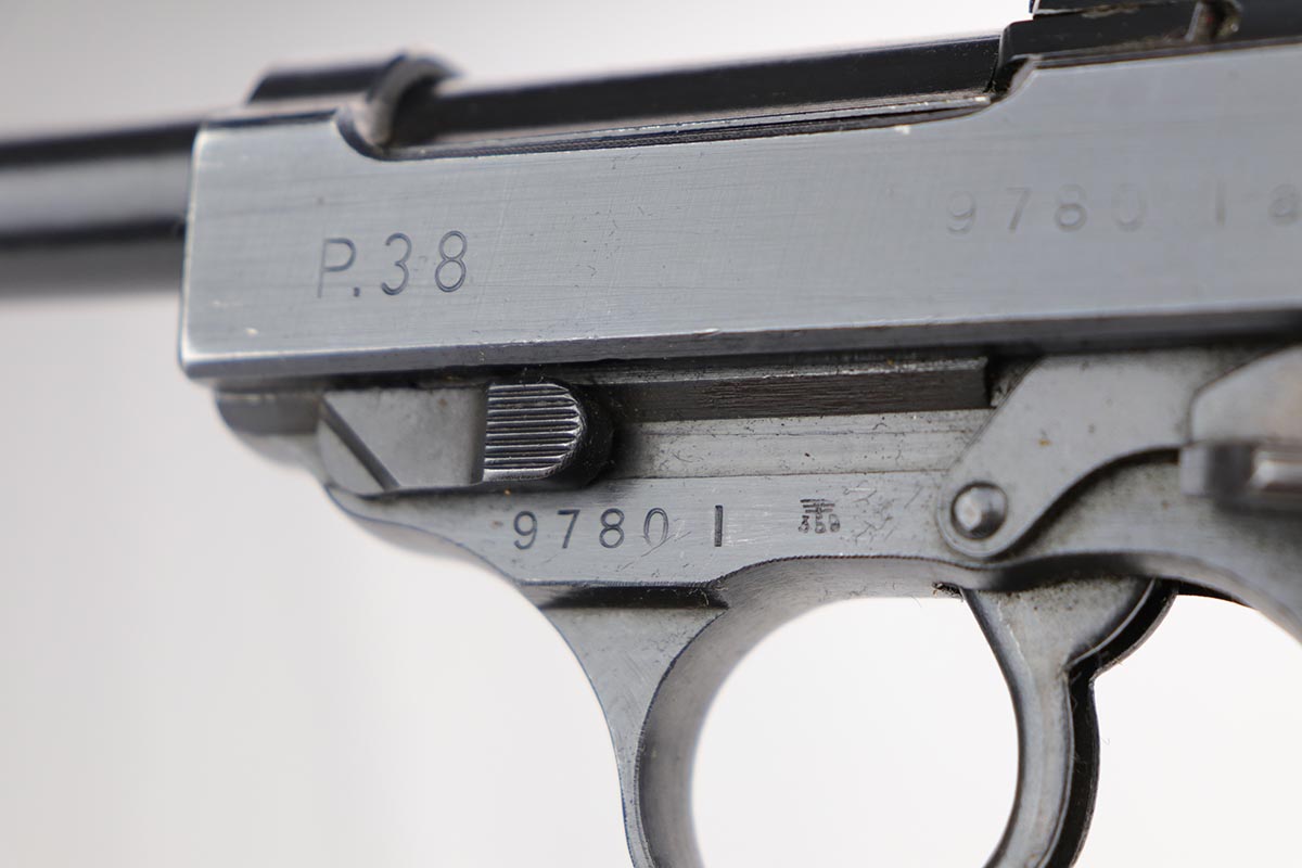 11/1/19 – This is a near-mint Walther P.38 from December of 1944 and comes with a ’44 dated softshell holster. The gun is all matching with about 98% bluing, showing minor holster wear on the muzzle and front edge of the slide, and a spot of wear on the top plate. Excellent reddish Walther grips. Minty bore. Good mechanics, including de-cocker. The gun came with an original holster but it’s got significant tears to closure flap, belt loops, etc. It doesn’t add any value but we are throwing it in with the gun.