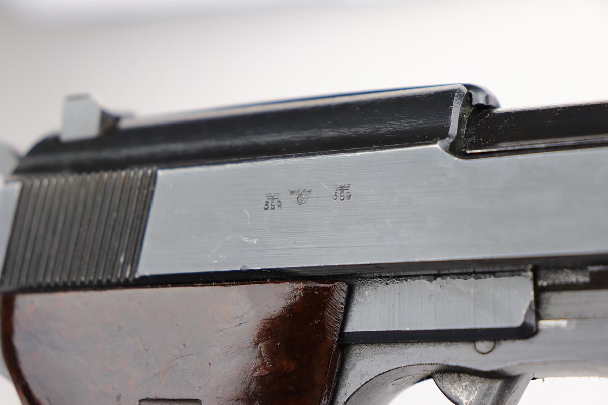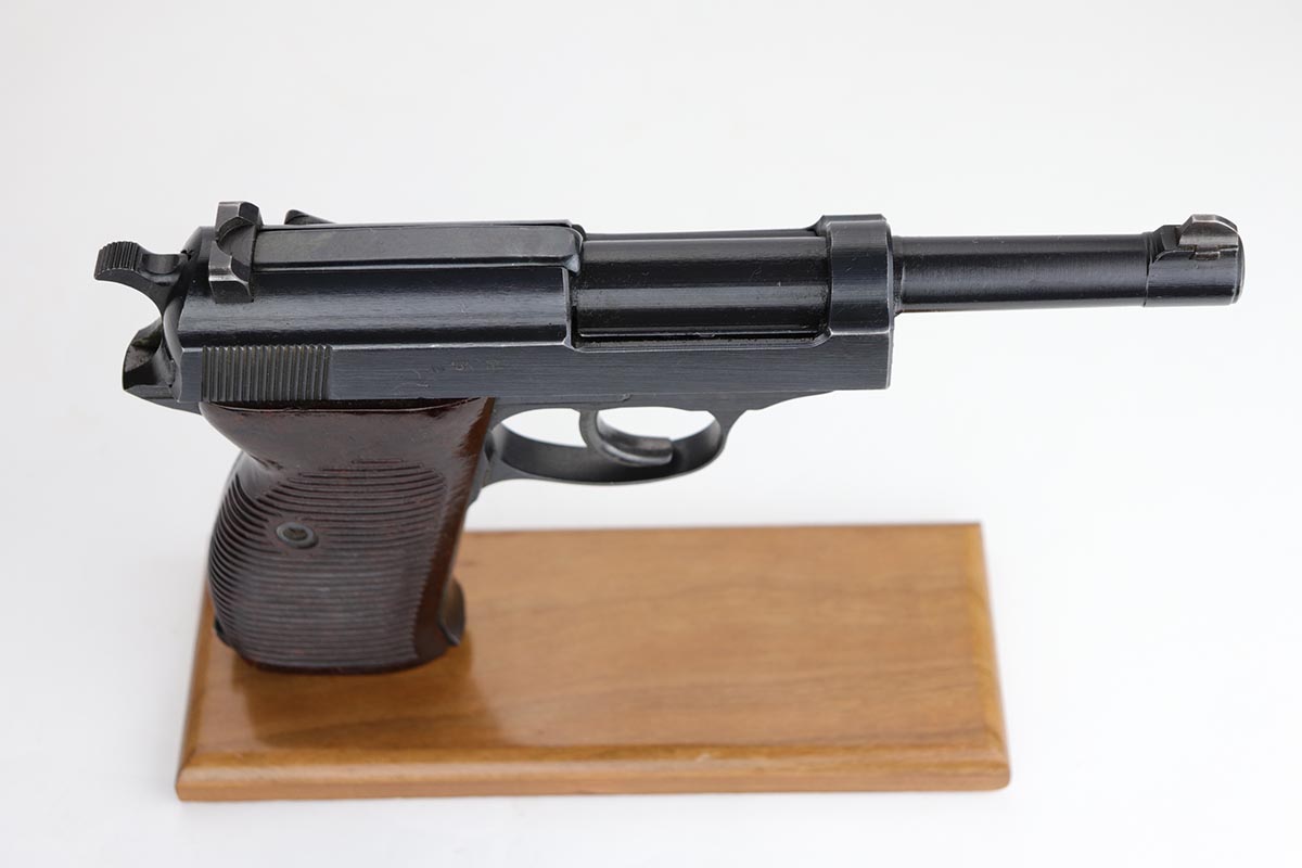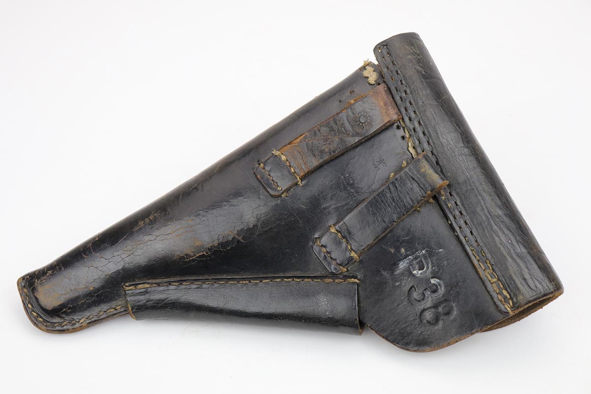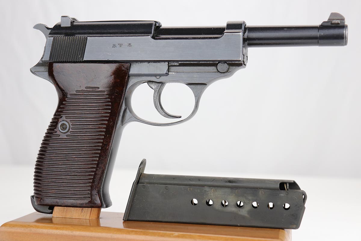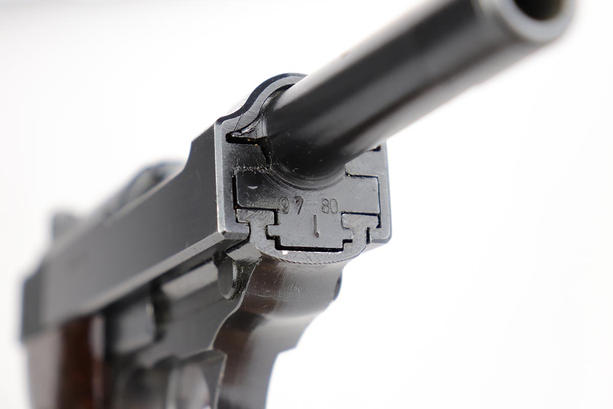 11/1/19 – This is a near-mint Walther P.38 from December of 1944 and comes with a ’44 dated softshell holster. The gun is all matching with about 98% bluing, showing minor holster wear on the muzzle and front edge of the slide, and a spot of wear on the top plate. Excellent reddish Walther grips. Minty bore. Good mechanics, including de-cocker. The gun came with an original holster but it’s got significant tears to closure flap, belt loops, etc. It doesn’t add any value but we are throwing it in with the gun.