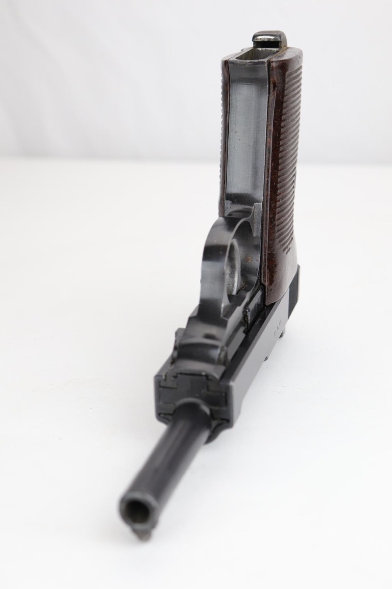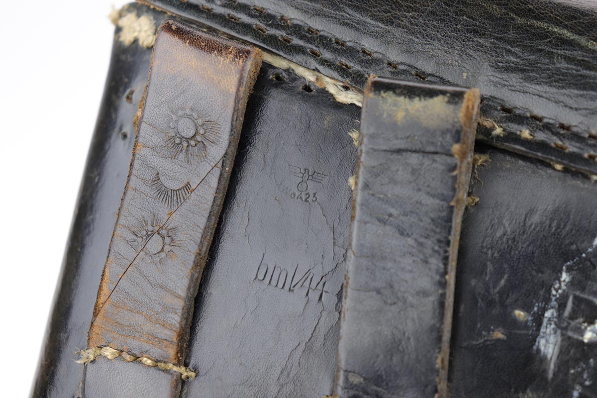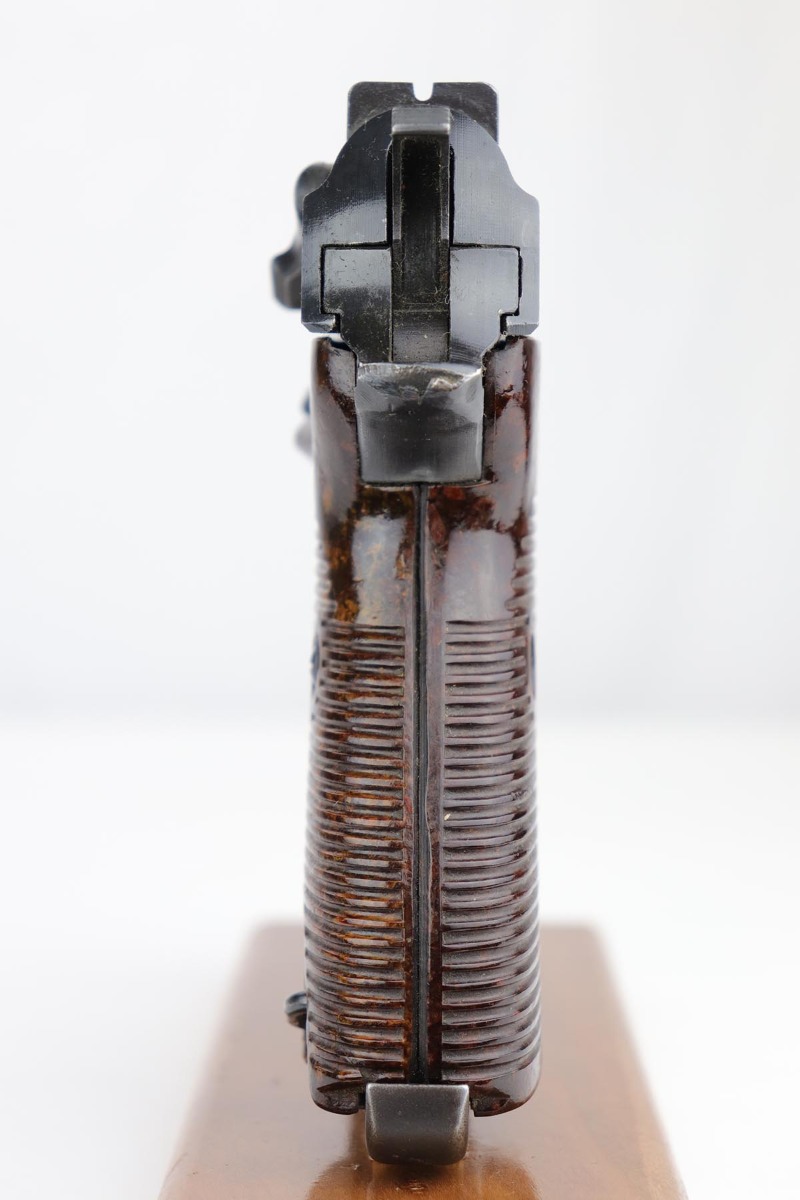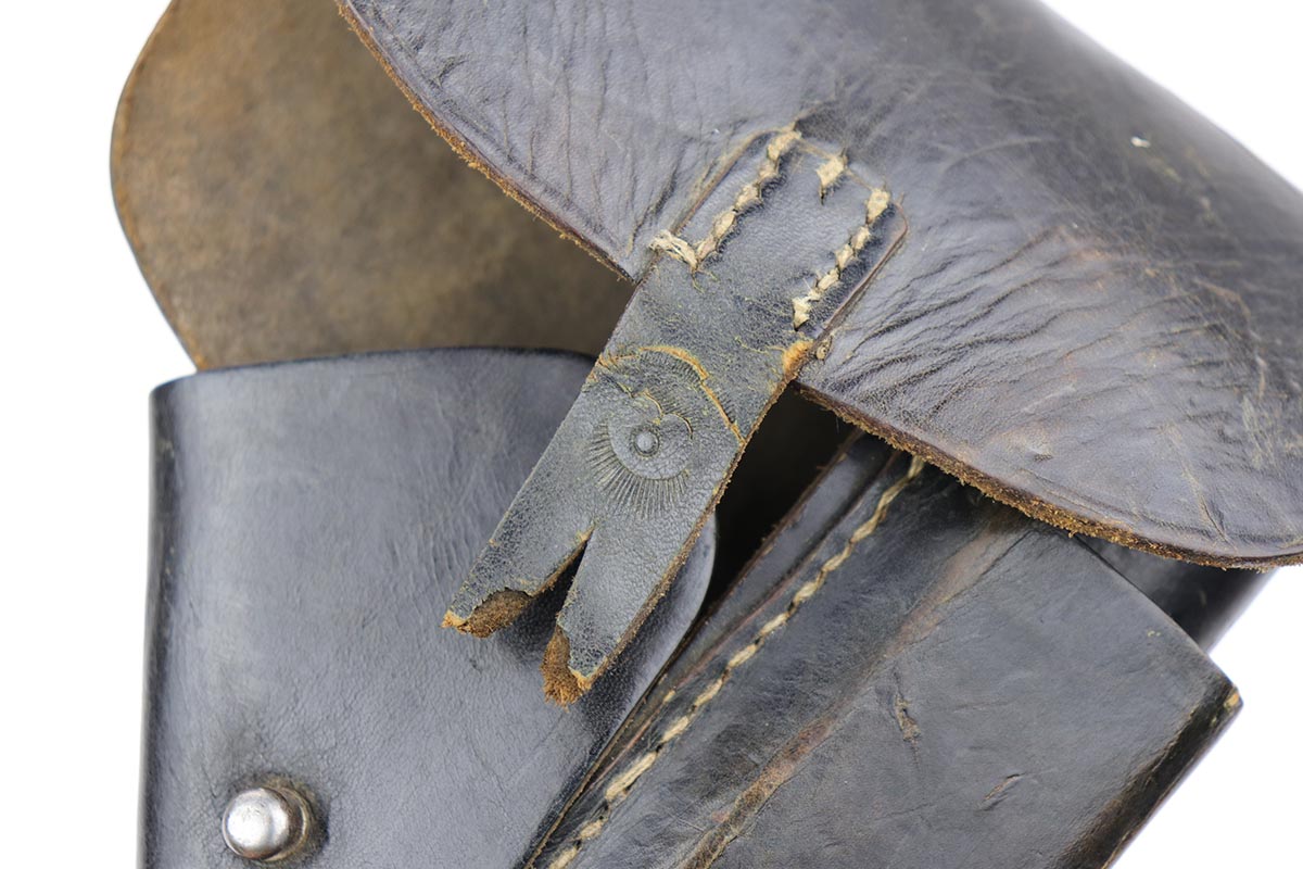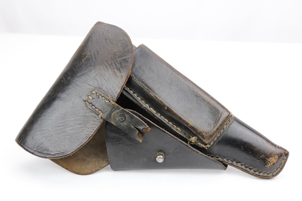 11/1/19 – This is a near-mint Walther P.38 from December of 1944 and comes with a ’44 dated softshell holster. The gun is all matching with about 98% bluing, showing minor holster wear on the muzzle and front edge of the slide, and a spot of wear on the top plate. Excellent reddish Walther grips. Minty bore. Good mechanics, including de-cocker. The gun came with an original holster but it’s got significant tears to closure flap, belt loops, etc. It doesn’t add any value but we are throwing it in with the gun.