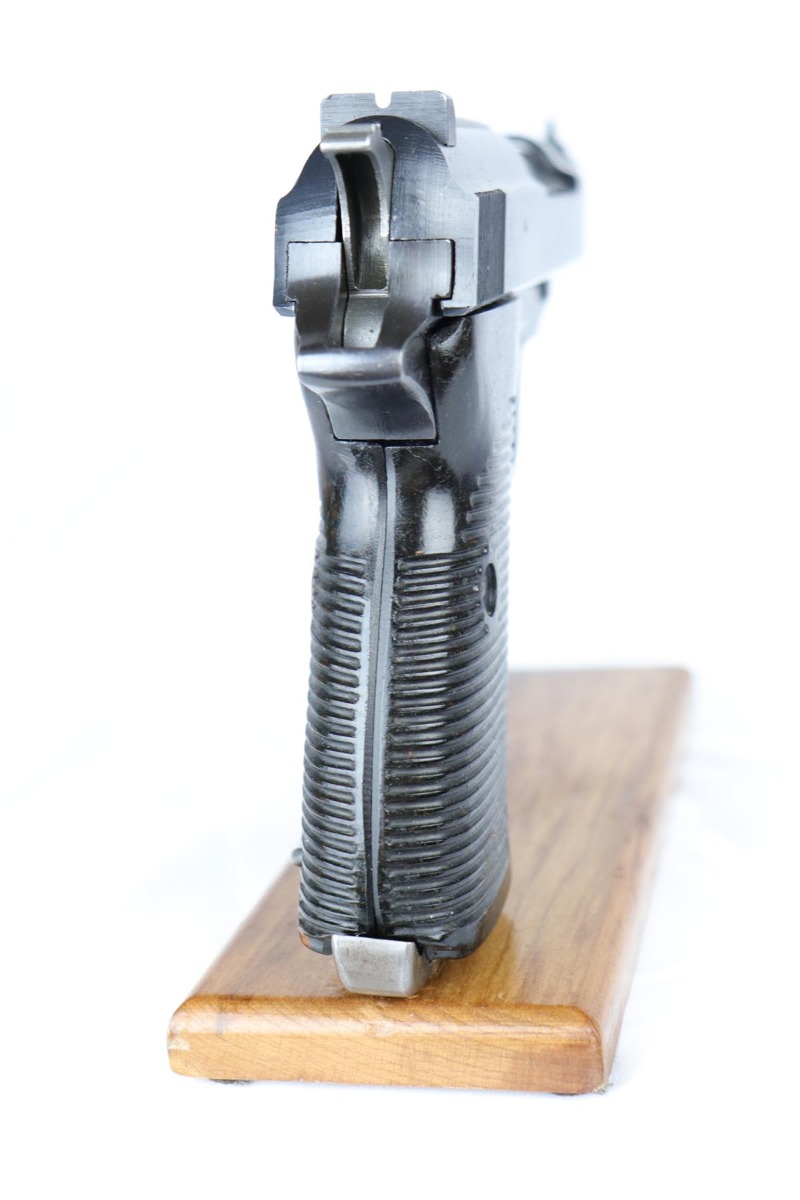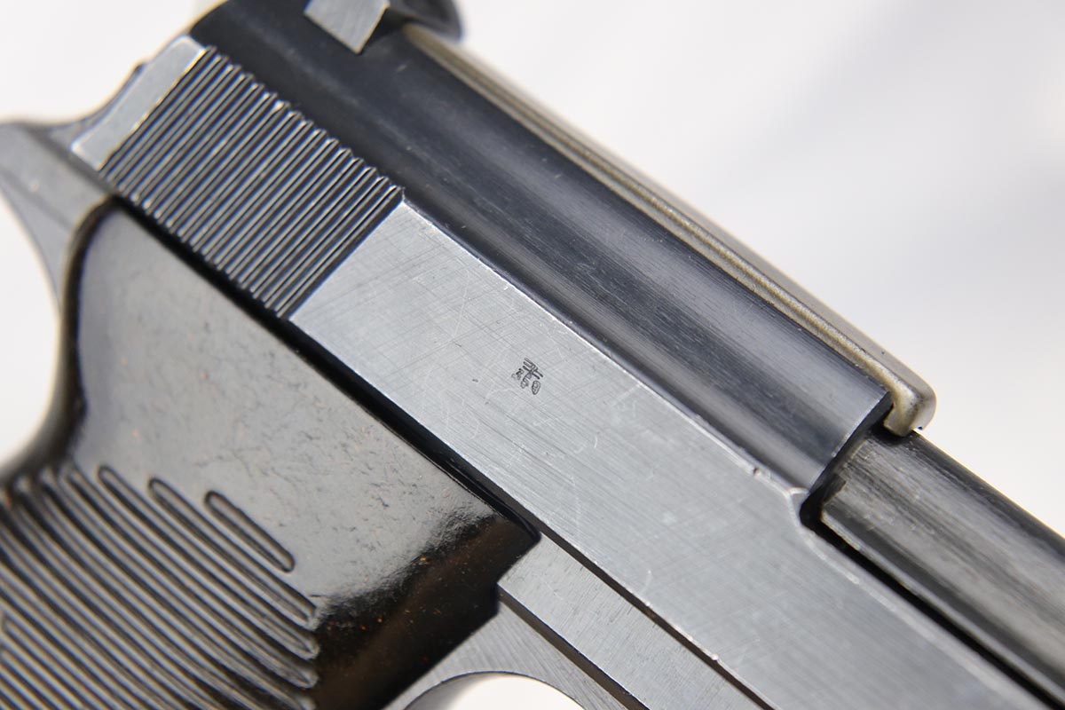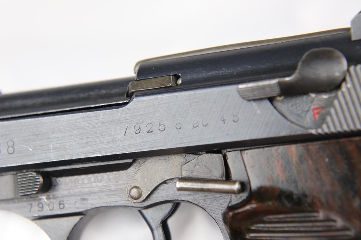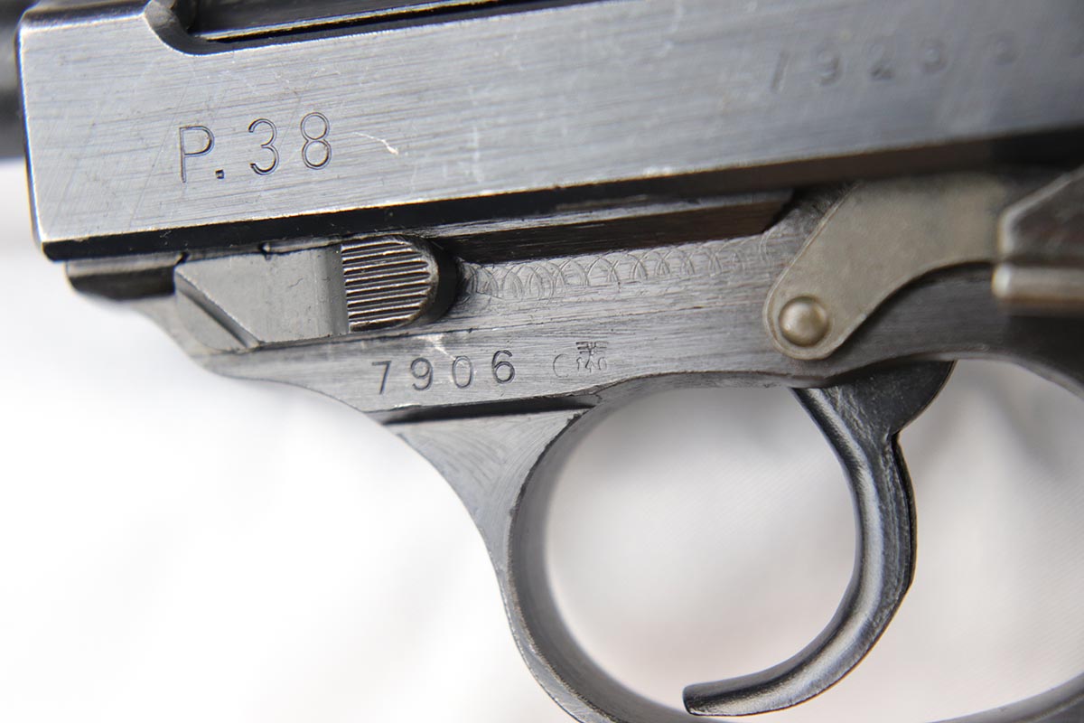 5/24/18 – This is an end of war Walther P.38 in excellent original condition. This pistol has mismatched frame and slide/barrel but is a known late-war variation that was put together from parts at the factory as the German’s scrambled to get as many weapons produced as possible. The finish is original and rates at 98% with minor edge and muzzle wear. The frame is E/140 proofed, denote the more scarce FN production. Late cog hammer and phosphate slide stop and top plate. Excellent bore.