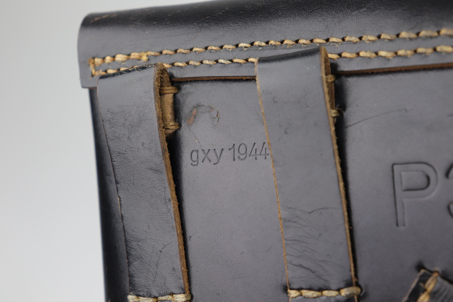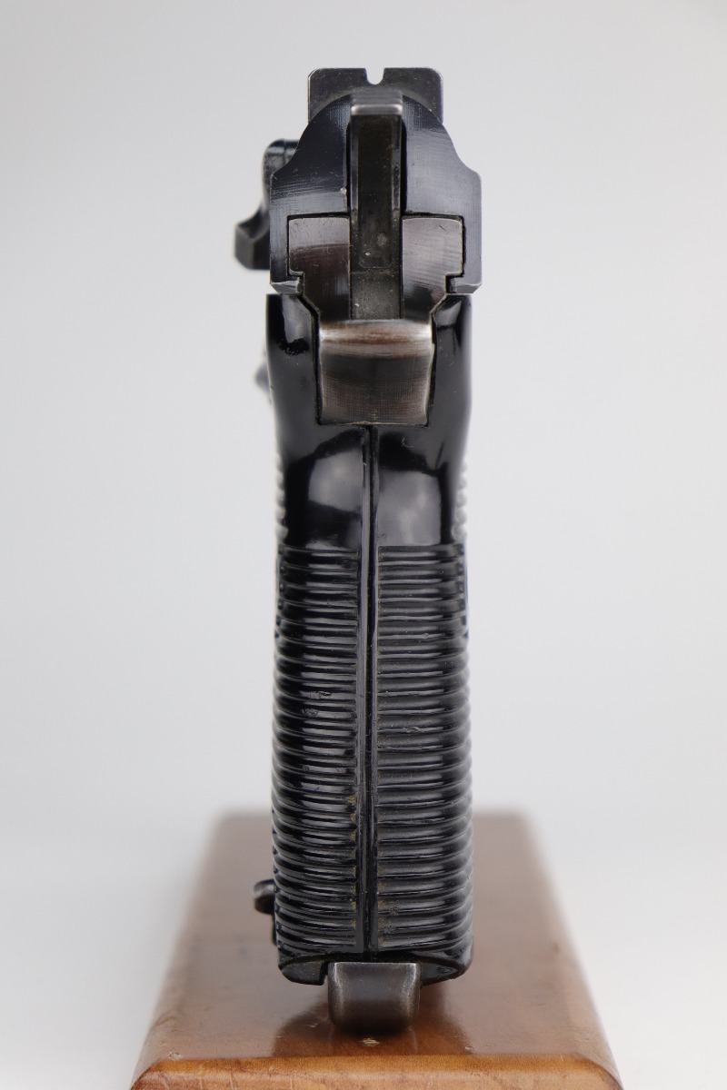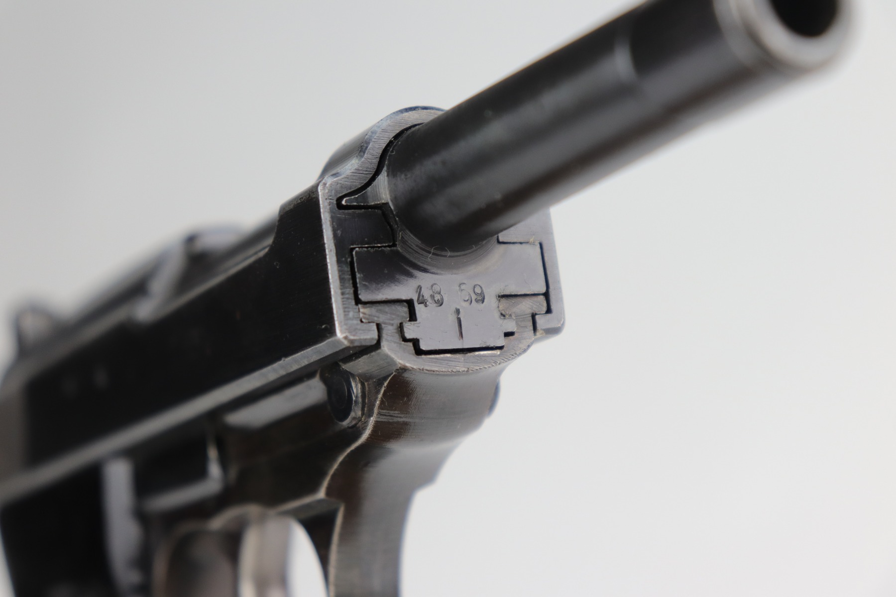 10/19/20 – This is an excellent example of a Walther P.38 rig, issued to the Nazi military in 1944. The rig comes with a minty, 1944-dated holster and two magazines. One of the magazines is period-correct, the other is post-war. The gun is all matching and has the proper “Eagle 359” Nazi military acceptance proofs. It is also fully functional, including the de-cocker. It has retained about 95-96% of its original bluing. There is minor muzzle wear, wear on the high edges of the slide, and thinning on the front strap, right side of the frame, and trigger guard. Some mild patina visible on the front strap. There are areas of spotty oxidation and pin-pricking on the webbing of the trigger guard and top plate. There is an area of minor pitting on the right side of the slide. Excellent, period-correct grips. The bore is very nice – strong rifling with some areas of minor freckling.