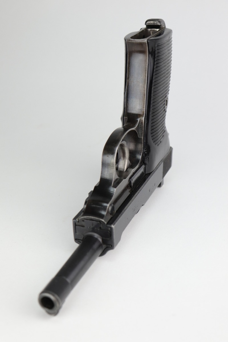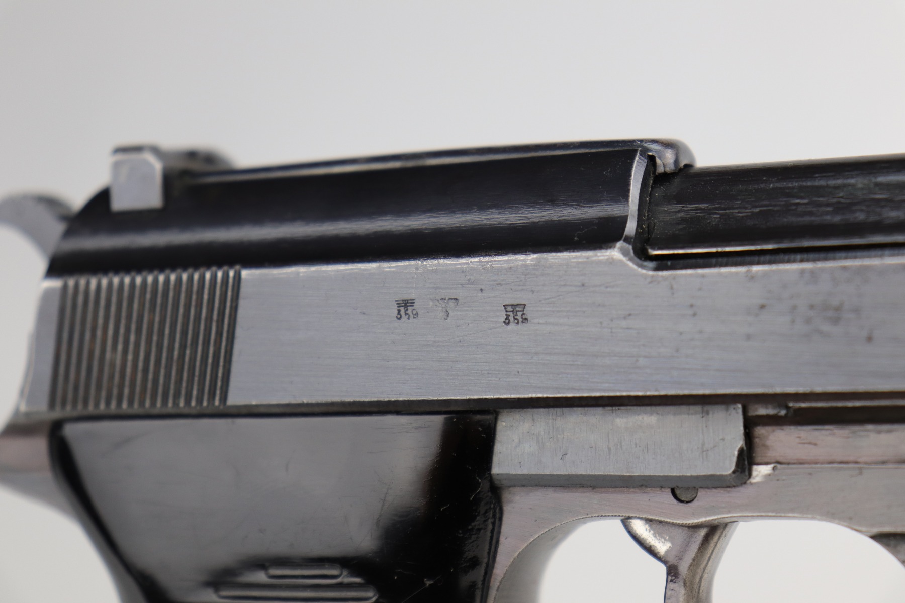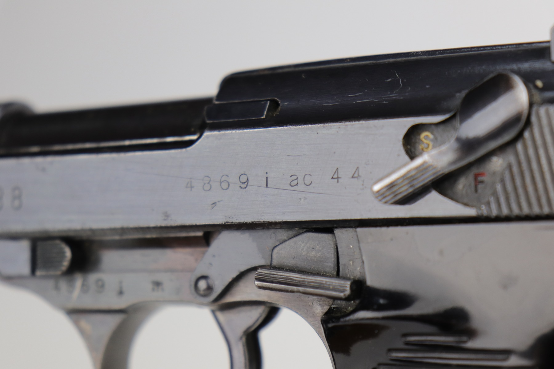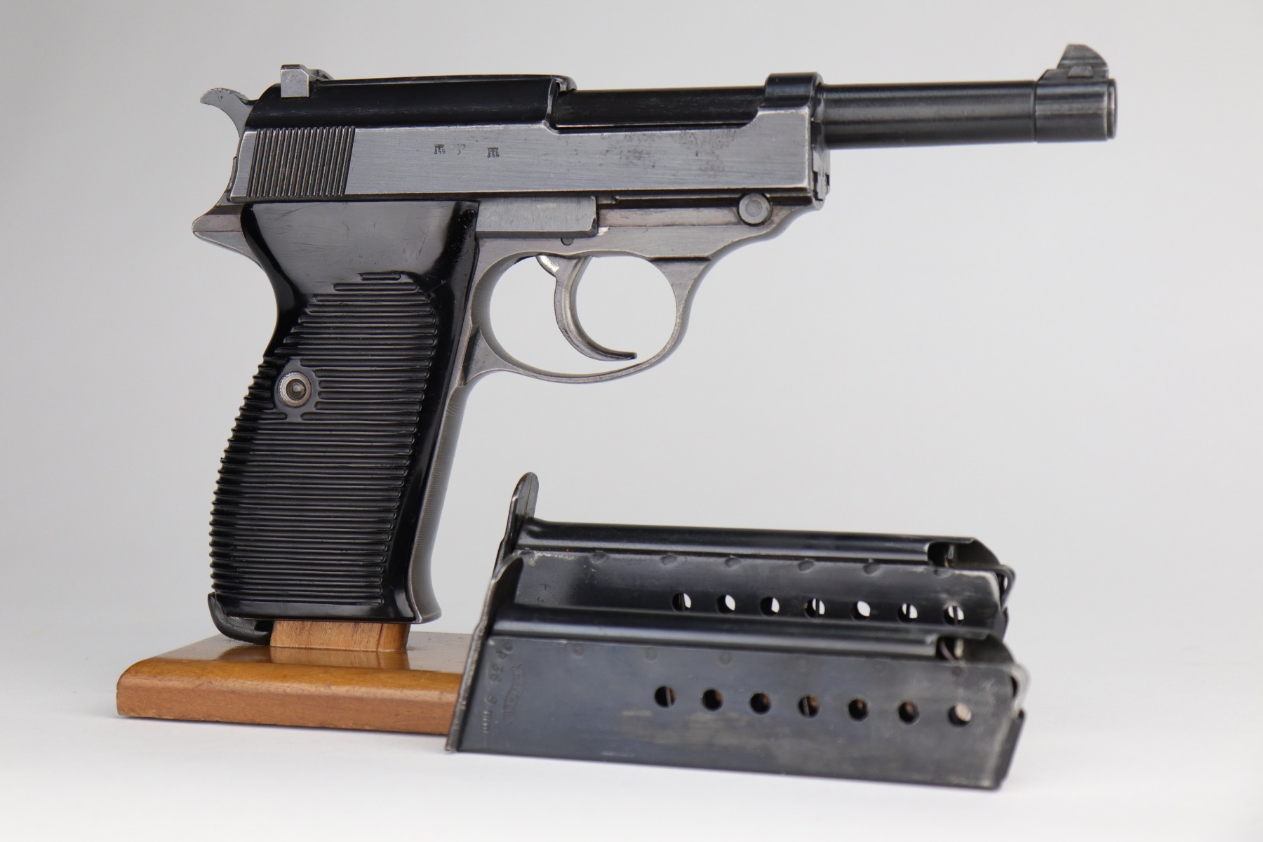 10/19/20 – This is an excellent example of a Walther P.38 rig, issued to the Nazi military in 1944. The rig comes with a minty, 1944-dated holster and two magazines. One of the magazines is period-correct, the other is post-war. The gun is all matching and has the proper “Eagle 359” Nazi military acceptance proofs. It is also fully functional, including the de-cocker. It has retained about 95-96% of its original bluing. There is minor muzzle wear, wear on the high edges of the slide, and thinning on the front strap, right side of the frame, and trigger guard. Some mild patina visible on the front strap. There are areas of spotty oxidation and pin-pricking on the webbing of the trigger guard and top plate. There is an area of minor pitting on the right side of the slide. Excellent, period-correct grips. The bore is very nice – strong rifling with some areas of minor freckling.