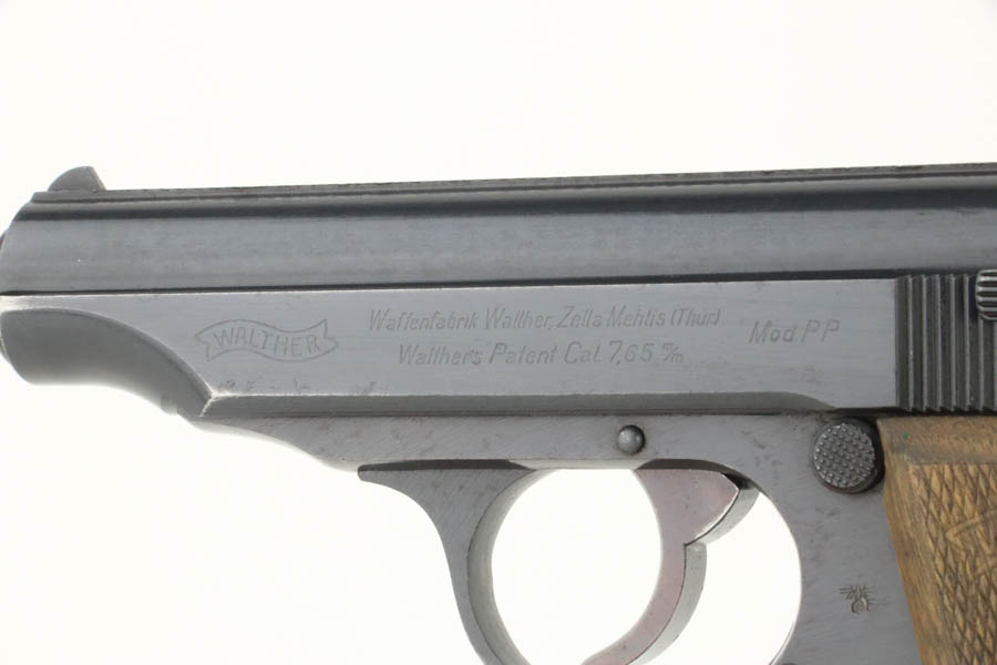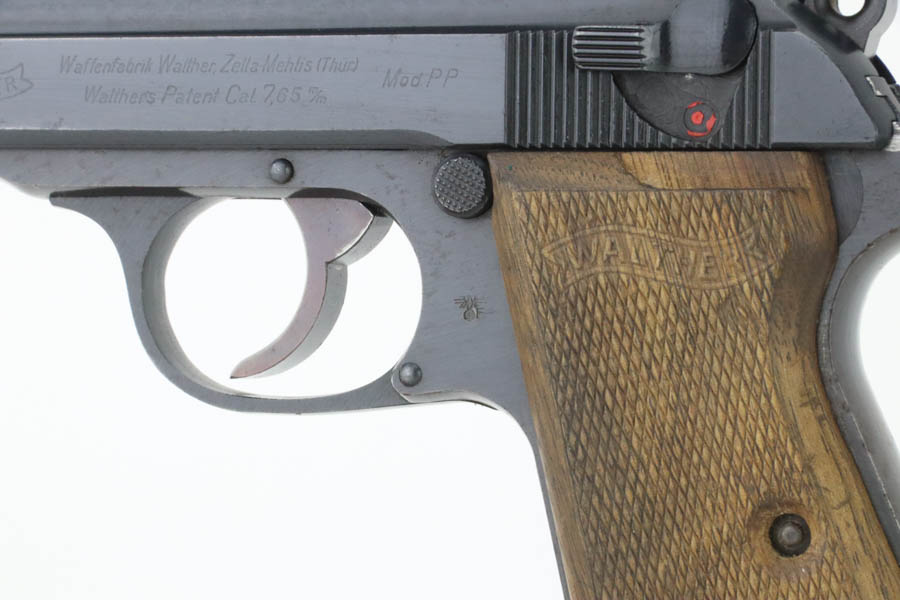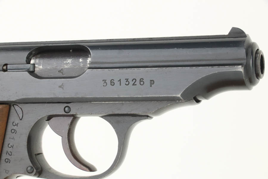 8/21/24 – For sale is an excellent condition Walther PP chambered in 7.65mm that was issued to the Nazi police force in 1944. It is all matching, and the left of the frame is stamped with Eagle/F. This gun is one of 5,000 issued to the police in this variation. The gun’s original wartime finish rates about 97%. There is a hint of muzzle wear with light brown patina and some light spotty oxidation on the grip straps. Fitted with a set of scarce, period-correct, late-war, wood grips. Comes with a proper wartime magazine. Near-mint bore.