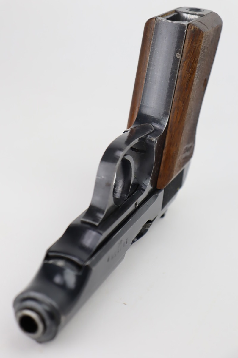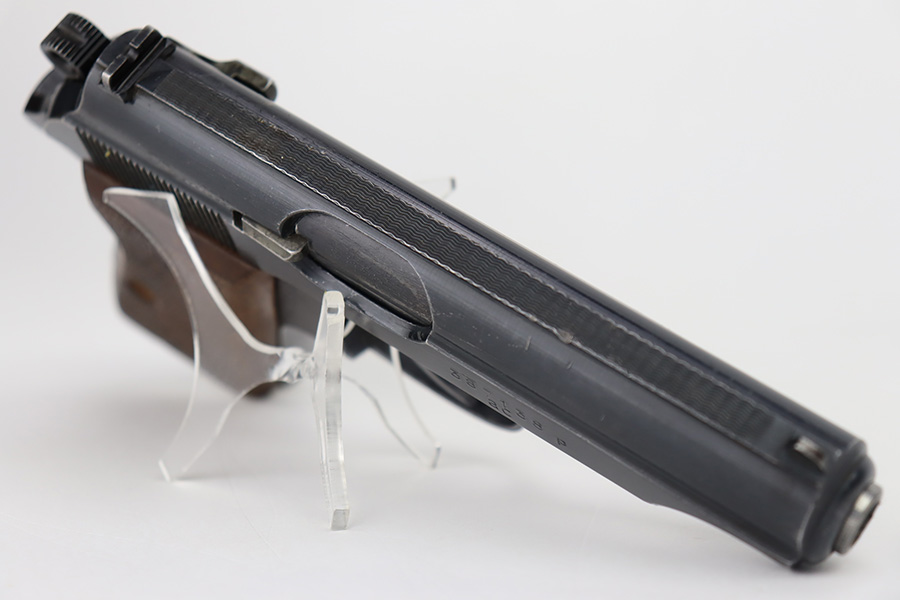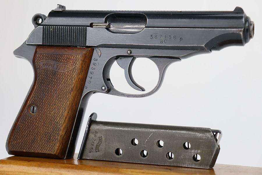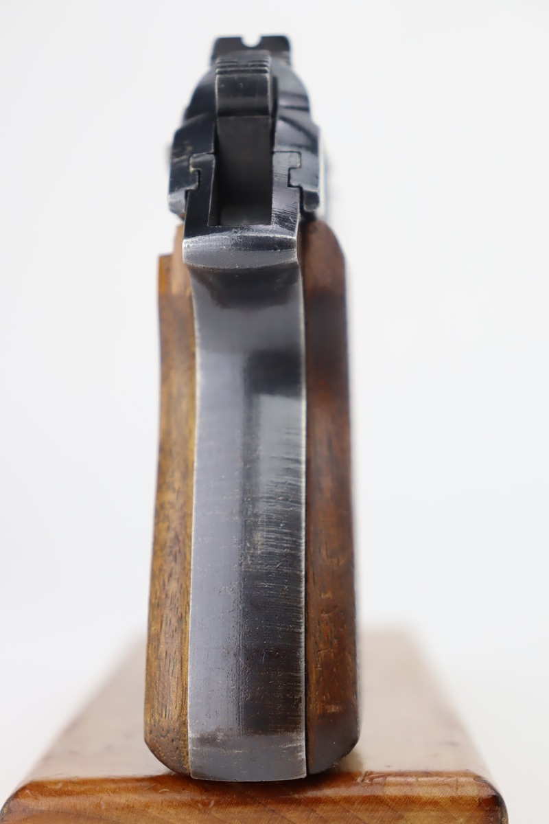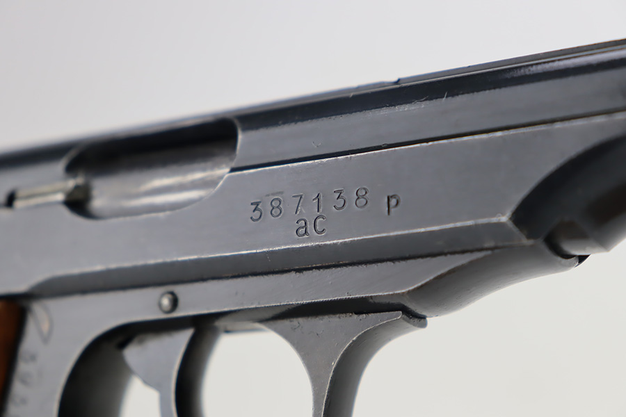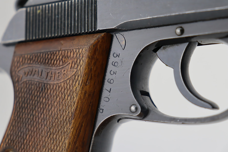 9/25/23 – This is an excellent example of a Walther PP manufactured at the end of the war in 1945. This is a GI mismatched gun put together by an American GI at the very end of the war. It has no proof marks, indicating it was never issued and never made it out of the Walther factory. It properly has no slide legend and has an “ac” Walther factory code on the right side of the slide. The gun itself has retained about 97% of its original finish with very minor wear around the muzzle and on the high edges of the slide. Some tiny scratches here and there on the slide. There looks to be a GI number scratched lightly into the frame under the left grip panel. The gun is fitted with excellent late-war wood grips and comes with a rare, end-of-war, phosphate “W” marked magazine. Near-mint bore.