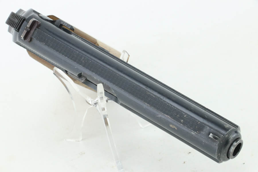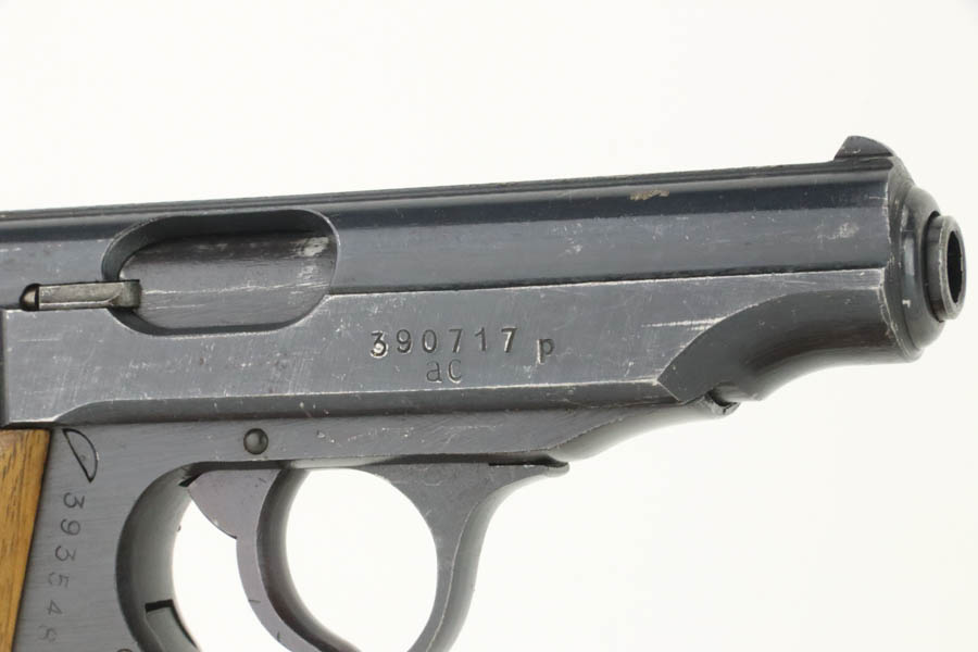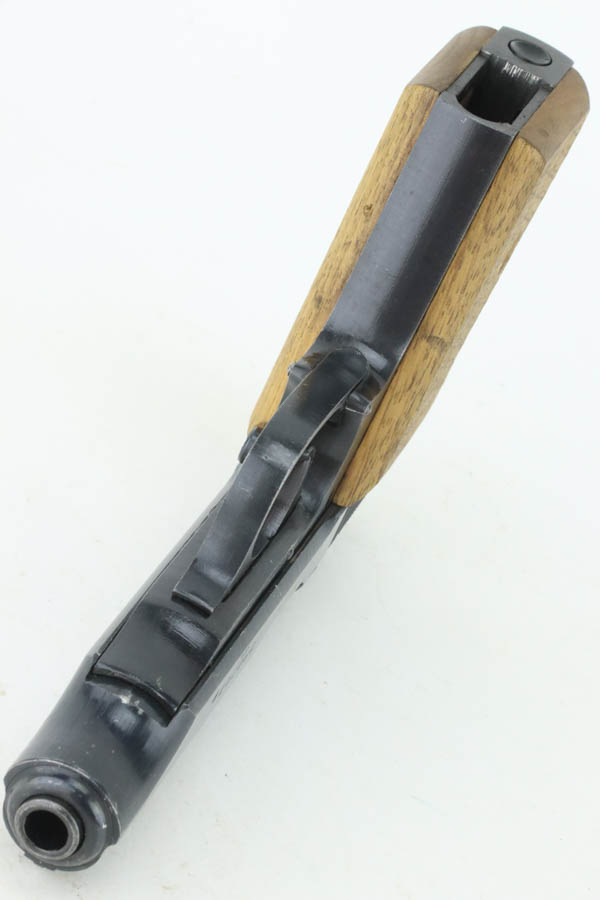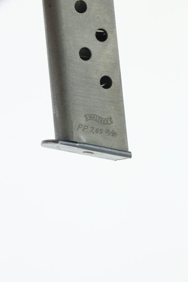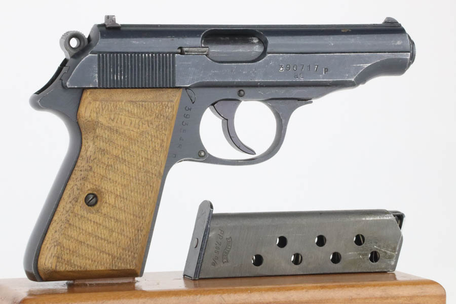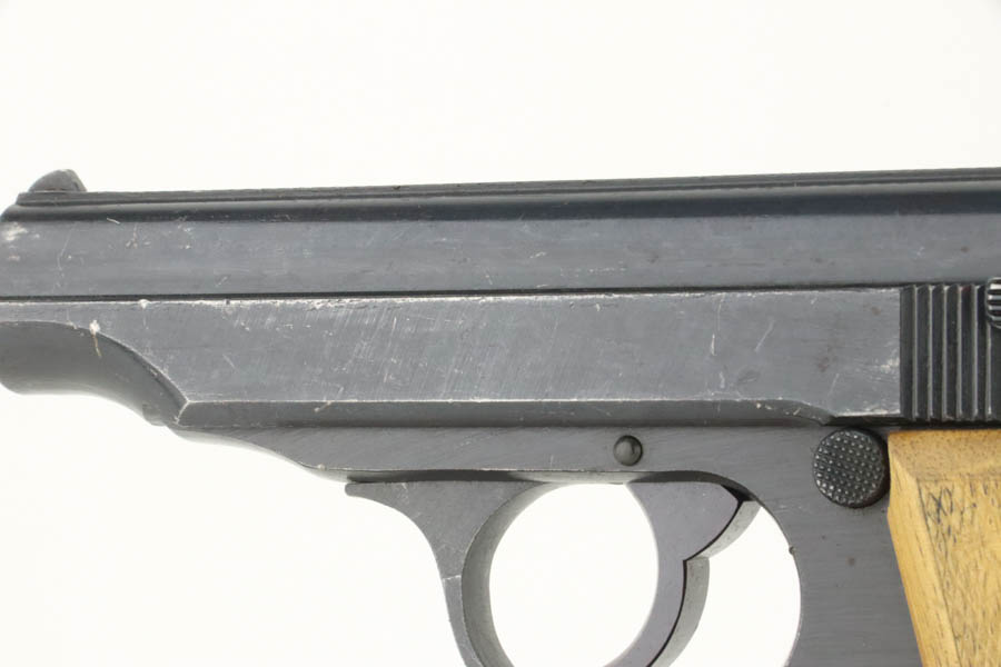 8/8/24 – This is an excellent example of a Walther PP manufactured at the end of the war in 1945. This is a GI mismatched gun put together by an American GI at the very end of the war. It has no proof marks, indicating it was never issued and never made it out of the Walther factory. It properly has no slide legend and has an “ac” Walther factory code on the right side of the slide. The gun itself has retained about 97% of its original finish with some tiny surface scratches and marks here and there on the slide. The gun is fitted with minty late-war wood grips and comes with a rare, end-of-war, phosphate “W” marked magazine. Excellent, shiny bore.