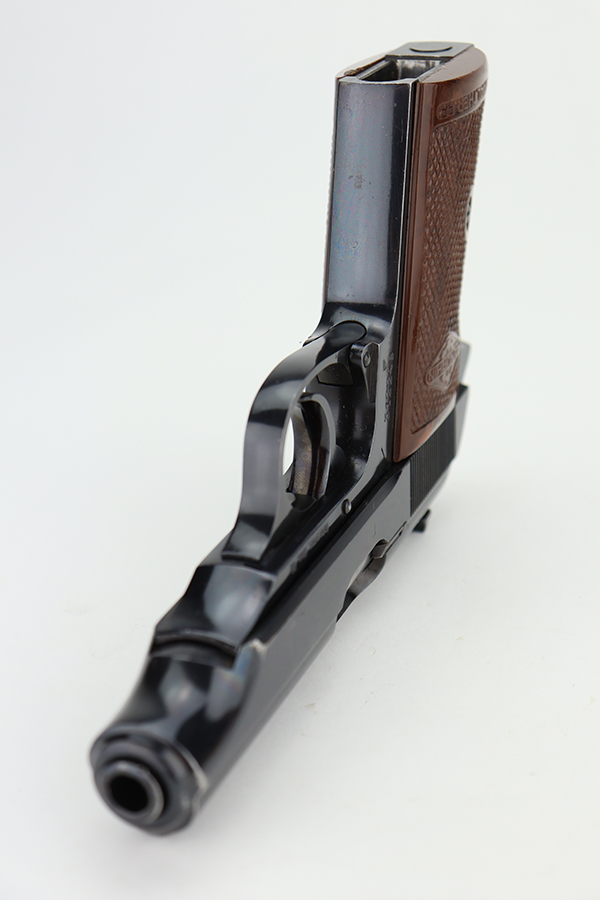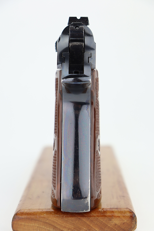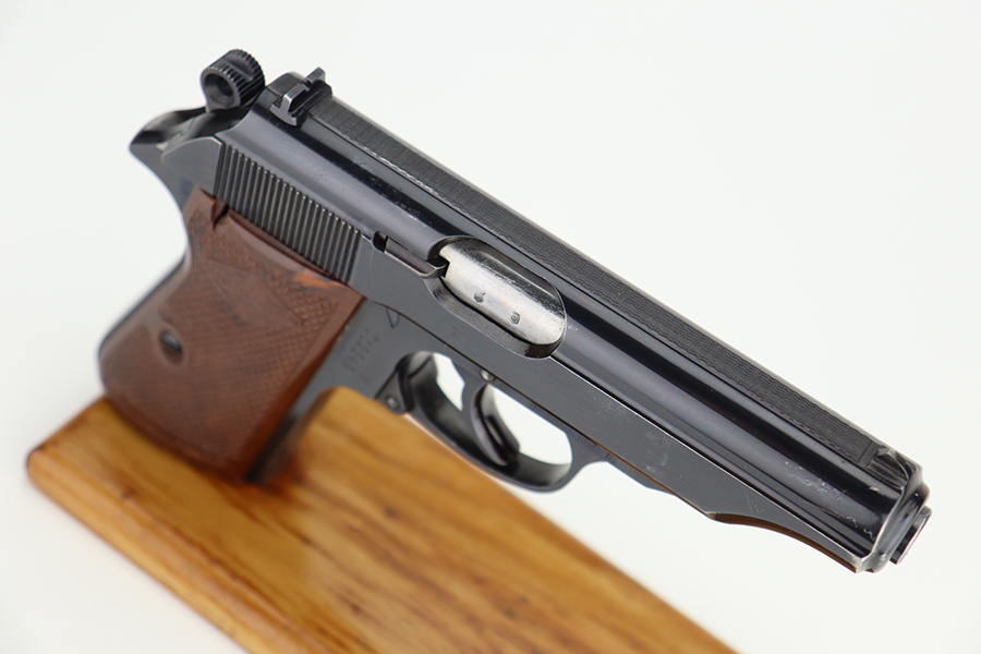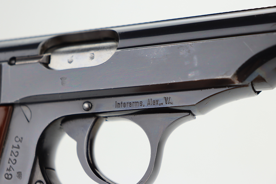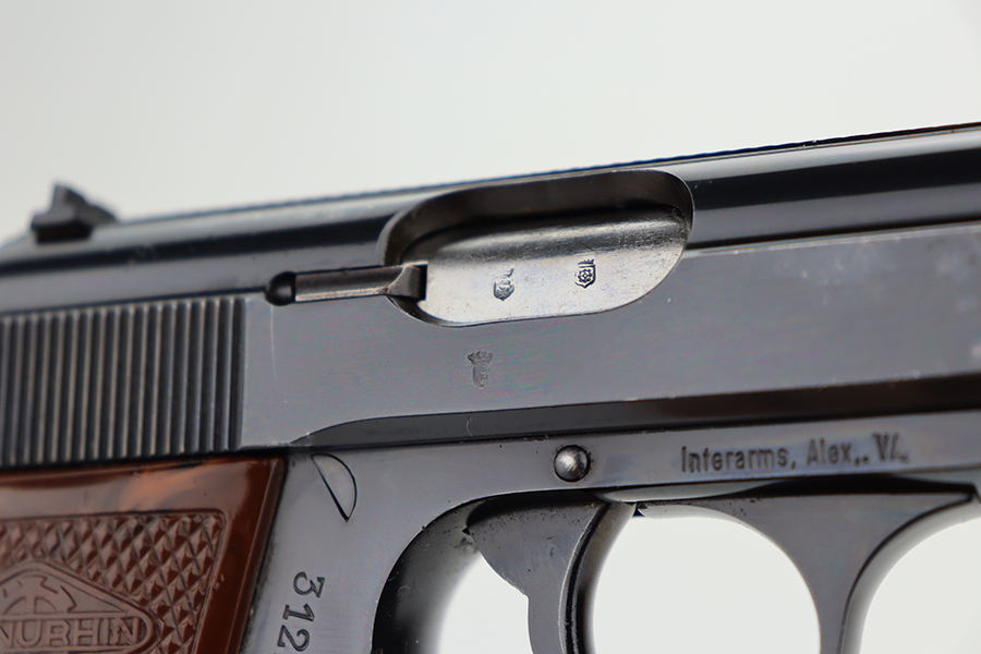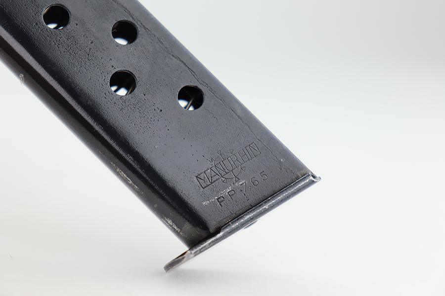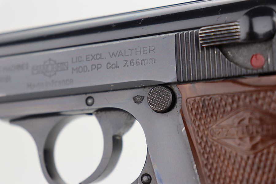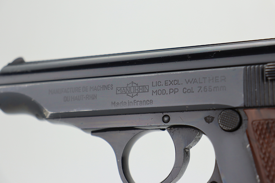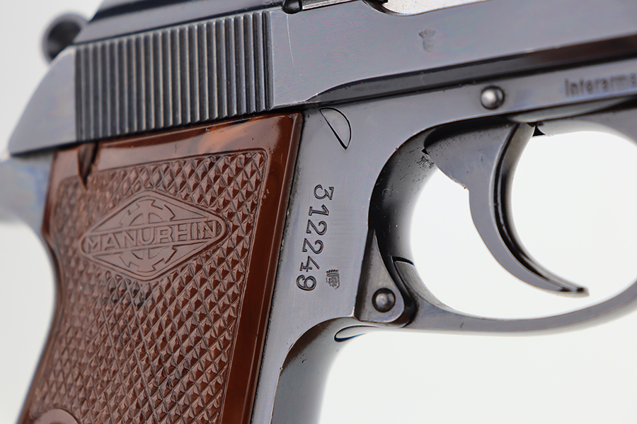 5/30/24 – This is a Walther PP made at the Manurhin Factory in France under license from Walther after WW2. Manurhin produced Walther PPs from the early 50s well into the 80s. This pistol falls within the serial block of production from 1961 to 85. The overall condition is excellent with minor wear towards the muzzle of the frame. Light surface scratches here and there. The pistol has matching serials on the frame and slide. Import mark on the frame. Fitted with reddish-brown plastic grips – small chip on the right side. Comes with a proper Manurhin magazine. Mint bore.