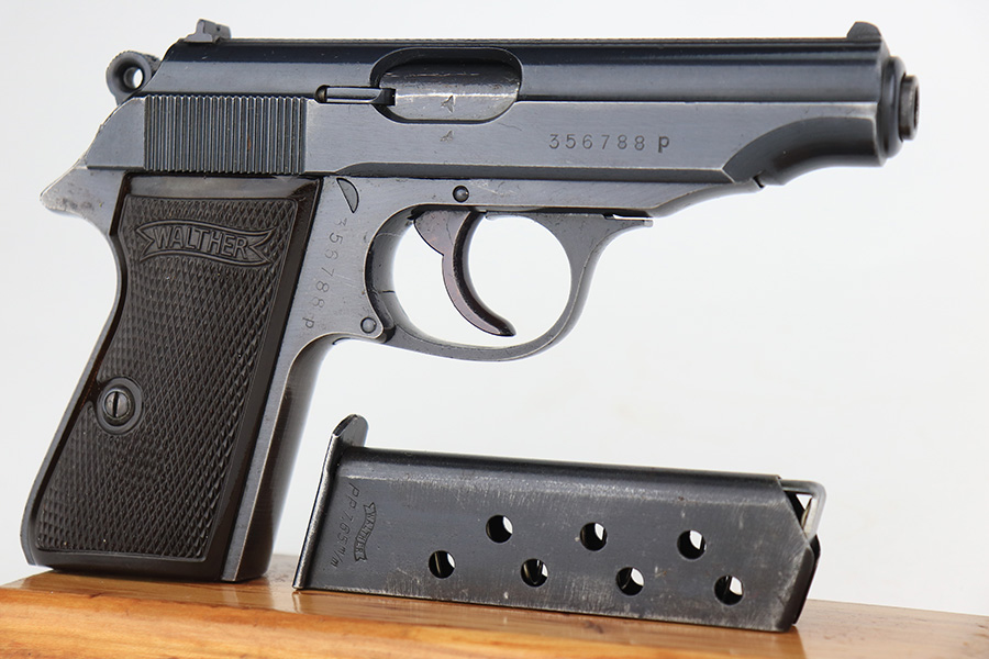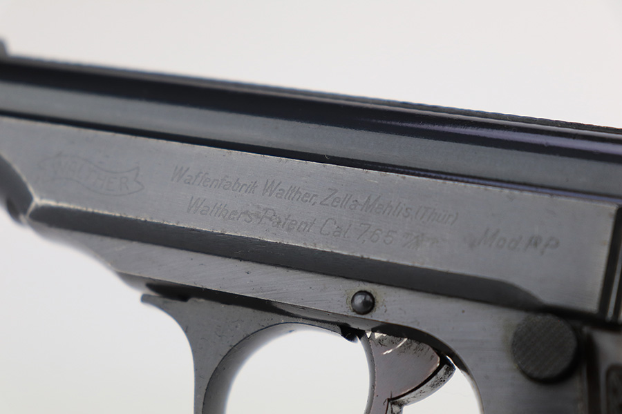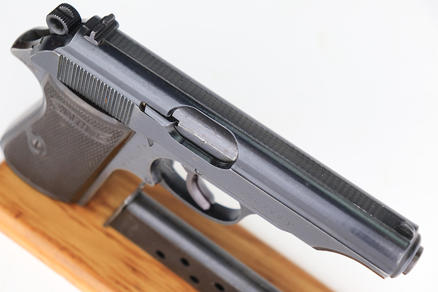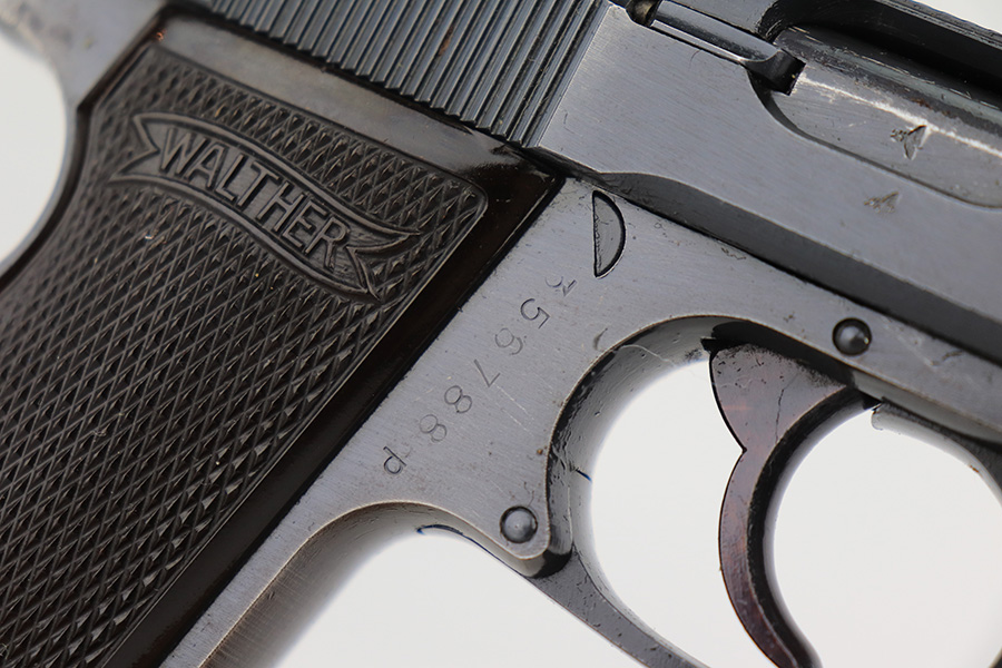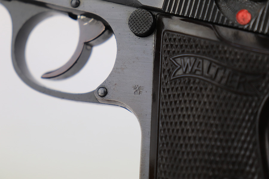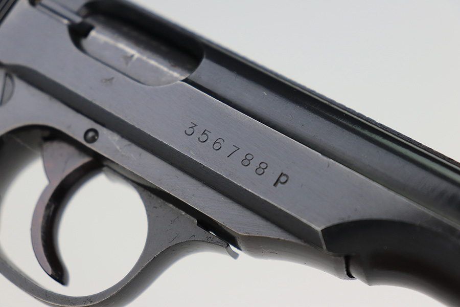 1/9/24 – This is an excellent example of a scarce late-war Walther PP issued to the Nazi police in 1944. It is all matching and has the proper police “Eagle F” proof. This police “Eagle F” variation is scarce as only about 5,000 were made. This gun also comes with scarce brownish bakelite grips. It has retained about 97% of its original finish with minor thinning on the grip straps. Mint bore. Excellent grips. Comes with a period-correct magazine.
