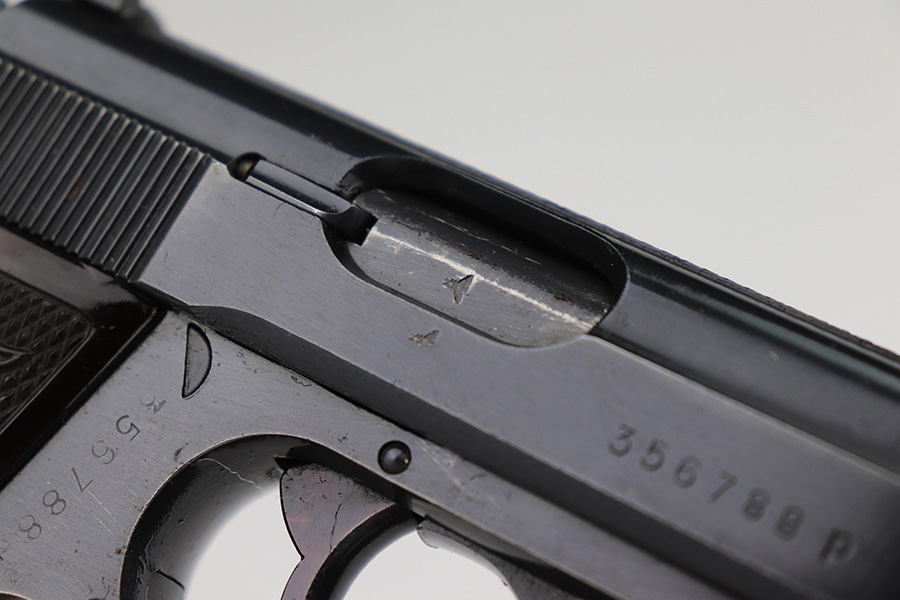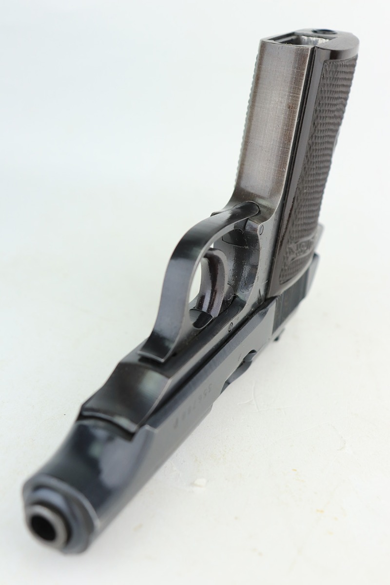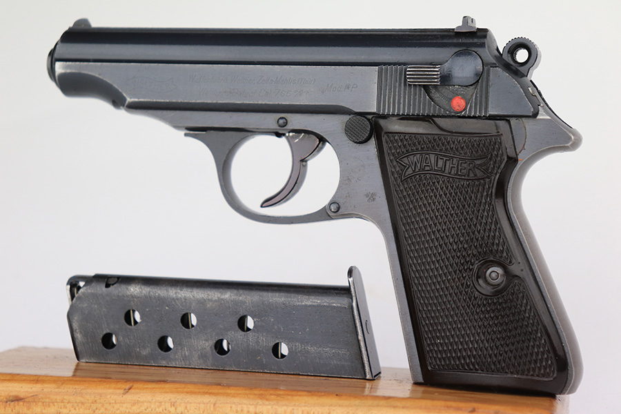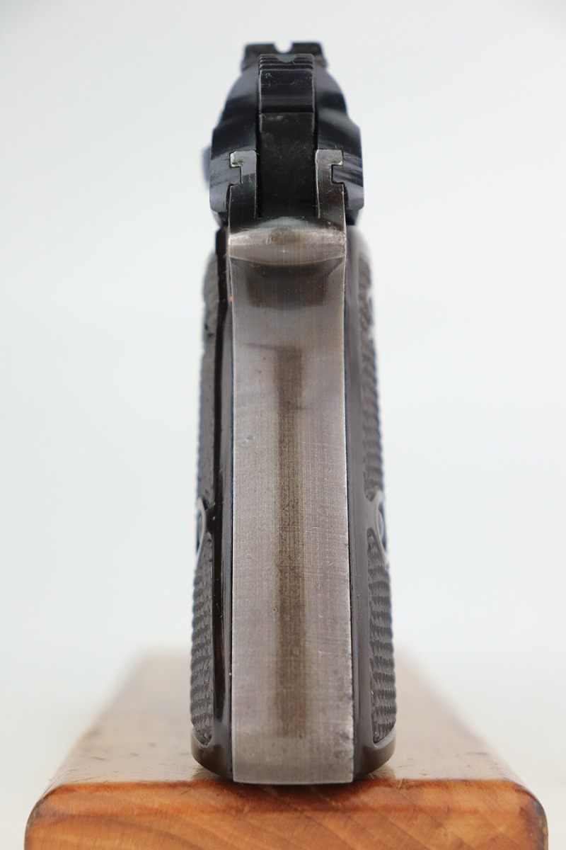 1/9/24 – This is an excellent example of a scarce late-war Walther PP issued to the Nazi police in 1944. It is all matching and has the proper police “Eagle F” proof. This police “Eagle F” variation is scarce as only about 5,000 were made. This gun also comes with scarce brownish bakelite grips. It has retained about 97% of its original finish with minor thinning on the grip straps. Mint bore. Excellent grips. Comes with a period-correct magazine.