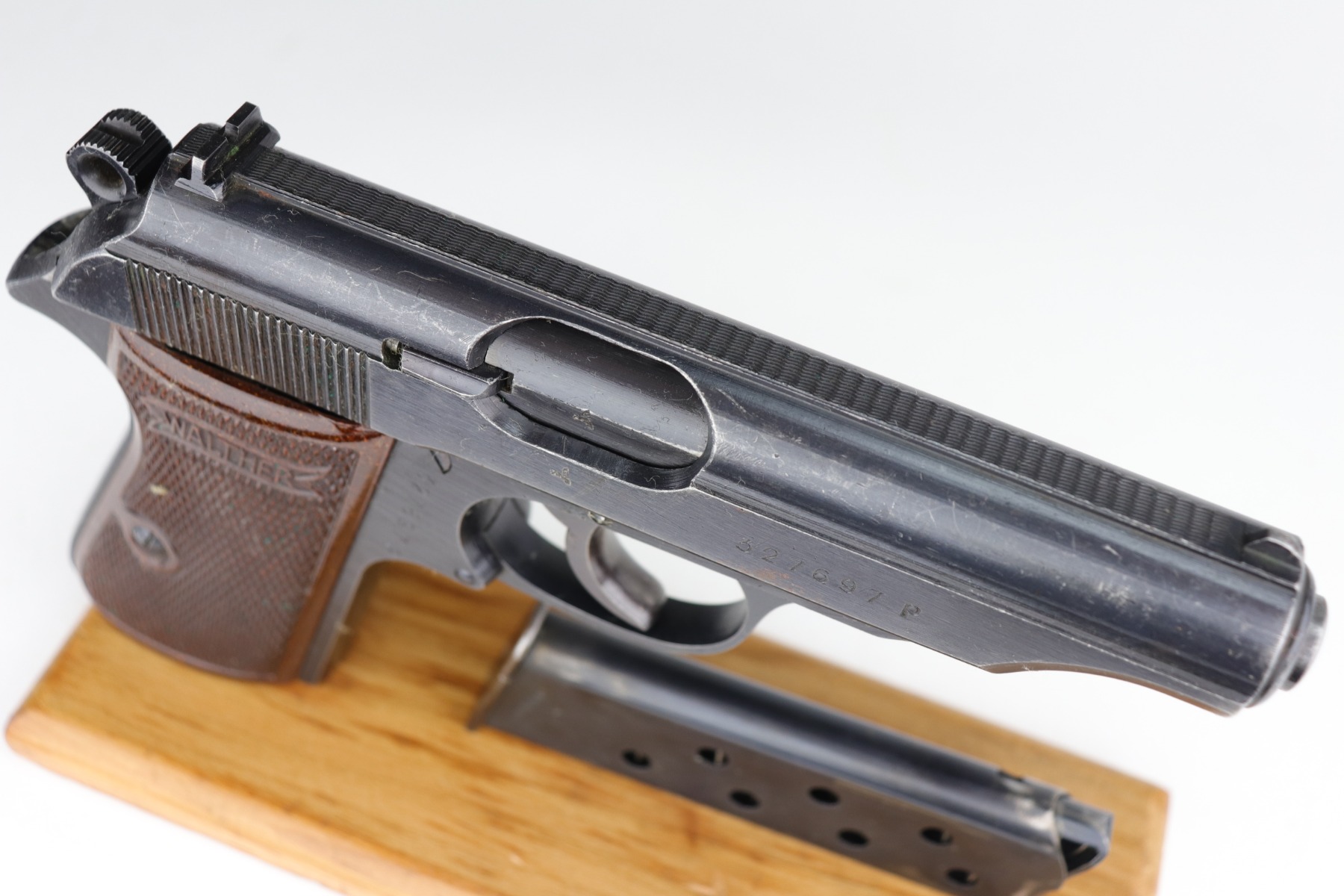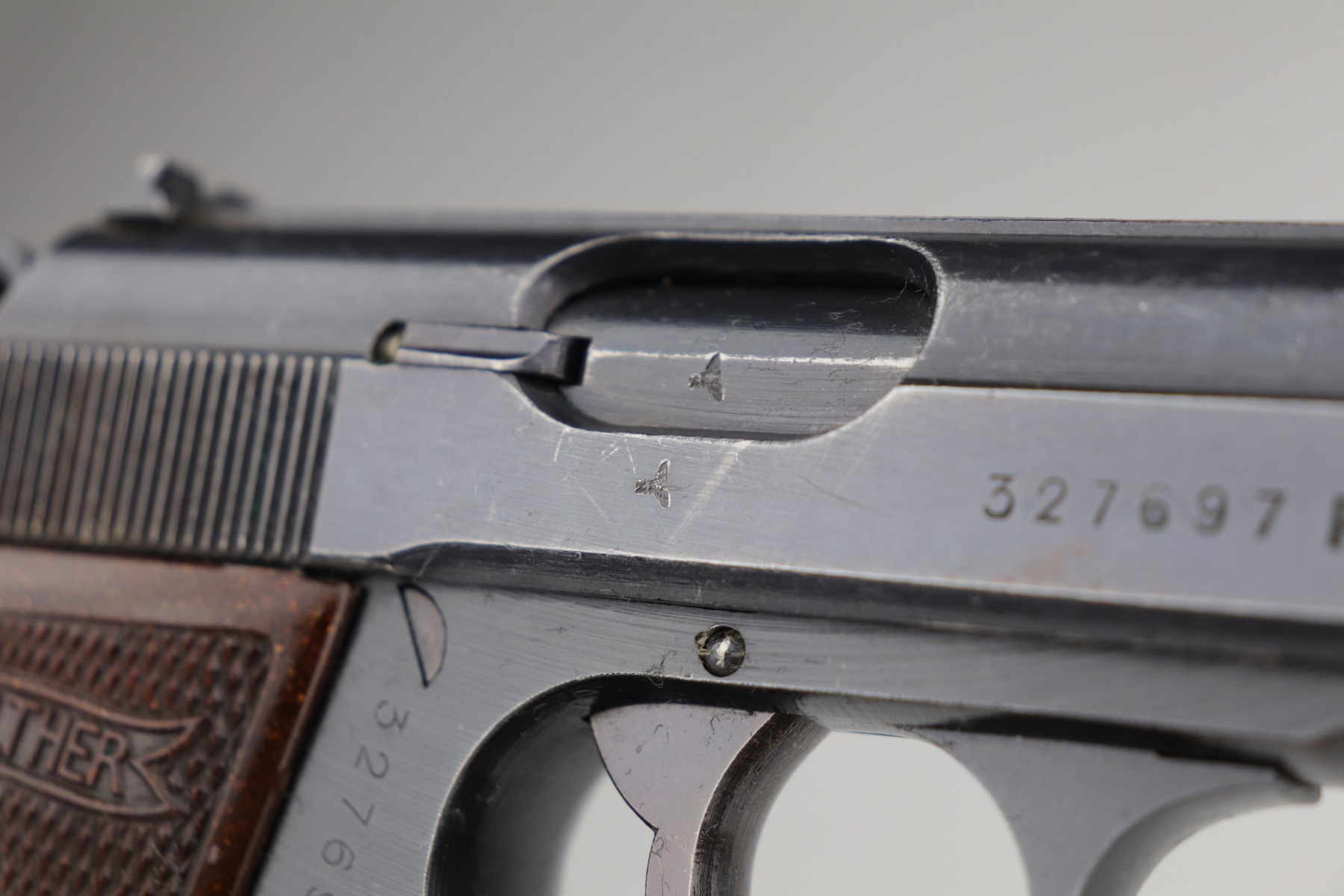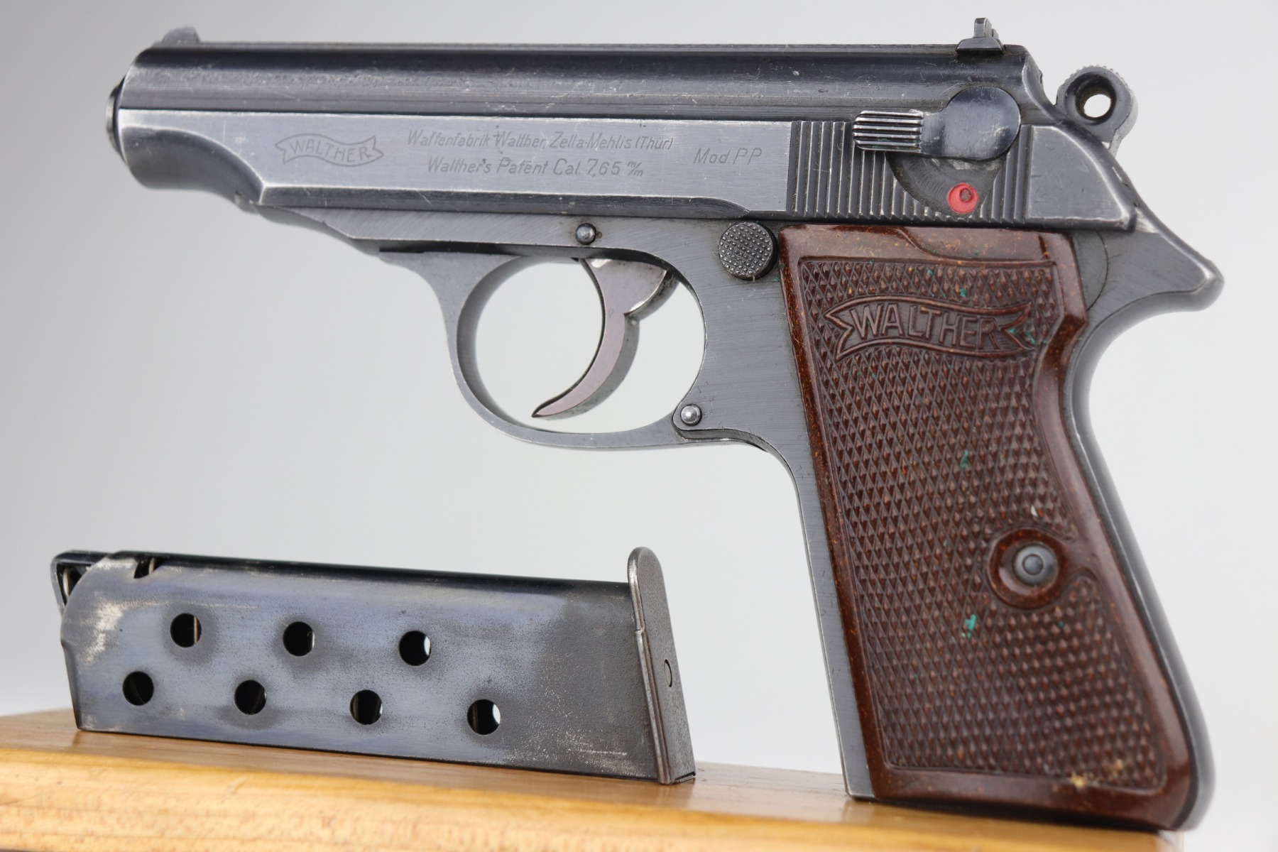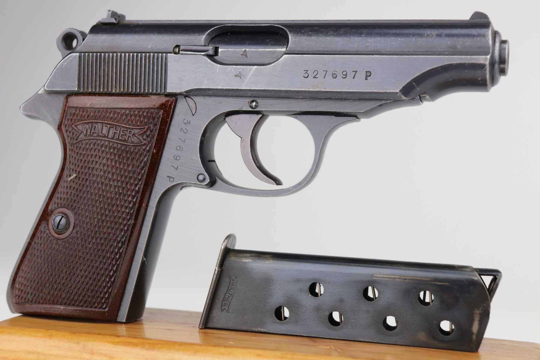 1/12/21 – This is an excellent example of a Walther PP sold in the commercial market in 1944. It is all matching and has the proper “Eagle N” proofs. It also has a pair of rare red Walther grips. It has retained about 97% of its original finish. There is minor wear around the muzzle, some scratching near the ejection port, and tiny handling marks throughout. The grips are excellent. Comes with a Walther banner magazine. The bore is excellent – shiny with strong rifling. Just some light freckling in the grooves.