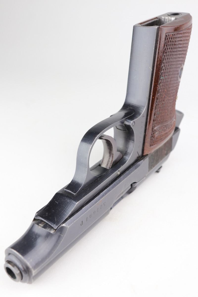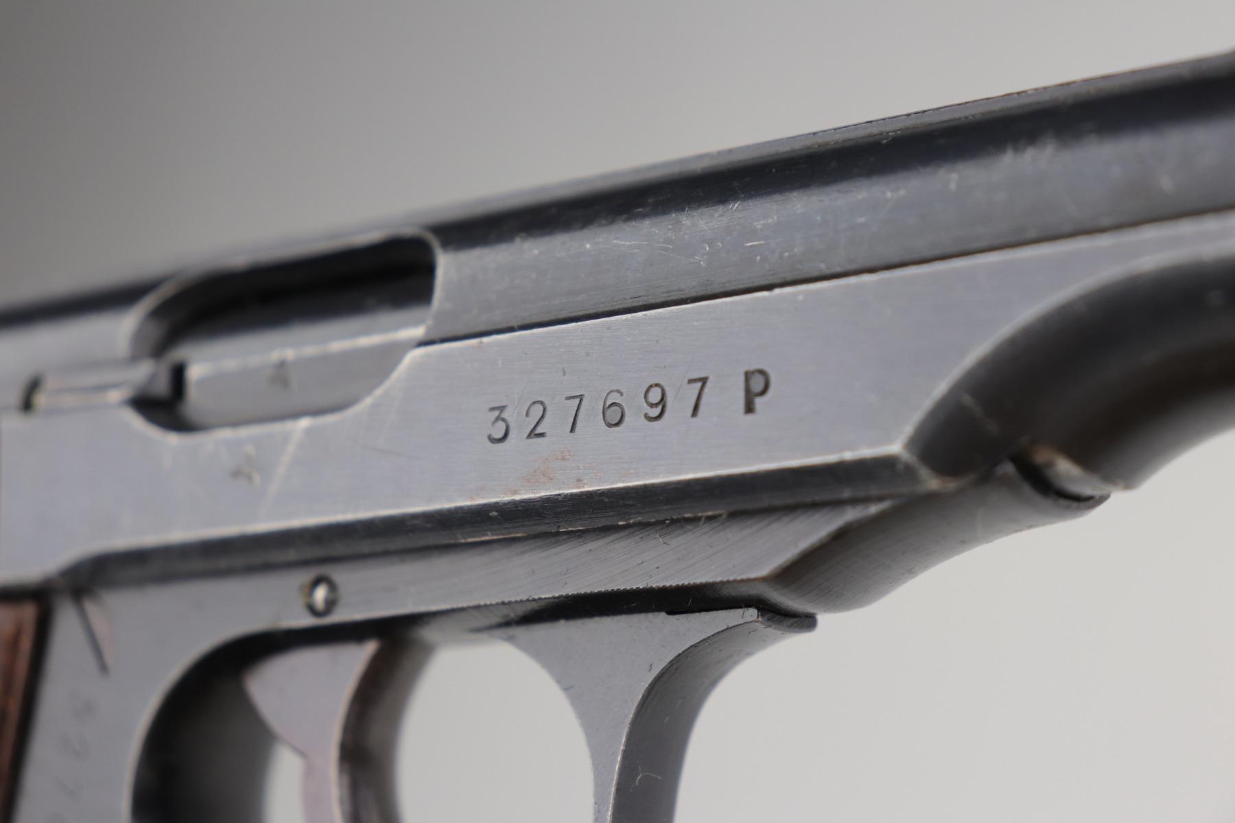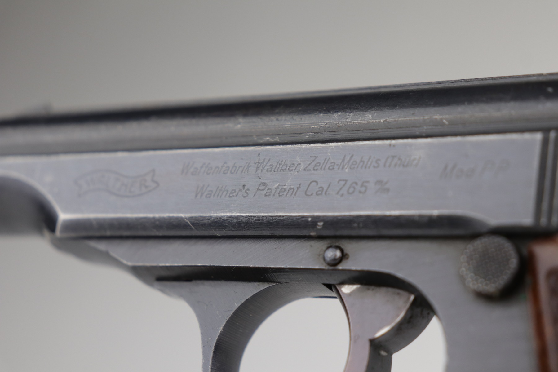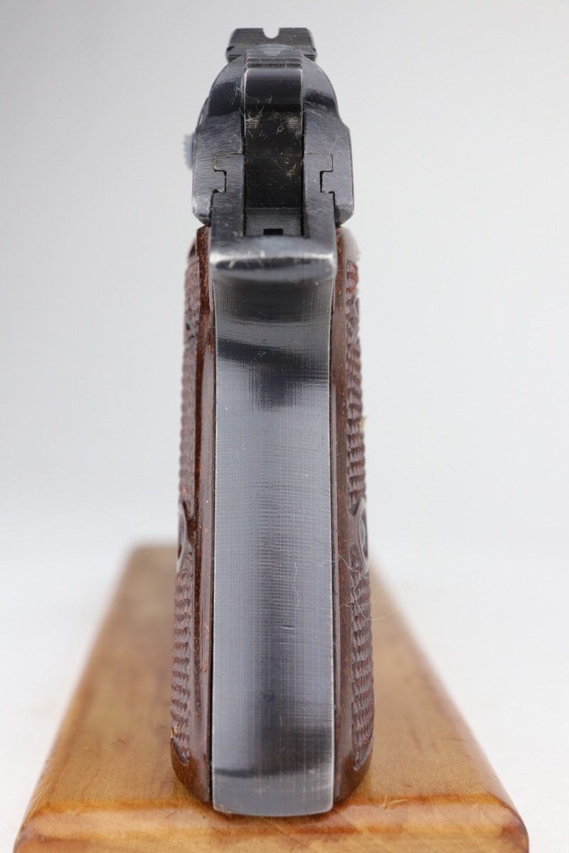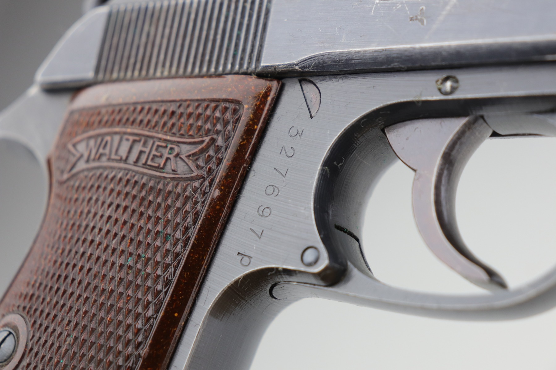 1/12/21 – This is an excellent example of a Walther PP sold in the commercial market in 1944. It is all matching and has the proper “Eagle N” proofs. It also has a pair of rare red Walther grips. It has retained about 97% of its original finish. There is minor wear around the muzzle, some scratching near the ejection port, and tiny handling marks throughout. The grips are excellent. Comes with a Walther banner magazine. The bore is excellent – shiny with strong rifling. Just some light freckling in the grooves.