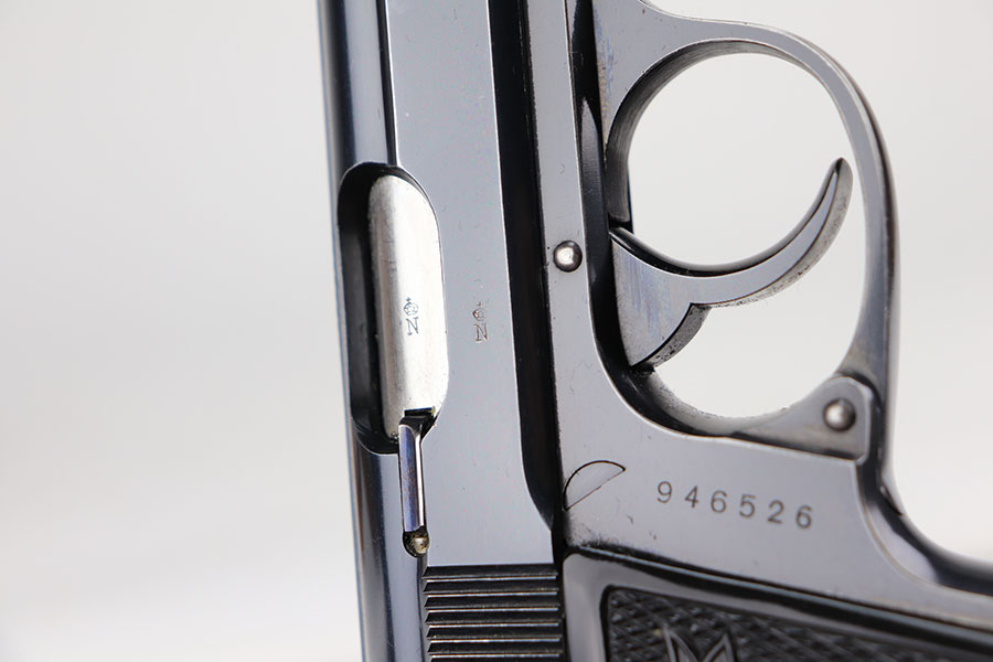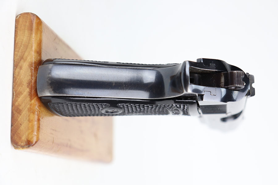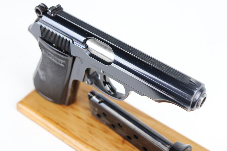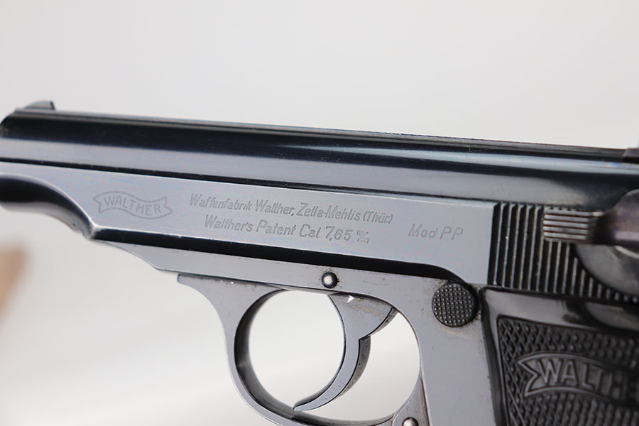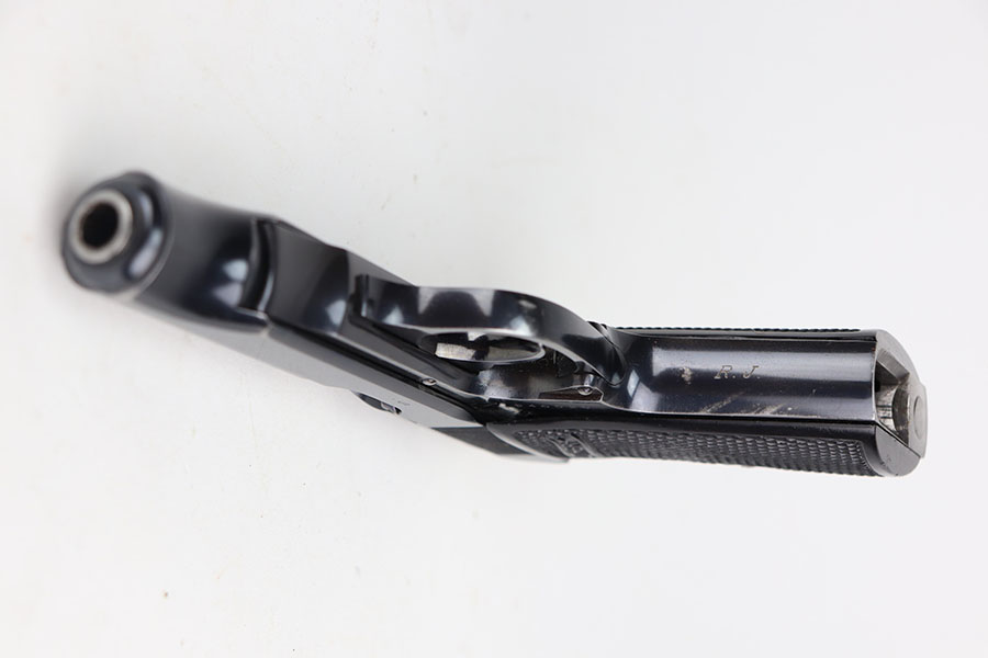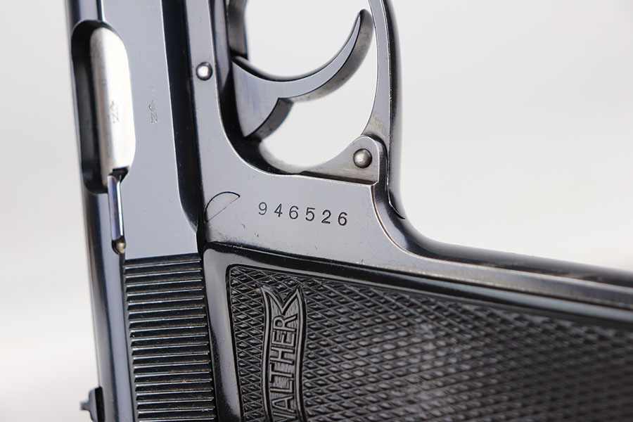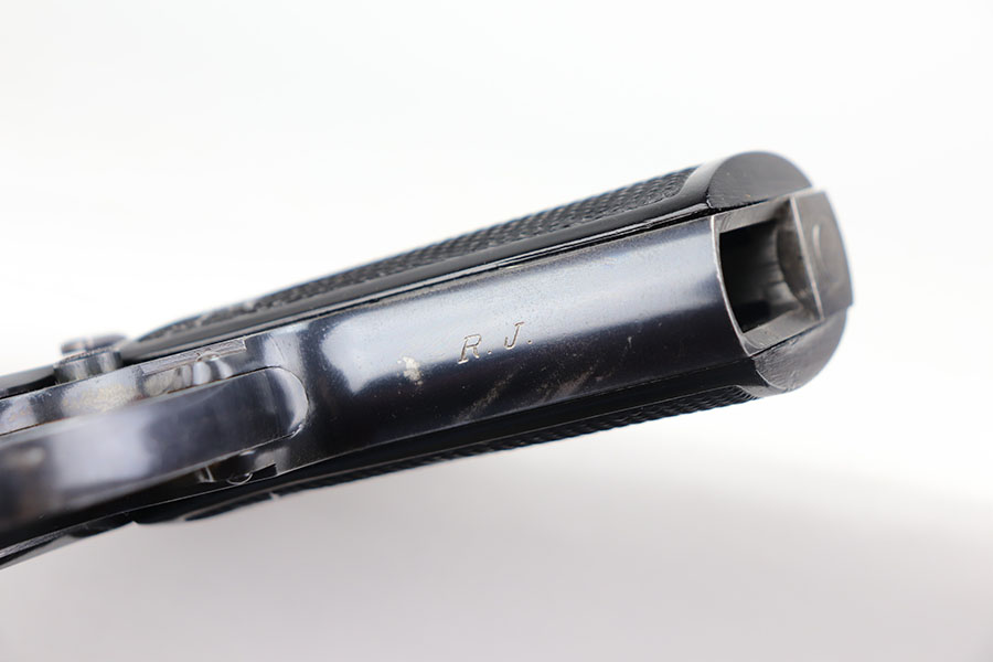 7/8/21 – This is an excellent example of an “RJ” marked Walther PP, manufactured in late 1936 or early 1937. The “RJ” on the front strap indicates that this particular gun was issued to the Reich’s Justice Department during WW2. This one is all original and has retained about 94-95% of its original, high-polish finish. Minor muzzle wear on either side of the slide, and a little more finish loss on both straps. Excellent profile view overall. Strong, shiny bore with minor signs of use. Excellent finger extension magazine. Minty grips with no cracks or chips.