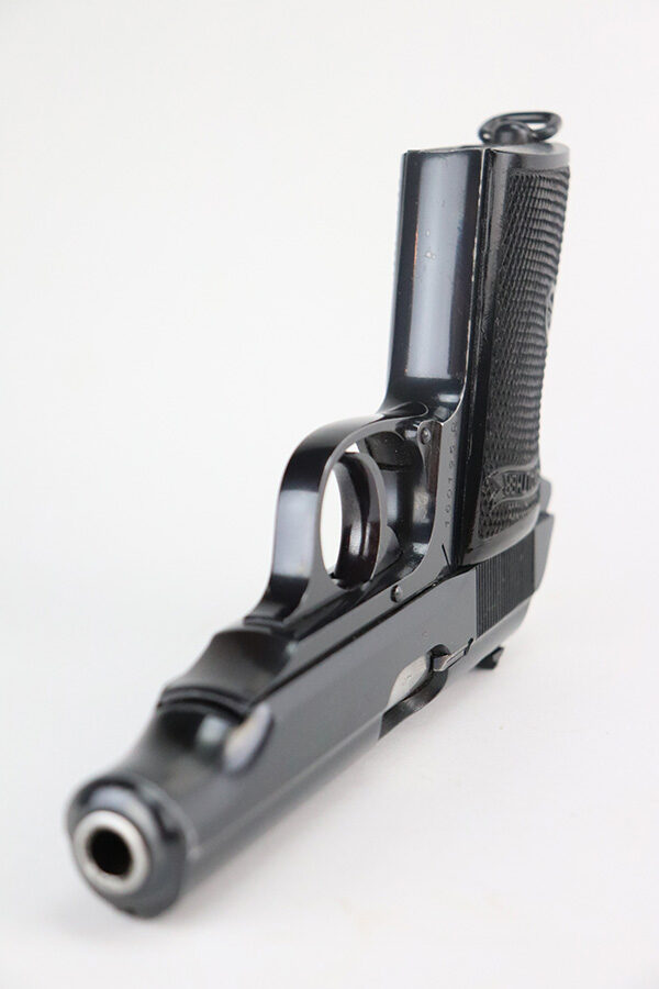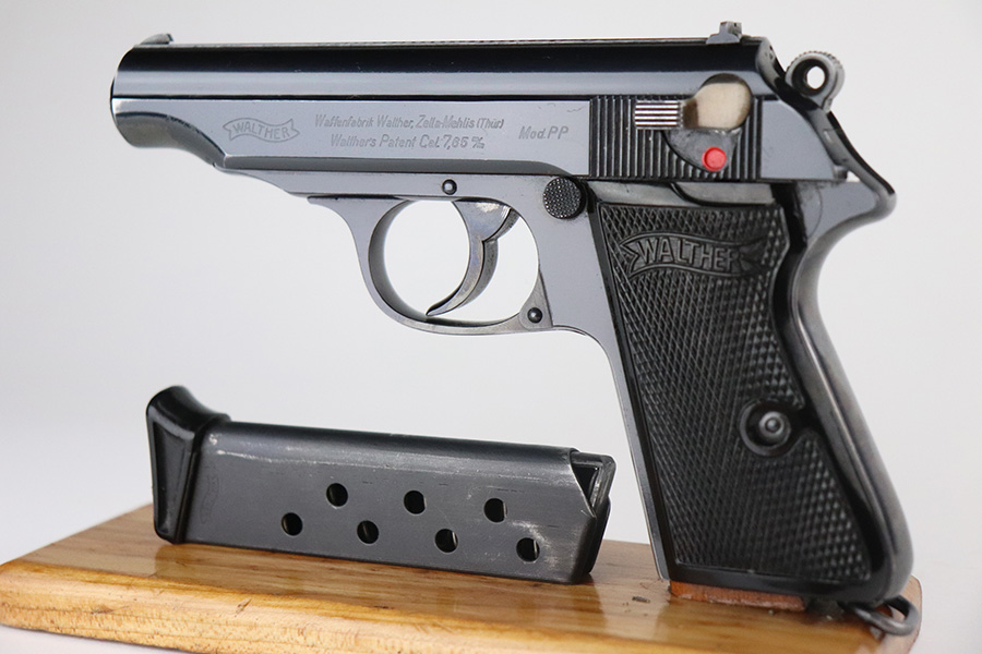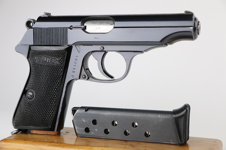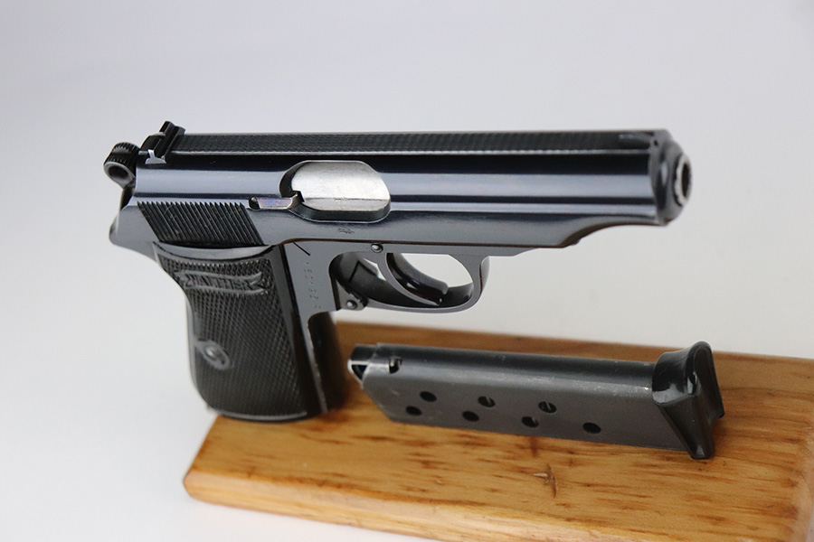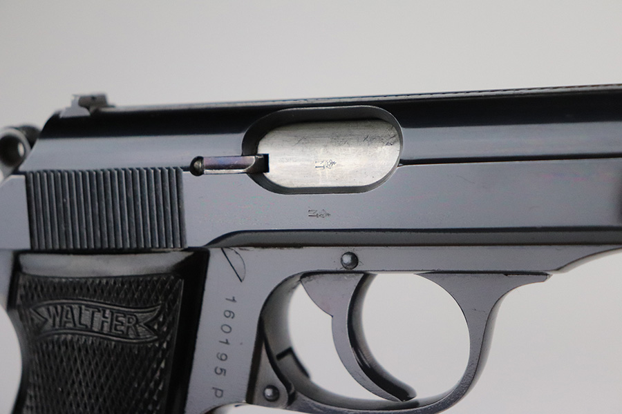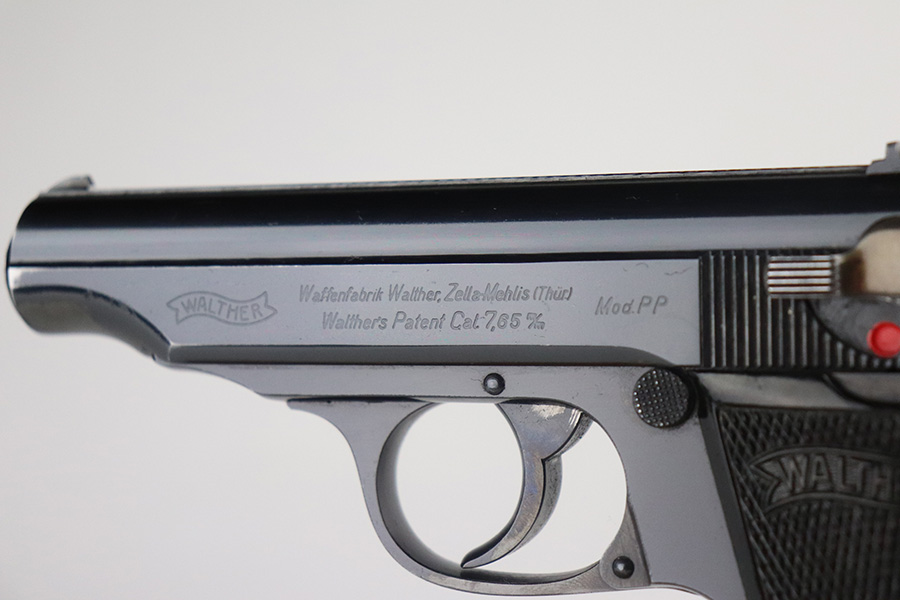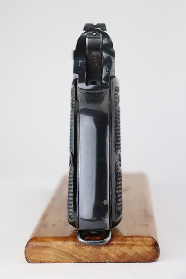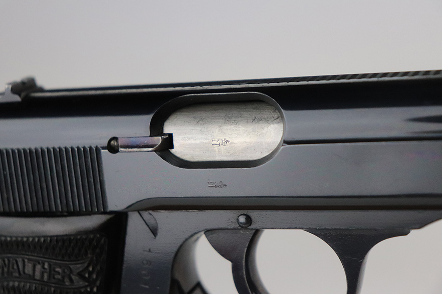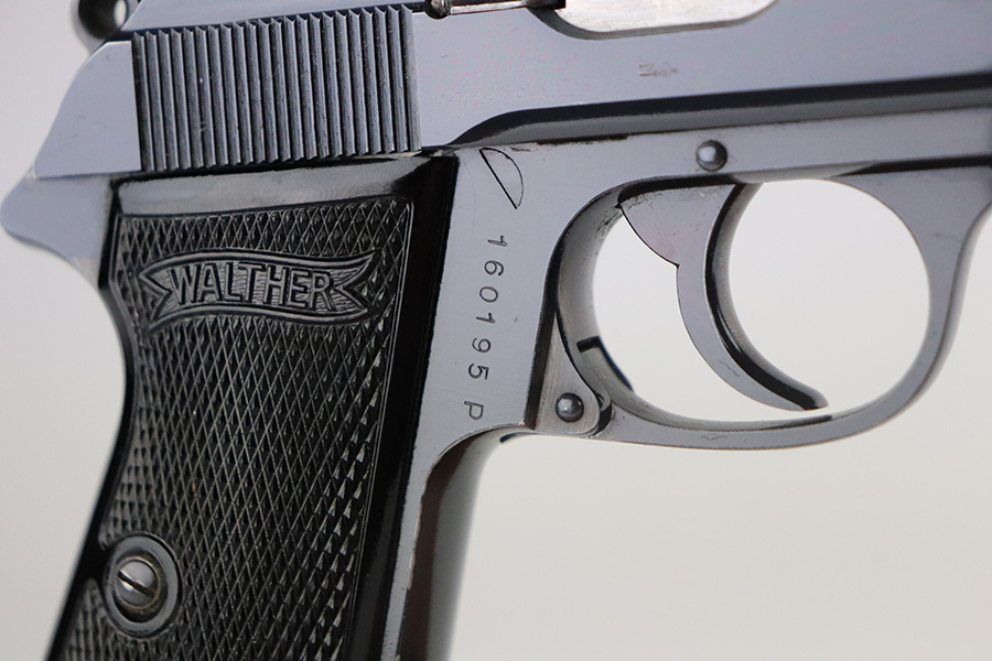 7/8/21 – This is an excellent example of a Walther PP manufactured in 1939-40. The gun is all matching and has the proper “Crown N” proofs. This is right before they made the transition to the “Eagle N” proofs. It has a factory-installed lanyard ring, indicating it was apart of the Swedish Police contract. It has retained about 98% of its high polish finish. There is a hint of wear around the muzzle, some small dots of discoloration on the straps, a few very tiny handling marks on the straps, and hints of wear along the high edges of the frame. Comes with excellent grips and a Walther banner-only finger extension magazine. The bore is excellent – shiny with strong rifling and very minor frosting in the grooves.