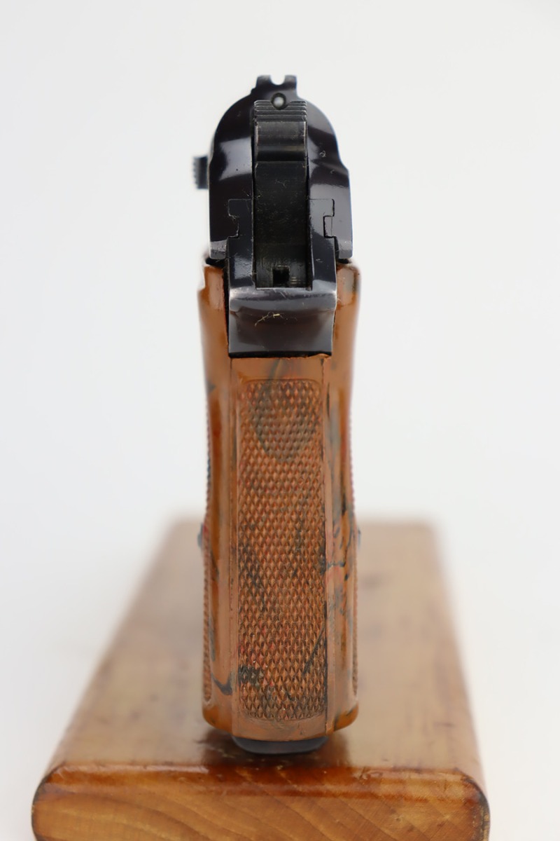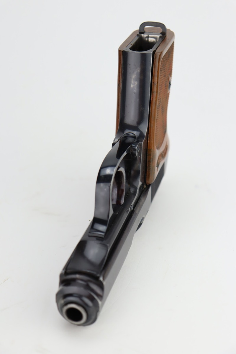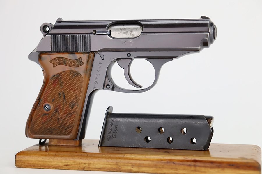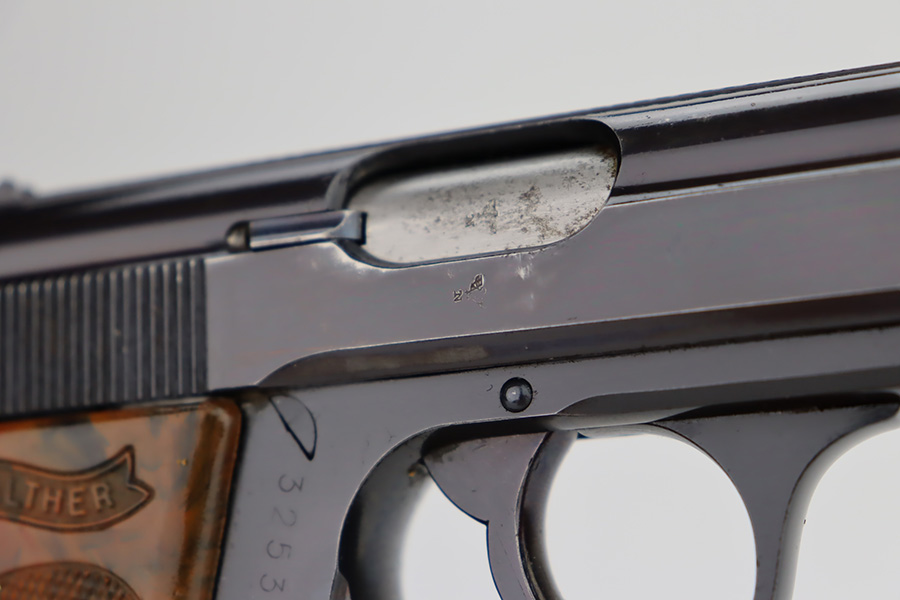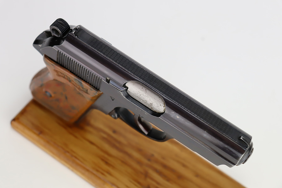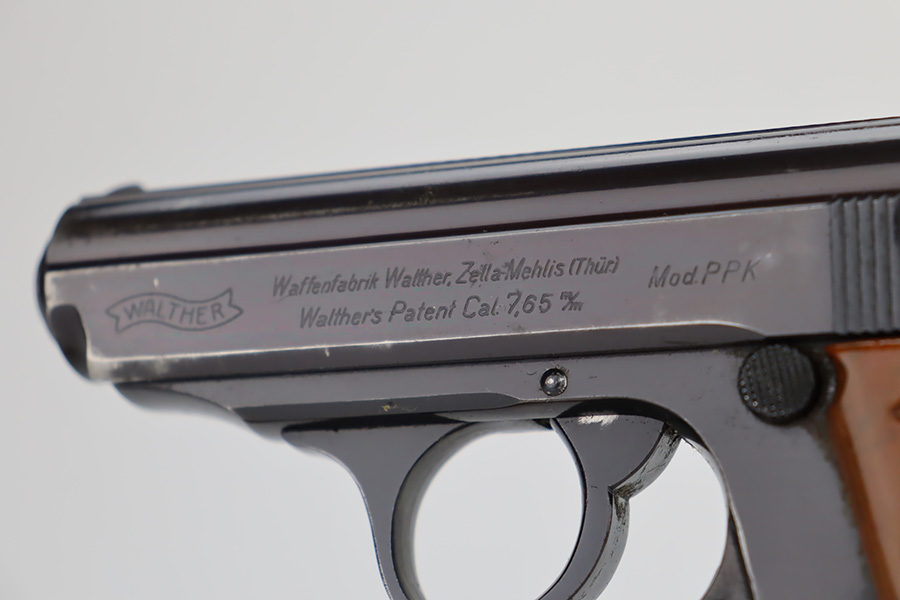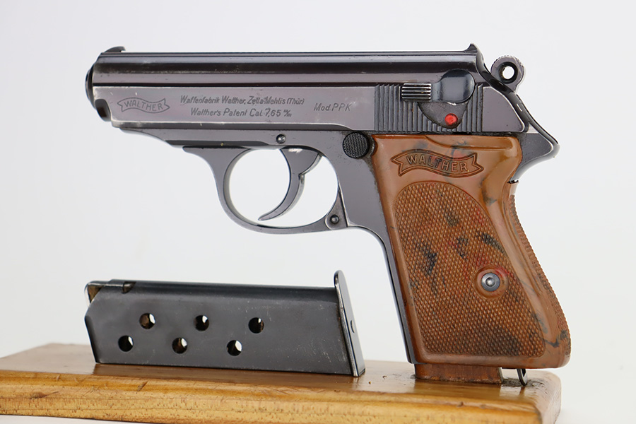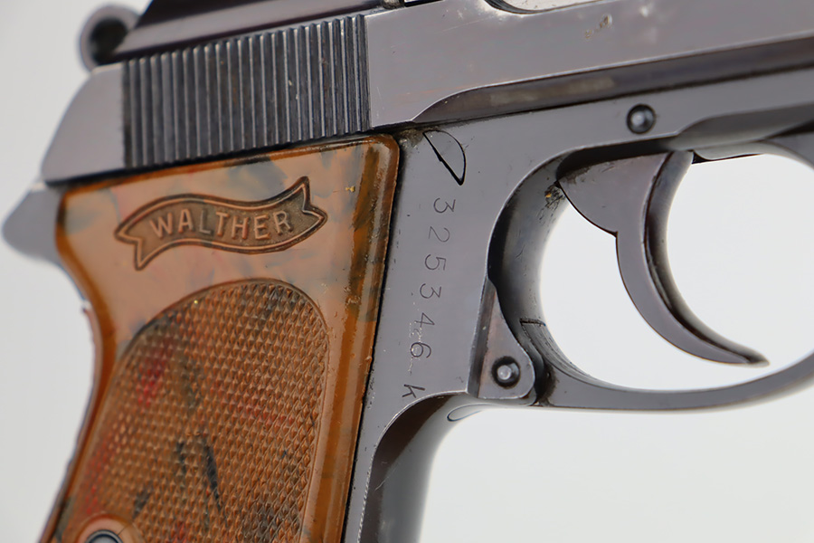 11/29/23 – This is an excellent example of a WW2 era Walther PPK. Comes in .32 caliber or 7.65mm. It was most likely made in early 1942, as it still has the high polish finish with Eagle N proofs on the frame, barrel and slide. The 3 digits are correctly inscribed inside the slide. Comes with a correct wartime magazine and the classic PPK, one piece grips, that are excellent. The bore is shiny and rates about 9 out of 10. The original finish rates about 96%. Fully functional. A great example of a collectible, Nazi era PPK.