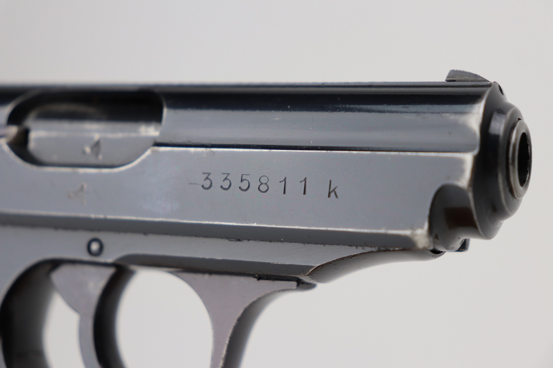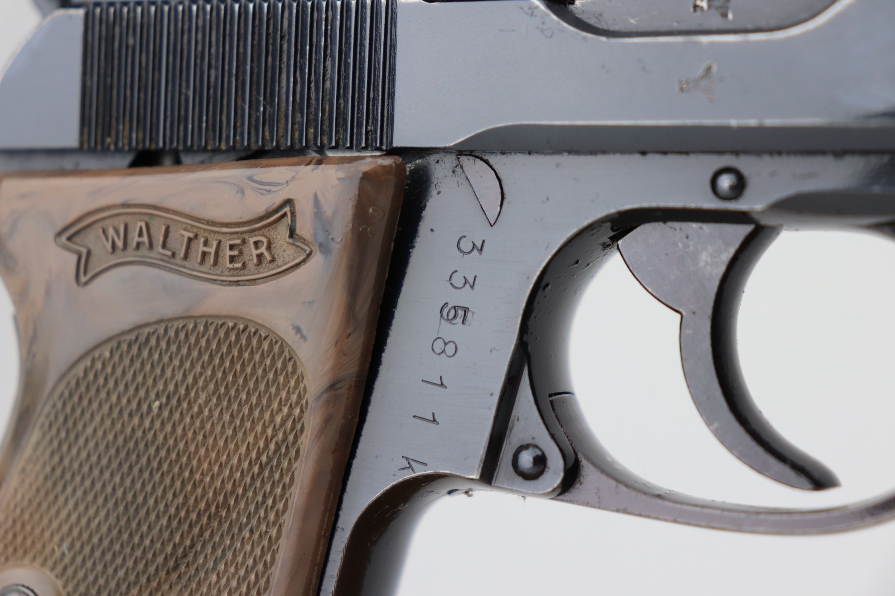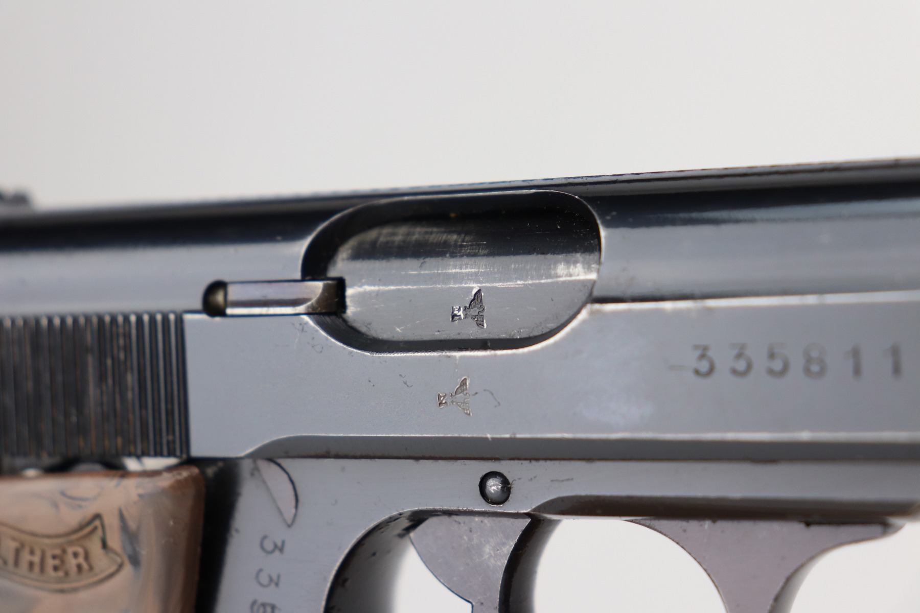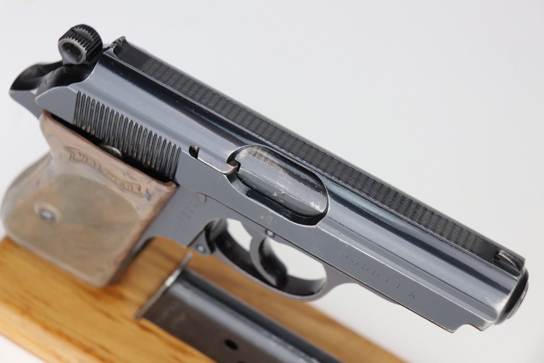4/6/21 – This is an excellent example of a Walther PPK sold in the commercial market in 1941. It is all matching and has proper “Eagle N” proofs. This one comes with an excellent gray-colored grip. It has retained about 96% of its original finish. There is minor wear around the muzzle and high edges of the slide. Tiny dots of oxidation on the left side of the slide. Comes with a wartime magazine. The bore is excellent – shiny with strong rifling.