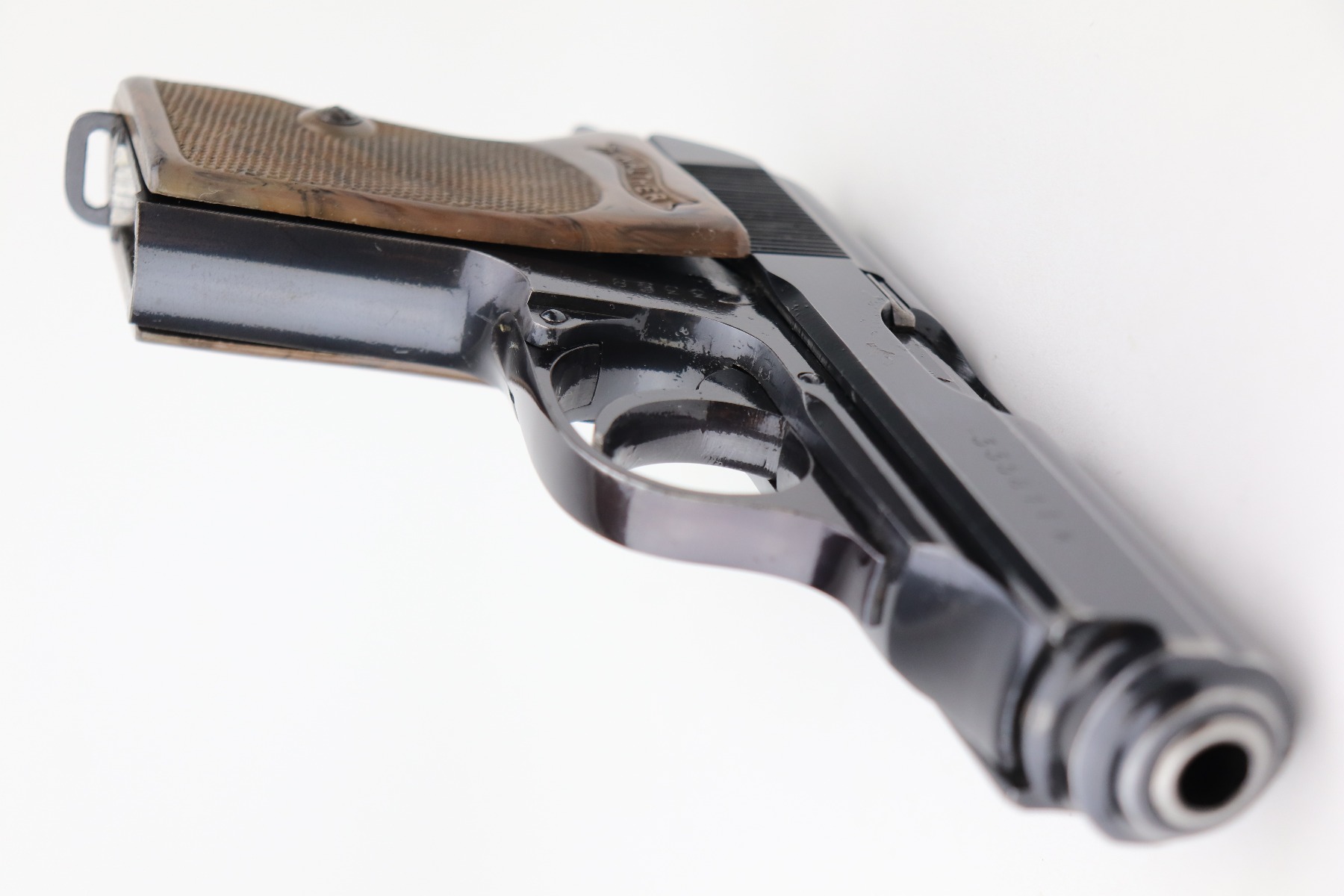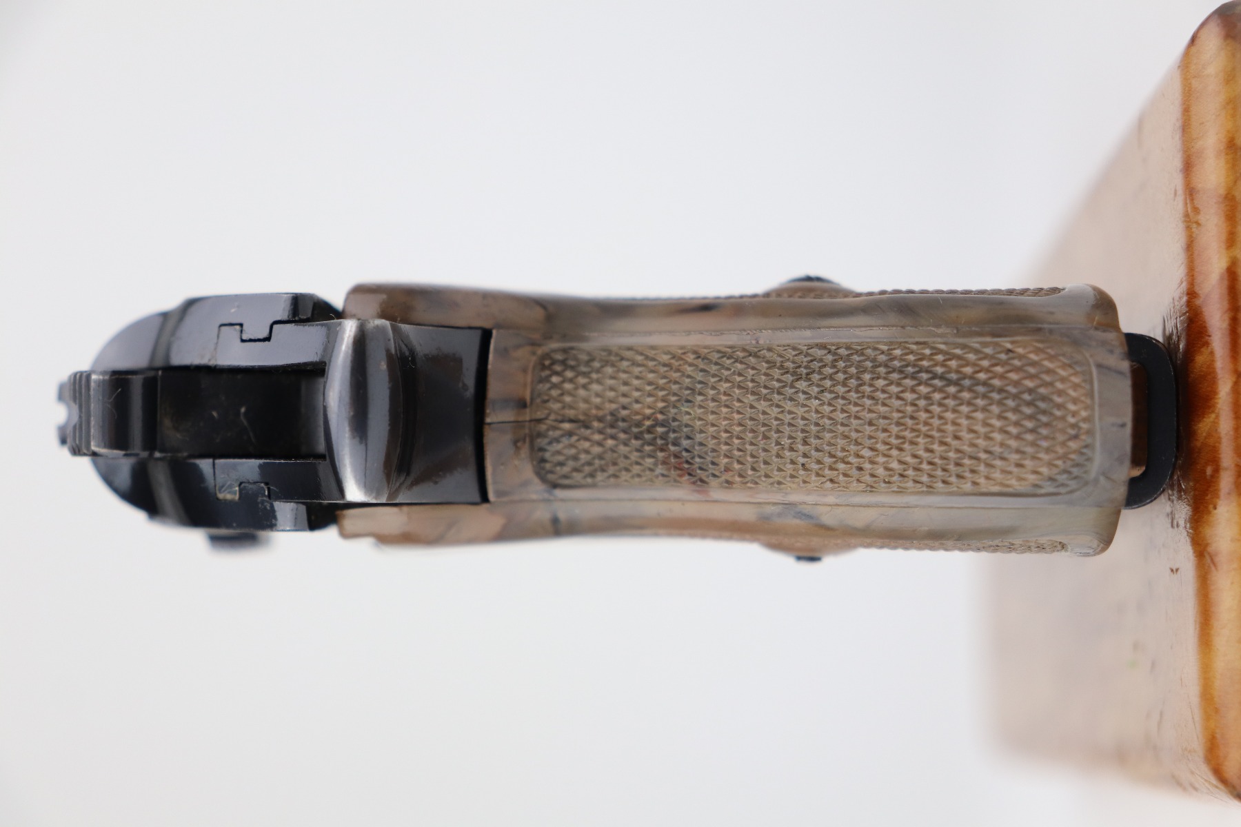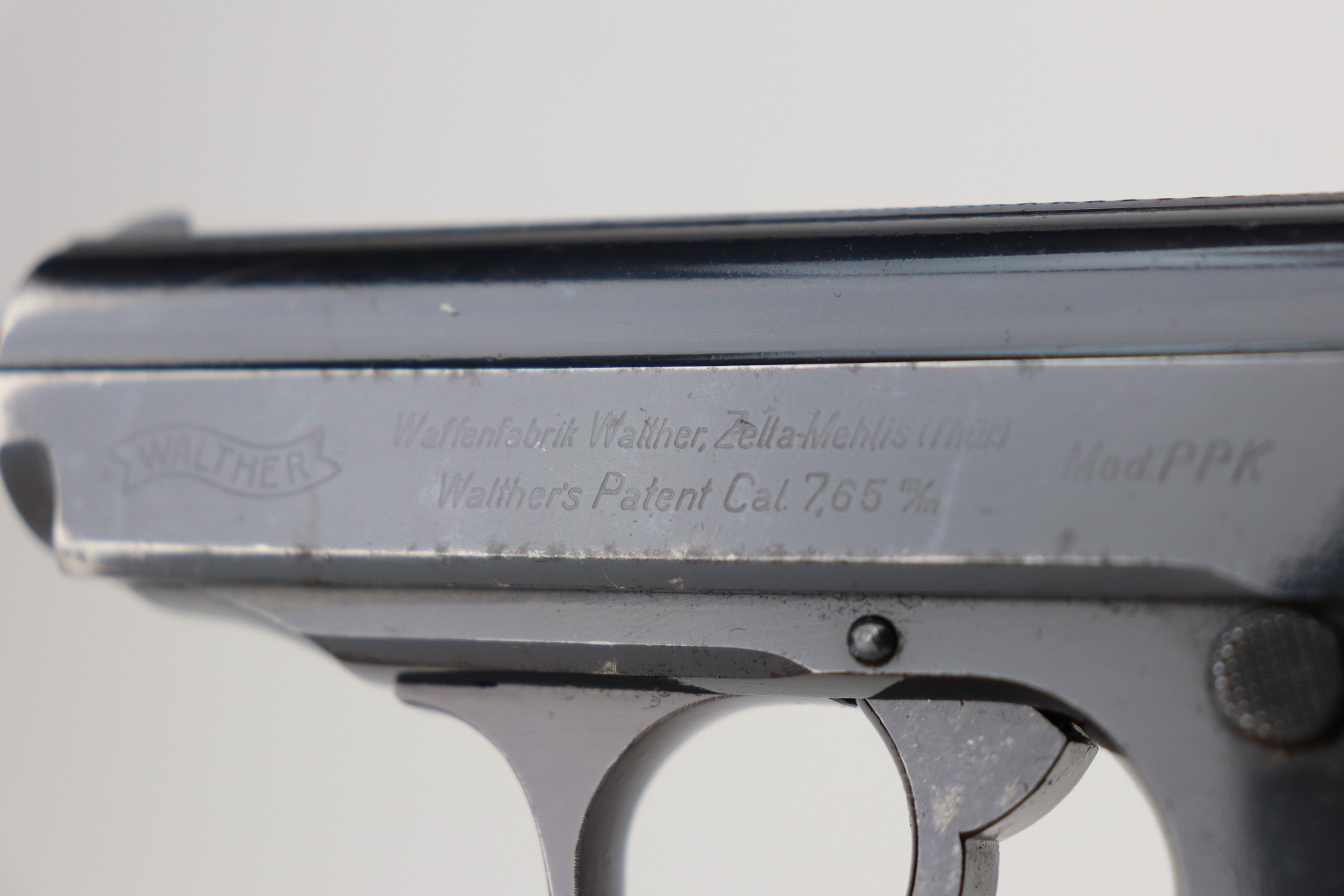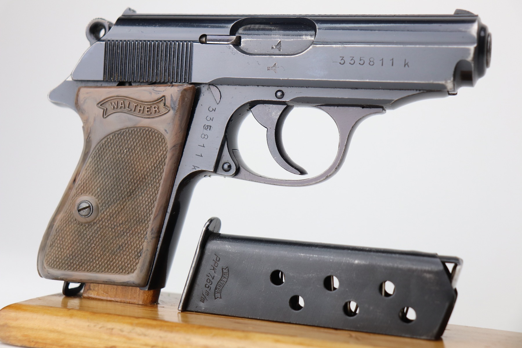 4/6/21 – This is an excellent example of a Walther PPK sold in the commercial market in 1941. It is all matching and has proper “Eagle N” proofs. This one comes with an excellent gray-colored grip. It has retained about 96% of its original finish. There is minor wear around the muzzle and high edges of the slide. Tiny dots of oxidation on the left side of the slide. Comes with a wartime magazine. The bore is excellent – shiny with strong rifling.
