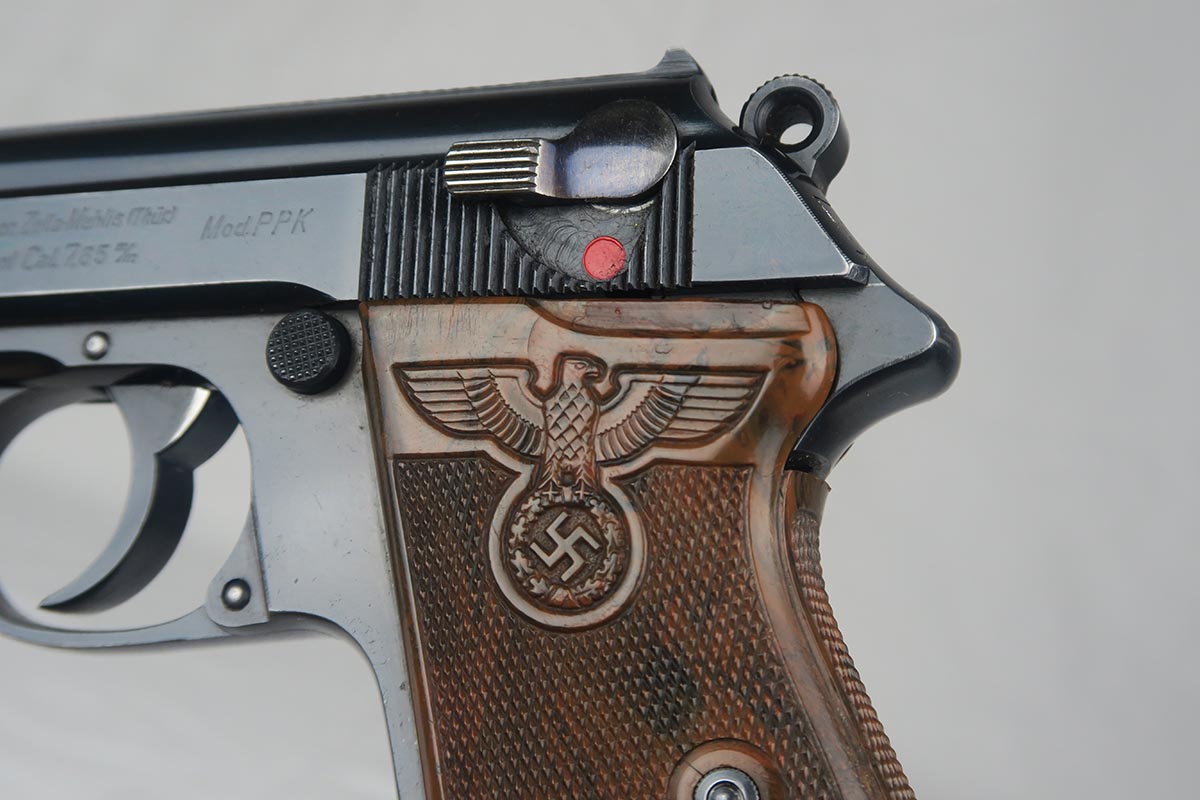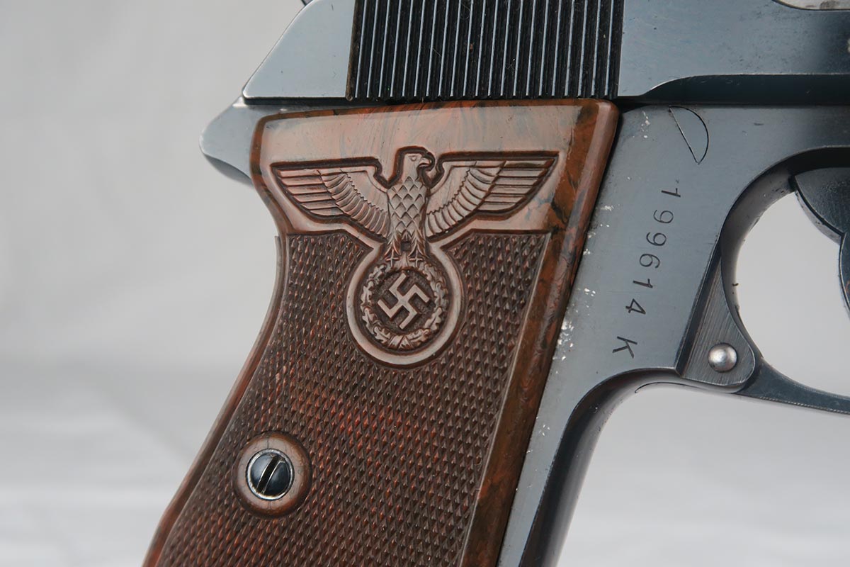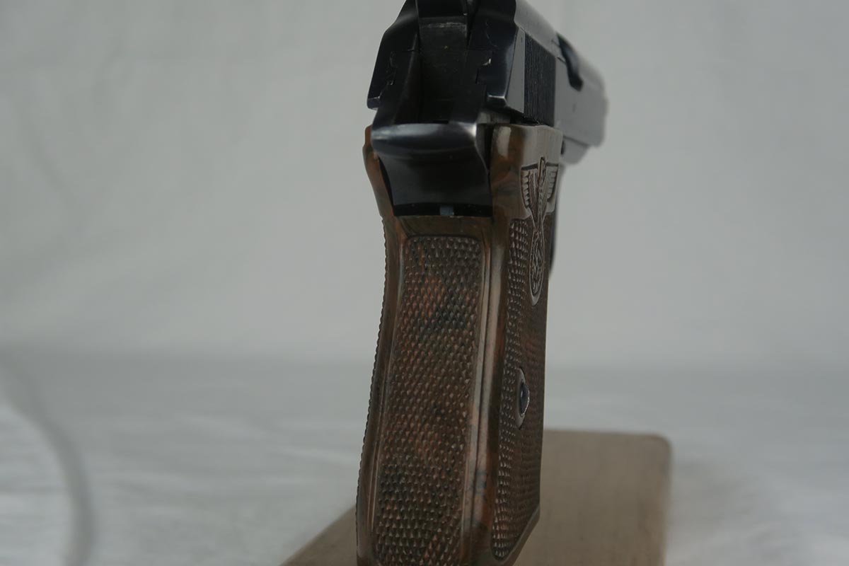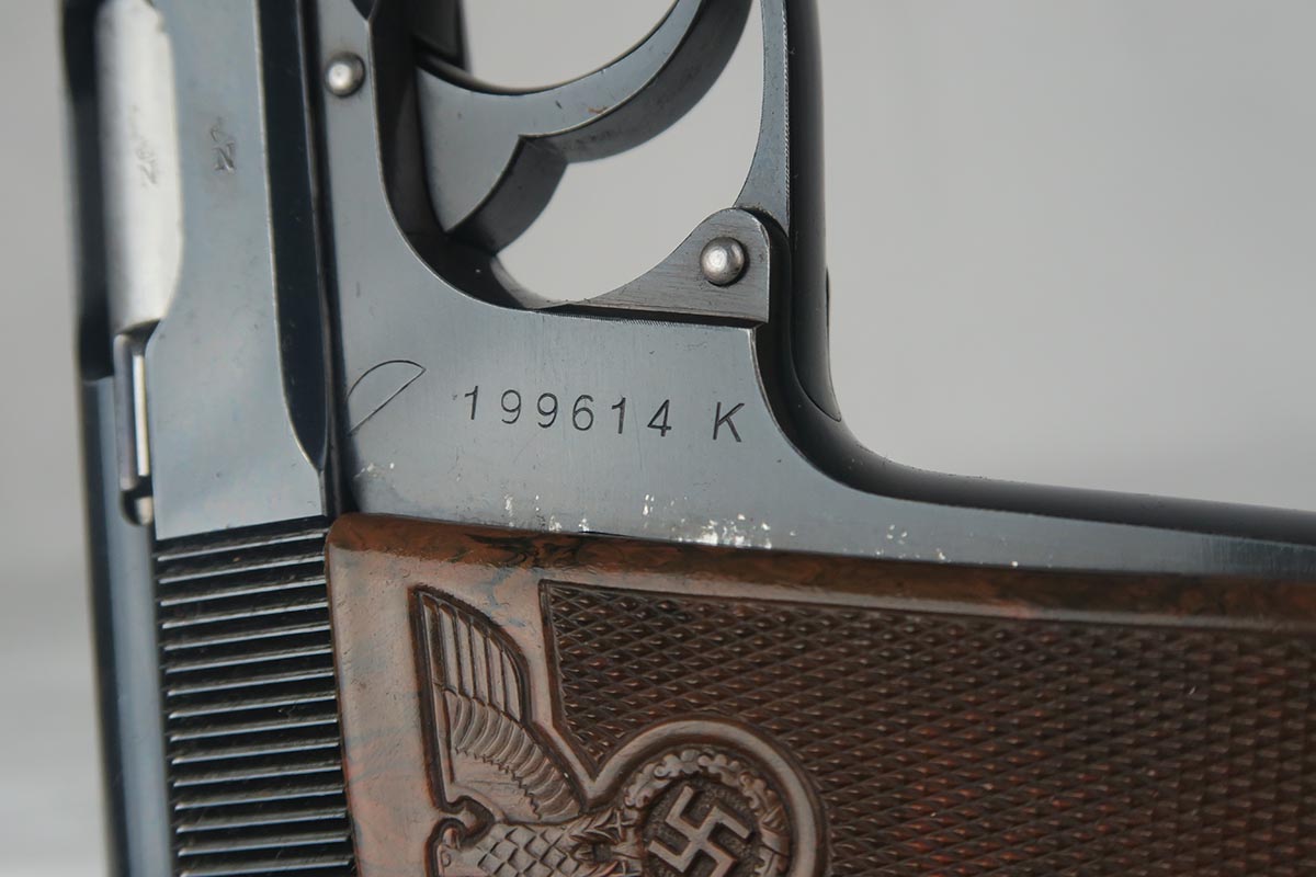 The Walther PPK with Party Leader Grips was the “Honor Weapon of the Political Leaders”. The Hoheitsabzeichen or High Insignia is the Eagle over Swastika found on either side of the grips where the Walther banner is normally located. The person entitled to wear the honor weapons that were awarded them by the Fuhrer were the Political Leaders of the national, regional and district territories, as well as leaders of local and support units. The persons who wore the honor weapon had their authorizations listed in the district personnel offices, and had to have in their possession a weapons permit issued by the police, which was obtained through official channels. These rare pistols were estimated to number around 3,500, and are widely faked, but this one is guaranteed original.