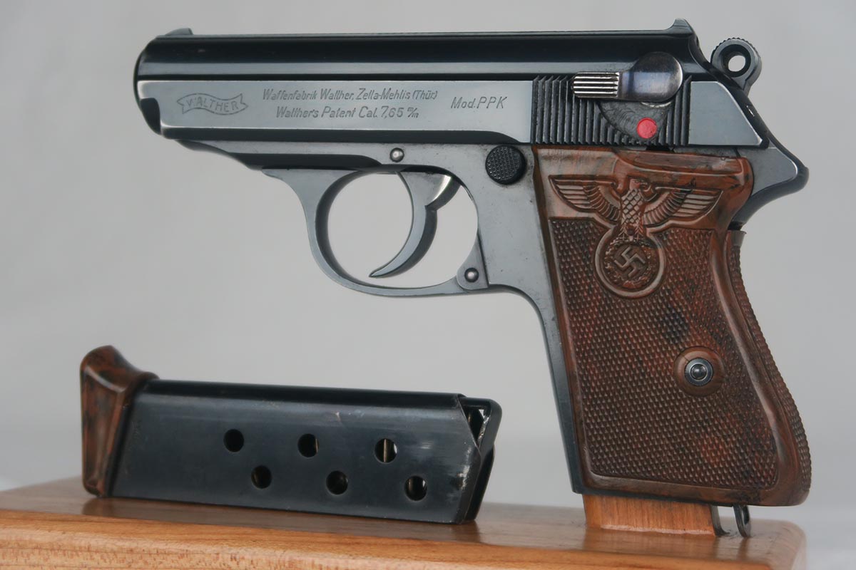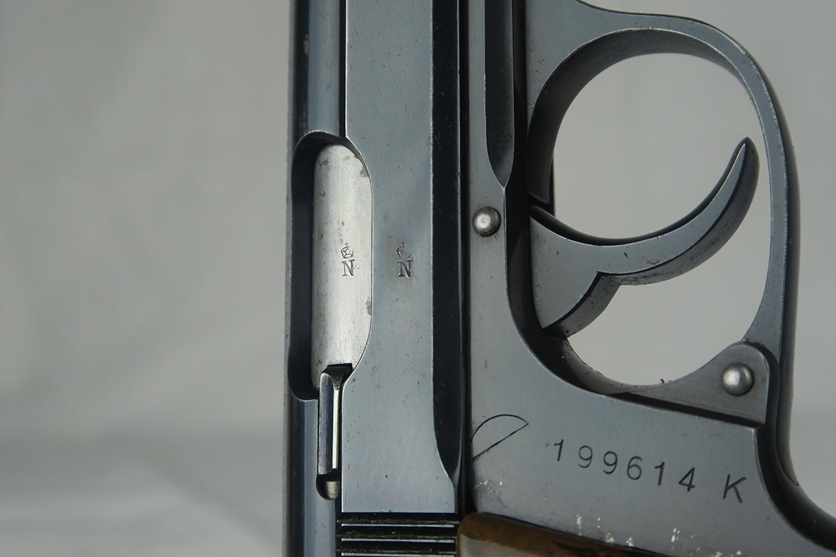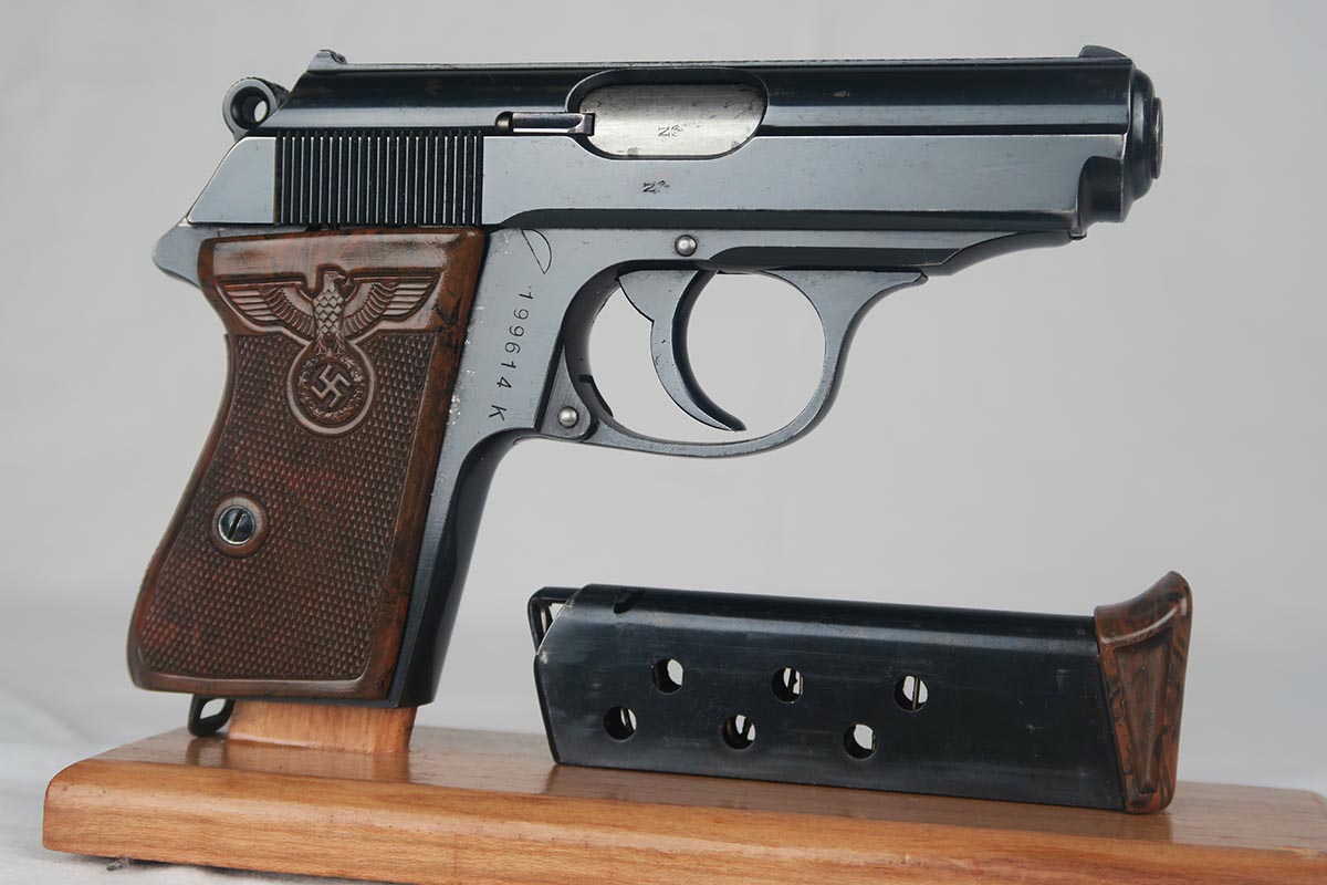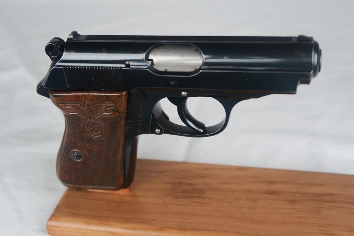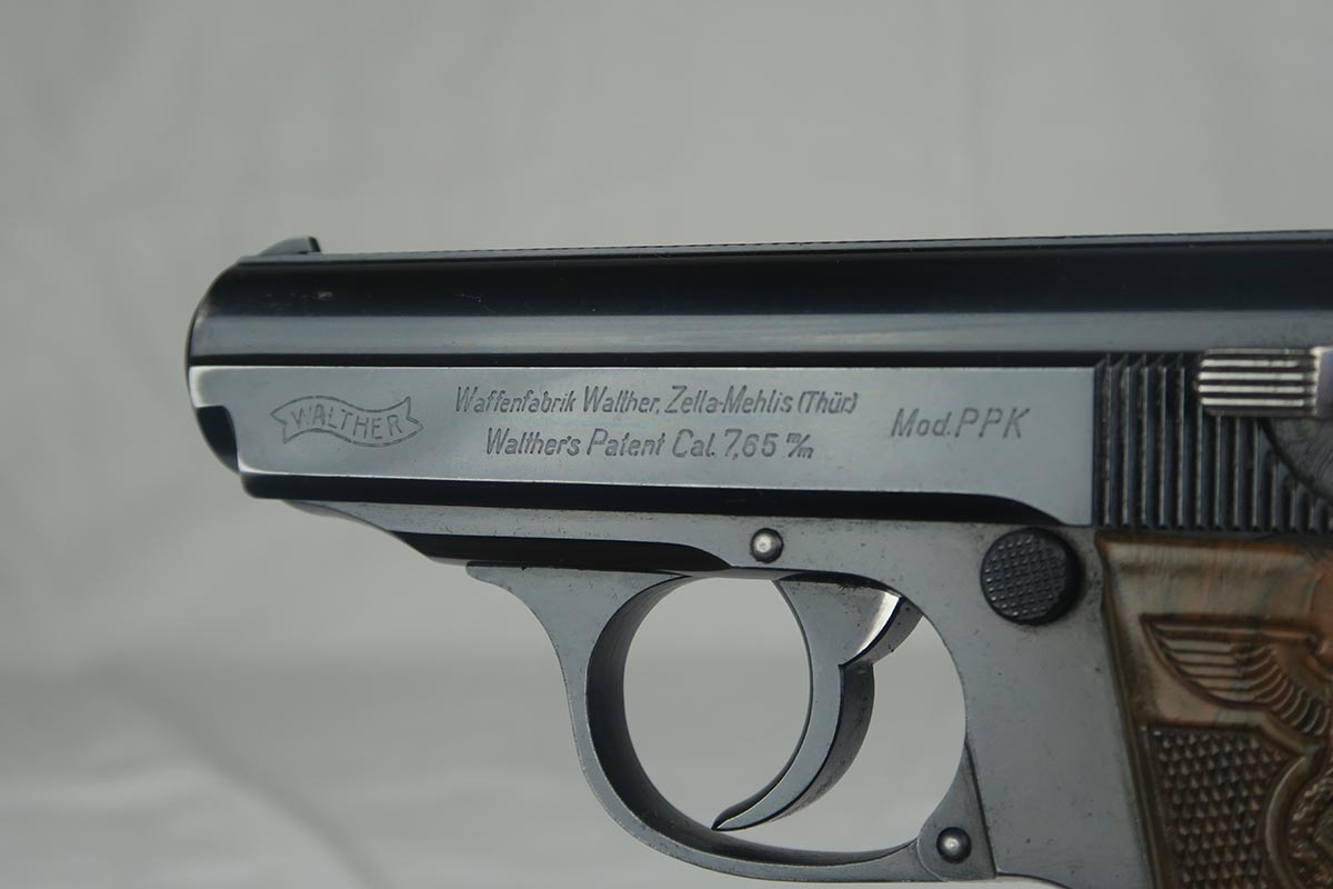 The Walther PPK with Party Leader Grips was the “Honor Weapon of the Political Leaders”. The Hoheitsabzeichen or High Insignia is the Eagle over Swastika found on either side of the grips where the Walther banner is normally located. The person entitled to wear the honor weapons that were awarded them by the Fuhrer were the Political Leaders of the national, regional and district territories, as well as leaders of local and support units. The persons who wore the honor weapon had their authorizations listed in the district personnel offices, and had to have in their possession a weapons permit issued by the police, which was obtained through official channels. These rare pistols were estimated to number around 3,500, and are widely faked, but this one is guaranteed original.