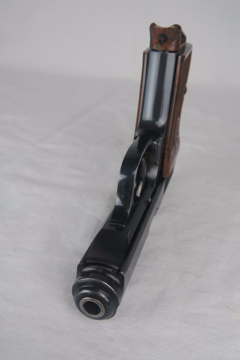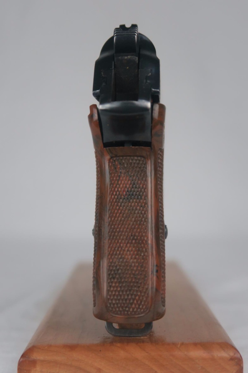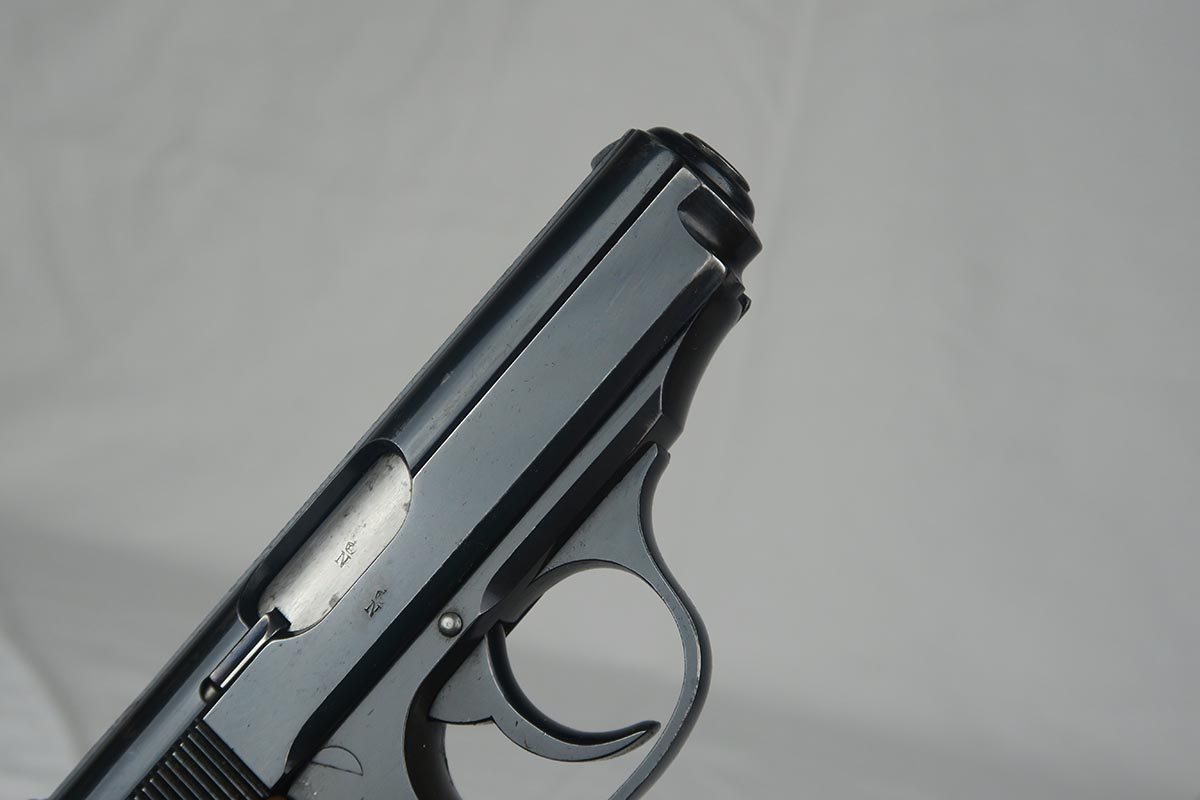 9/8/17 – This is an excellent and rare Party Leader Walther PPK.  It is all original and correct, with about 97-98% high-polish blue remaining.  There is minor muzzle wear on both sides of the slide and a little near the ejection port.  The grip is in beautiful condition with no major cracks, chips or flaws.  It has shrunk slightly over time, which is not uncommon for the bakelite PPK grips, but we do not recommend removing the grip for this reason.  Serial dates the pistol to 1939.  Excellent finger extension magazine.  Minty bore.