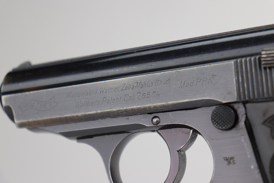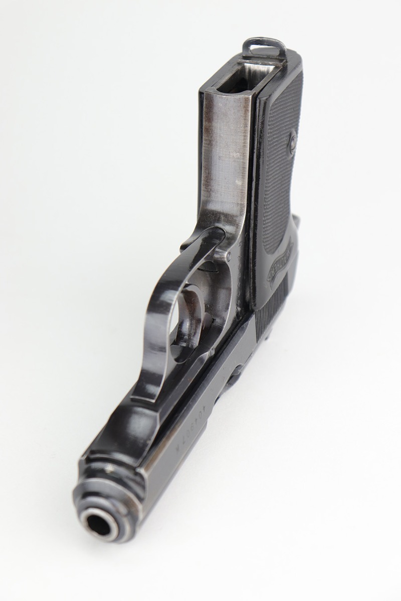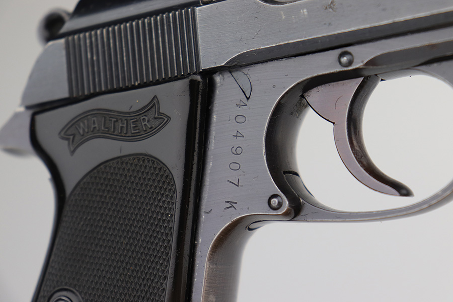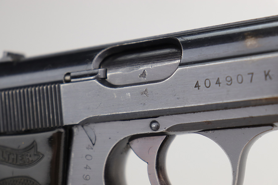 1/10/23 – This is an excellent example of a Walther PPK issued to the Nazi police force in 1943. The gun is all matching and has the proper police “Eagle C” marking on the left side of the frame. It has retained about 95% of its original wartime finish. There is very minor muzzle wear, some very light wear along both sides of the slide concentrated around the high edges, and very minor thinning and patina on the front strap. Comes with a very nice late-war black bakelite grip – one tiny crack on the spine. Also comes with a period-correct wartime magazine. Mint bore.