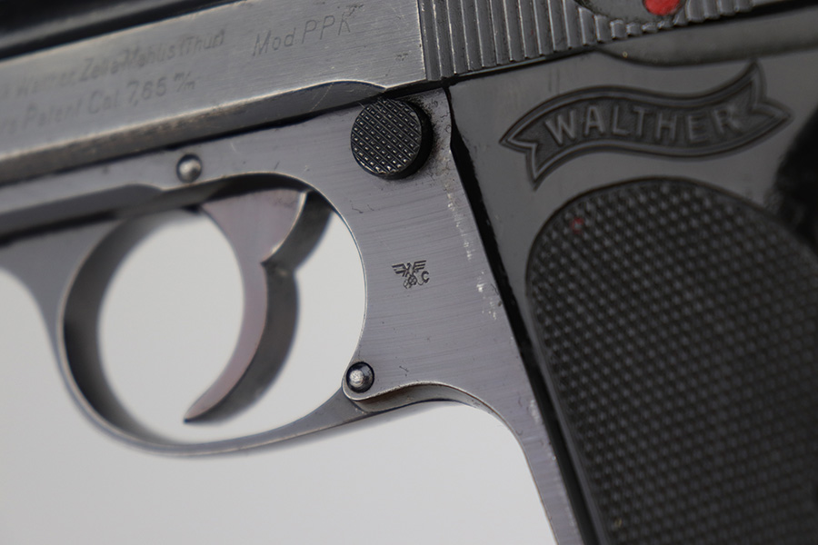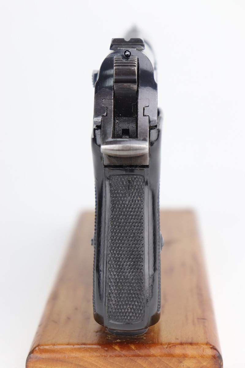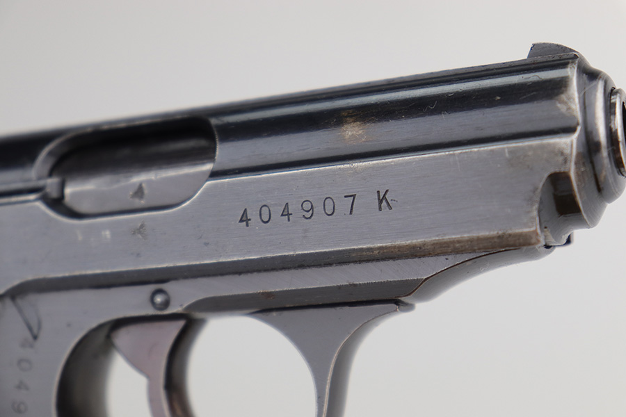 1/18/24 – This is an excellent example of a Walther PPK issued to the Nazi police force in 1943. The gun is all matching and has the proper police “Eagle C” marking on the left side of the frame. It has retained about 95% of its original wartime finish. There is very minor muzzle wear, some very light wear along both sides of the slide concentrated around the high edges, and very minor thinning and patina on the front strap. Comes with a very nice late-war black bakelite grip – one tiny crack on the spine. Also comes with a period-correct wartime magazine. Mint bore.