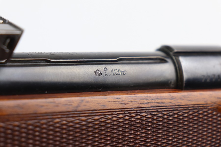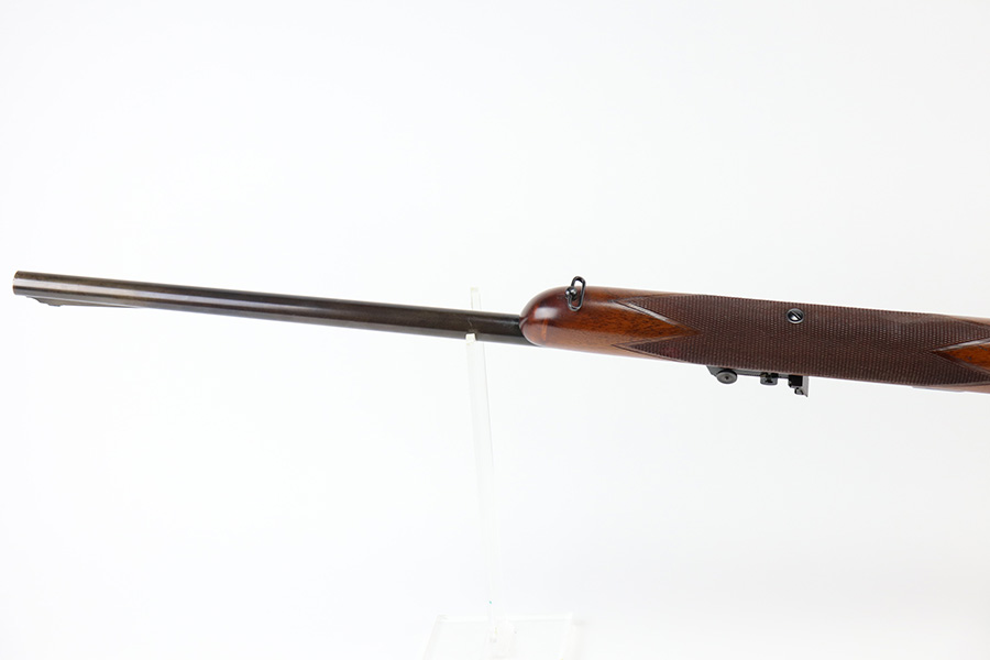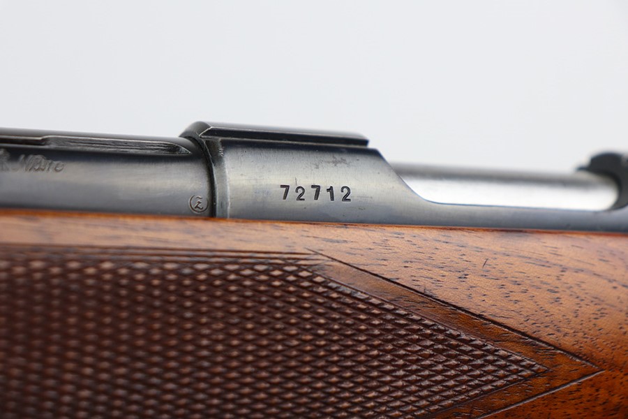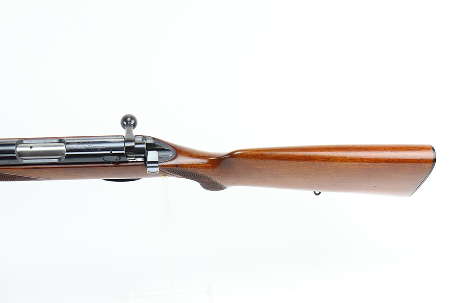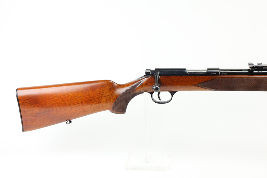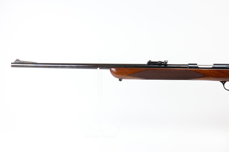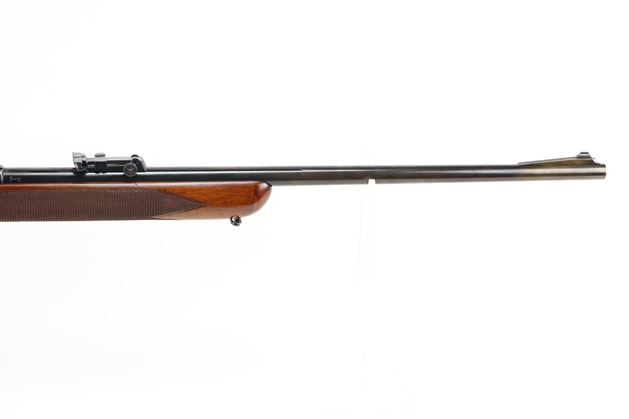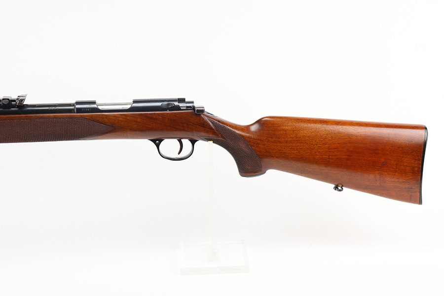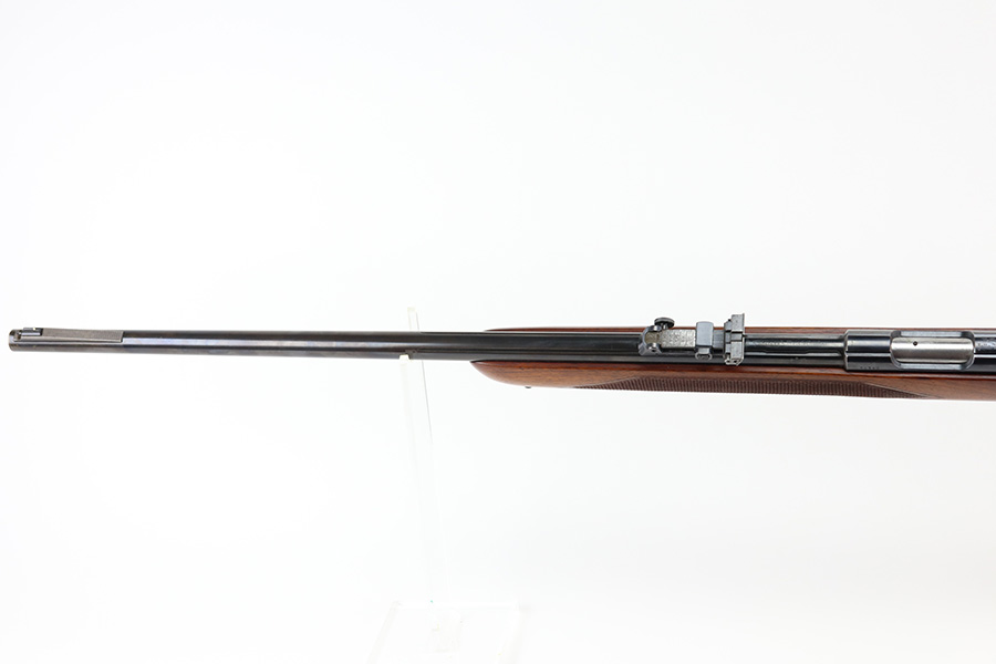 5/6/21 – This is an excellent example of a Walther Sportmodell Meisterbuchse Target Rifle, chambered in .22 LR. It is all matching and has the proper Nitro proofs. It has a unique factory adjustable rear sight that slides up and down the barrel on dovetails. The original bluing is excellent – just minor wear on the high edges of the receiver and minor thinning/spotty patina on the underside of the barrel. The stock is excellent with very minor handling marks here and there. The bore is mint.