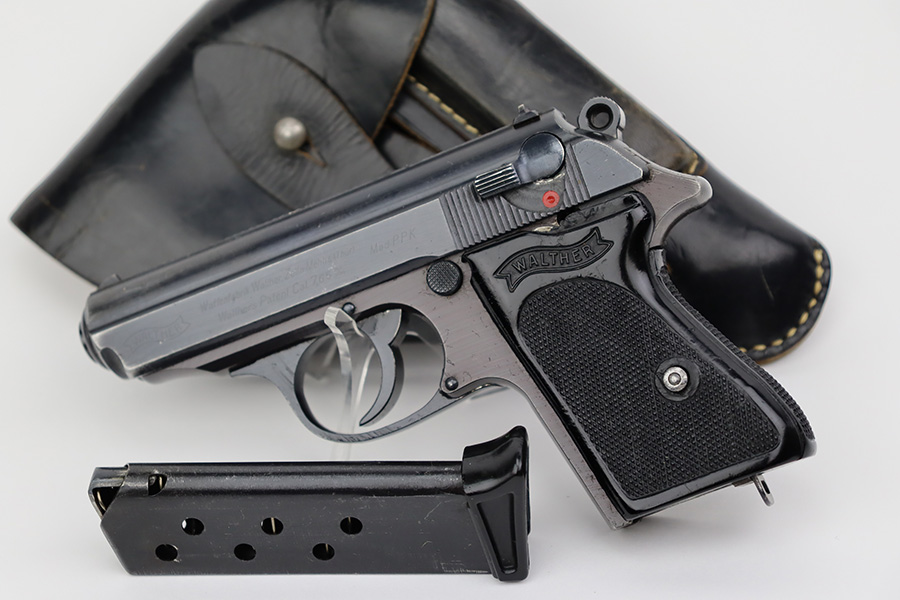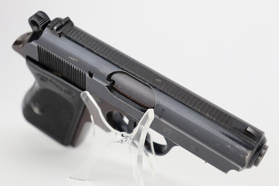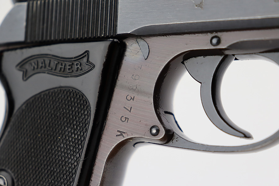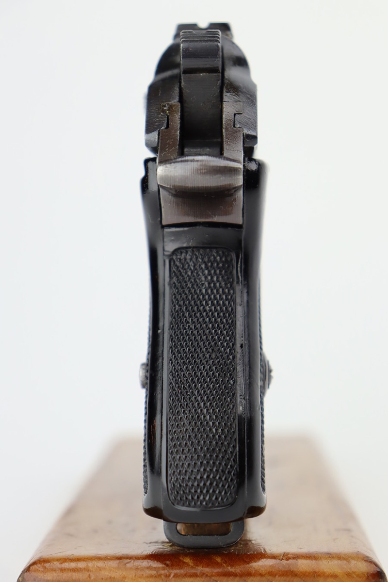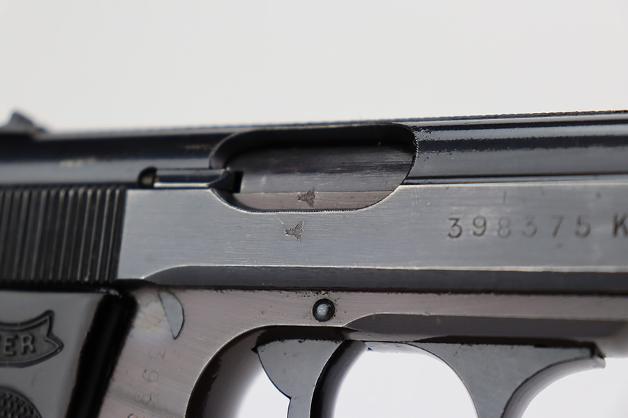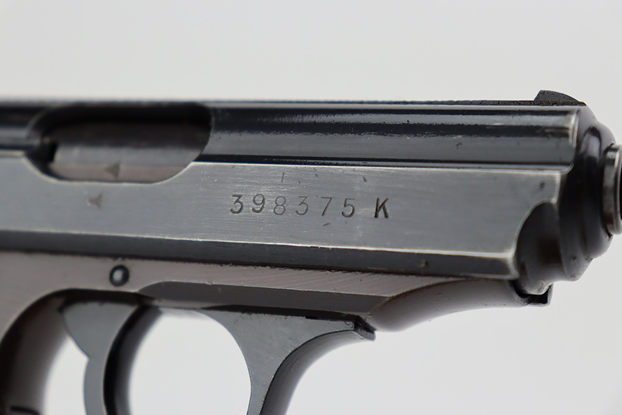 7/31/23 – This is an excellent example of a Walther PPK sold in the commercial market in 1942. It is all matching with the proper “Eagle N” proofs. It comes as a rig with an excellent 1944-dated black leather holster and a period-correct finger extension magazine. The gun itself has retained about 96% of its original wartime finish with very minor muzzle wear and some small spots of wear along both sides of the slide. Just a hint of thinning on the front strap. Fitted with a black bakelite grip – some minor chipping along the top edge of the left side. Like-new bore.