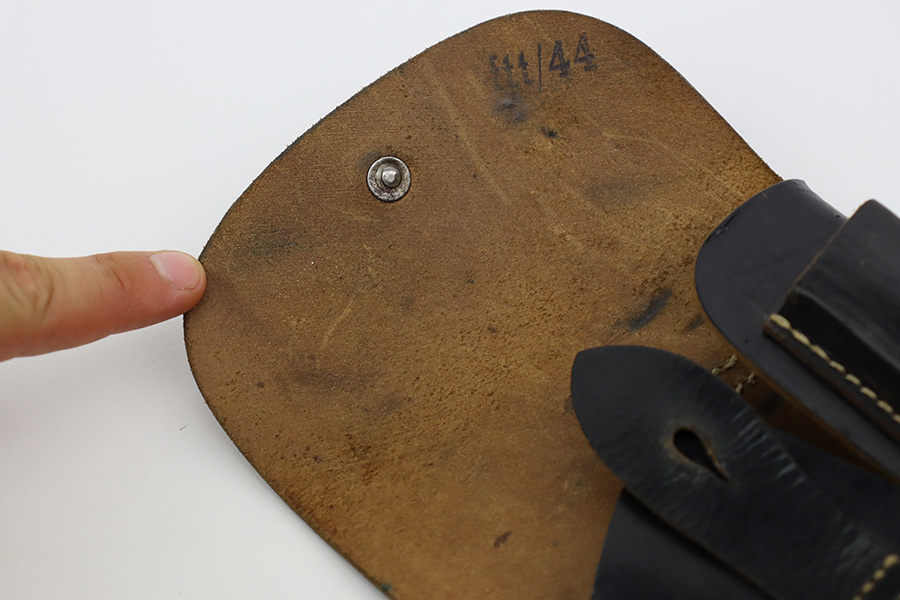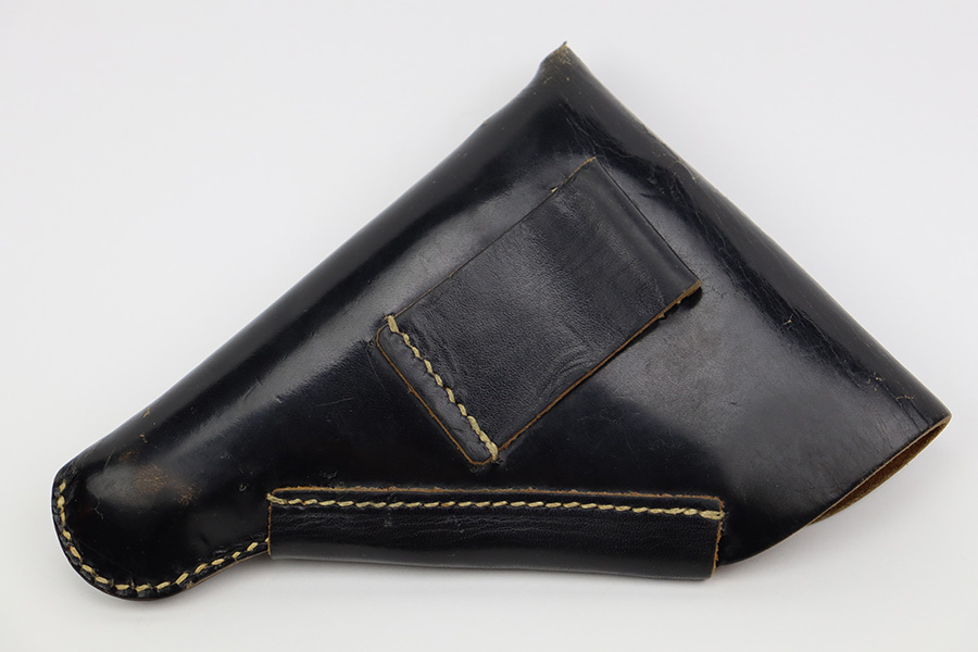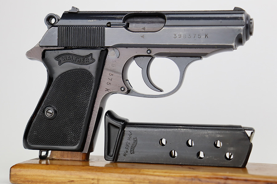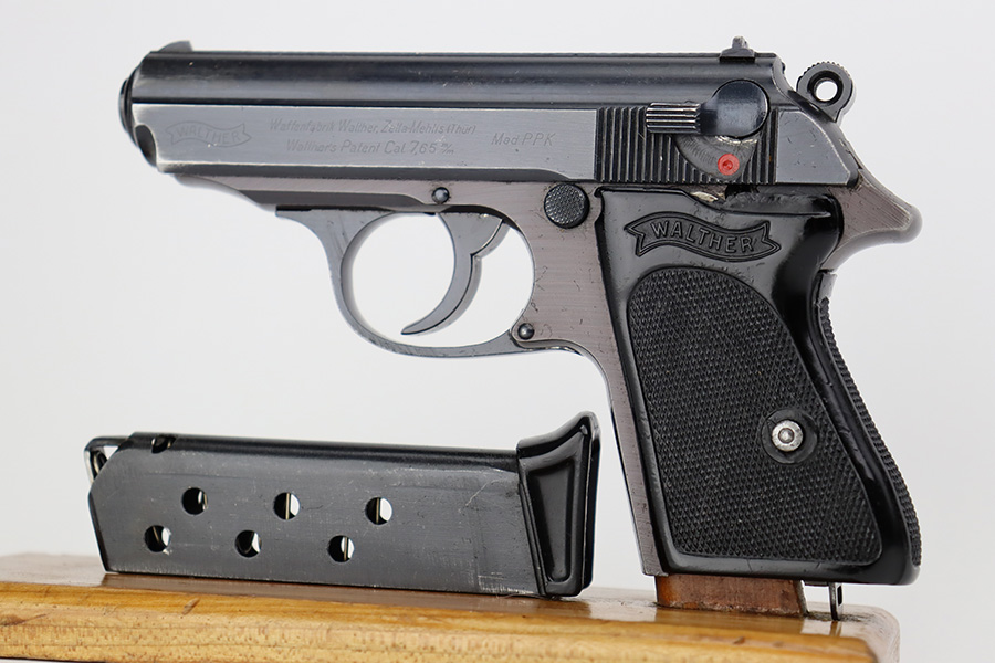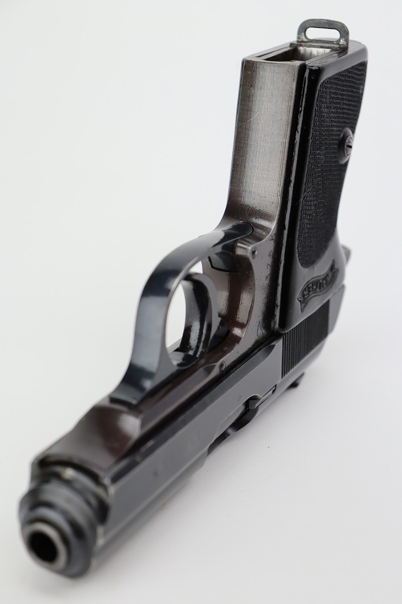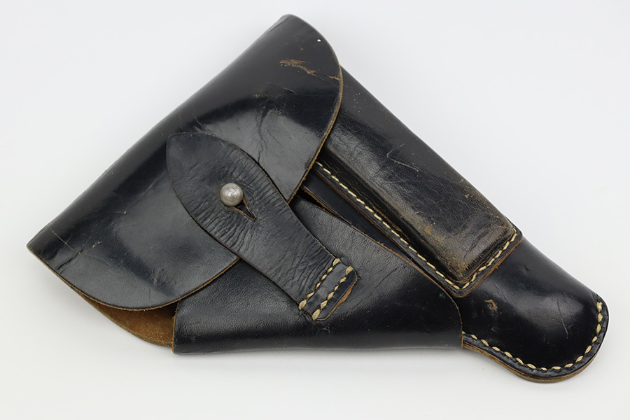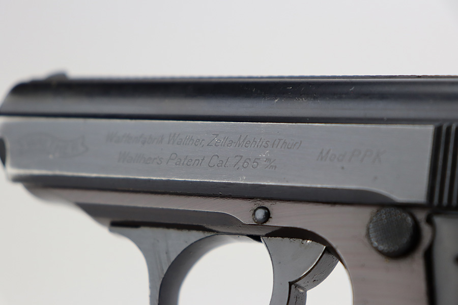 7/31/23 – This is an excellent example of a Walther PPK sold in the commercial market in 1942. It is all matching with the proper “Eagle N” proofs. It comes as a rig with an excellent 1944-dated black leather holster and a period-correct finger extension magazine. The gun itself has retained about 96% of its original wartime finish with very minor muzzle wear and some small spots of wear along both sides of the slide. Just a hint of thinning on the front strap. Fitted with a black bakelite grip – some minor chipping along the top edge of the left side. Like-new bore.