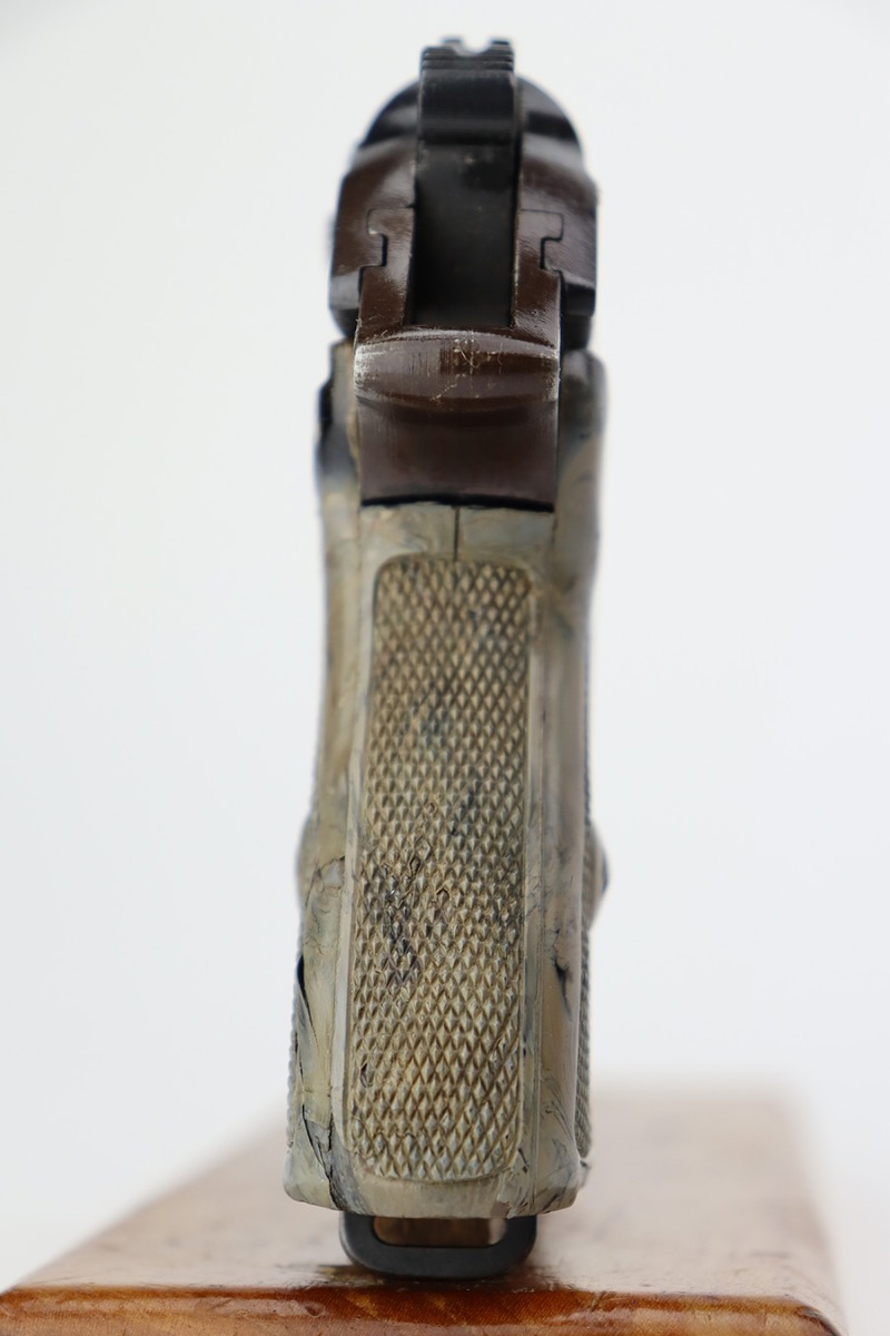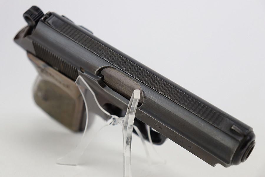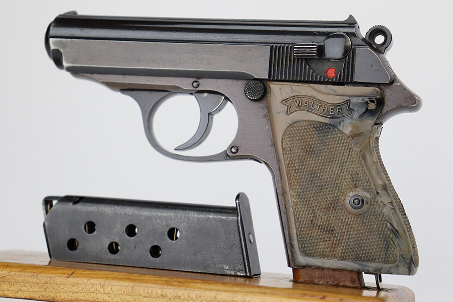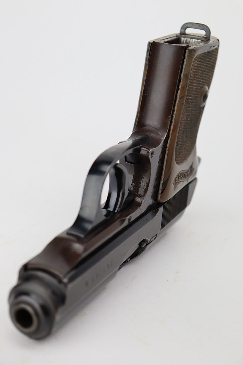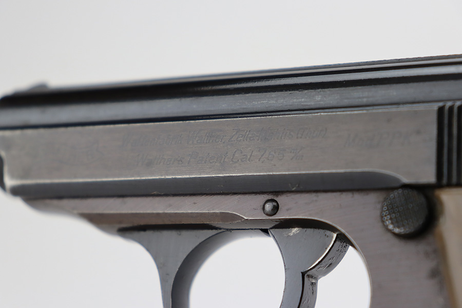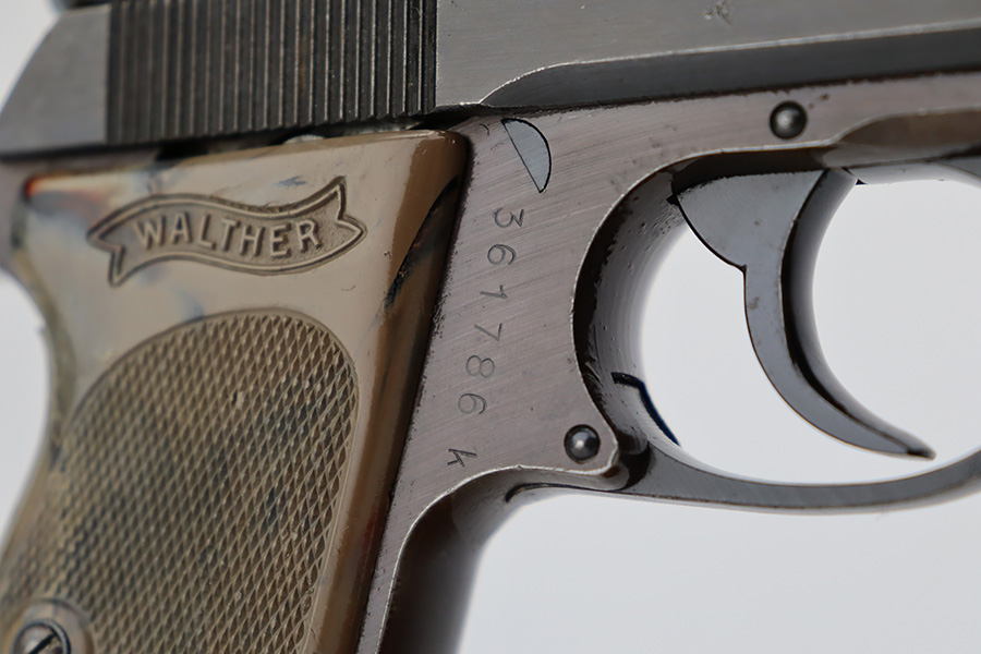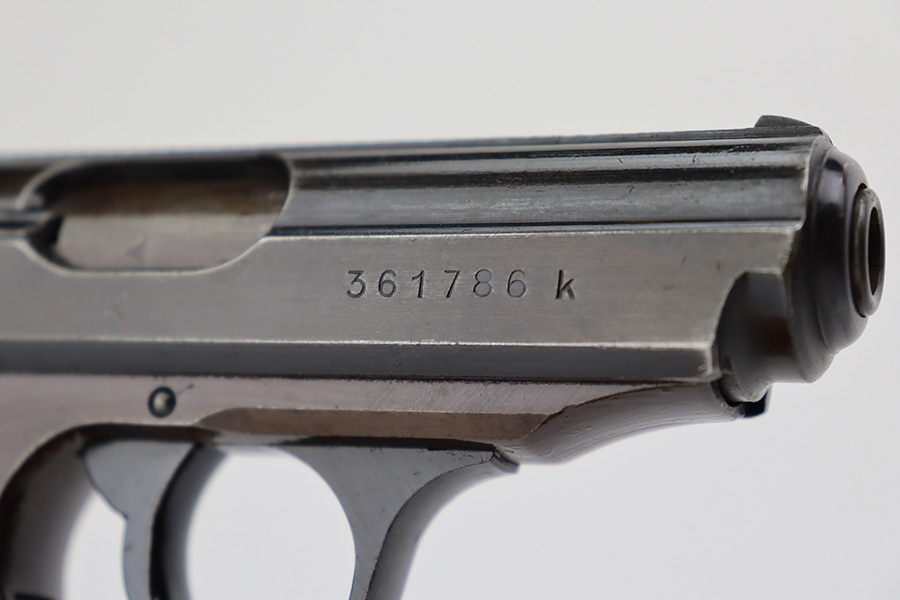 7/28/23 – This is an excellent example of a commercial PPK sold in the commercial market in 1942. All matching with the proper “Eagle N” proofs. It has retained about 96% of its original wartime finish. There is just very minor wear around the muzzle and on the high edges. Just a hint of thinning along the right side of the slide. Comes with a period-correct wartime magazine and is fitted with a scarce grey-colored grip – a couple of hairline cracks with some minor “blistering” in the bakelite throughout. Very nice bore with strong rifling, but there is some very light freckling in the grooves. The hold-open does not work properly with this magazine.