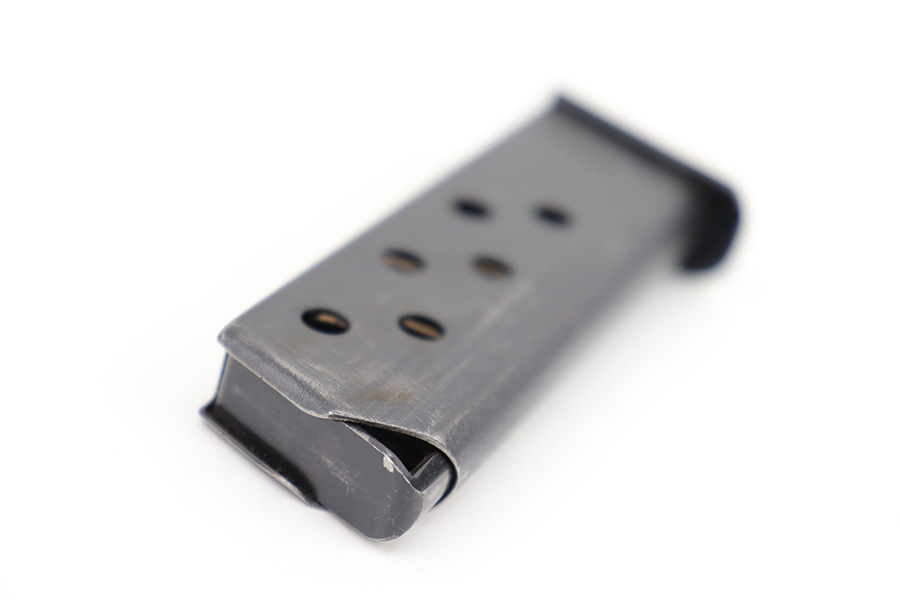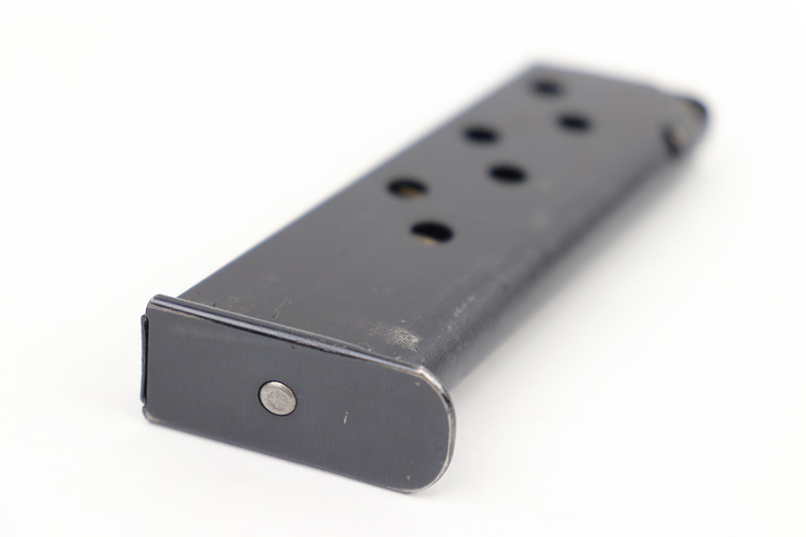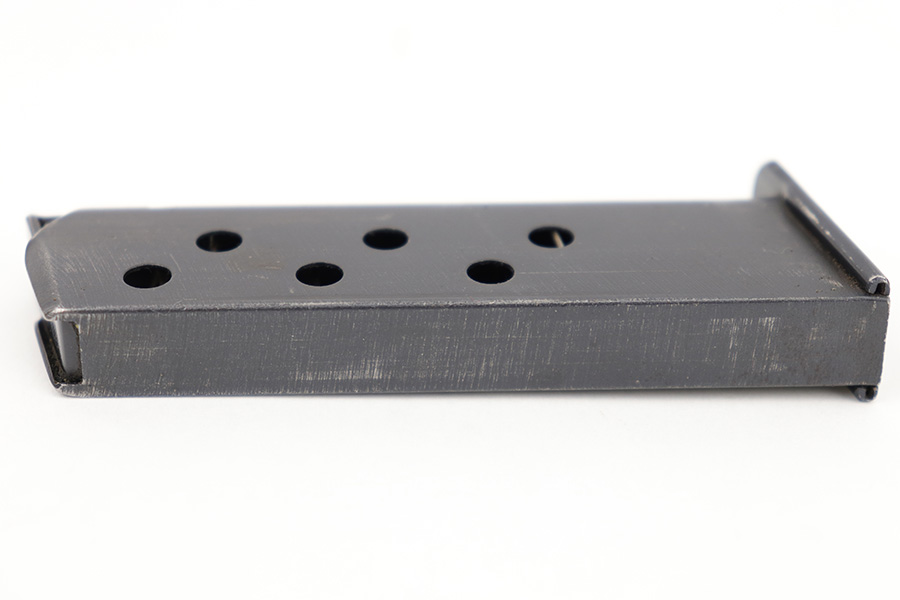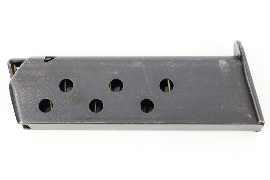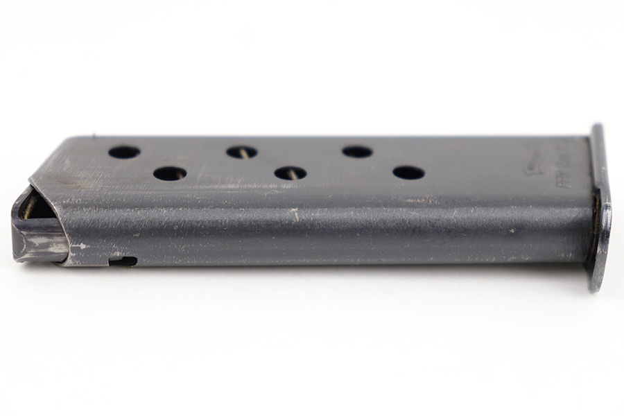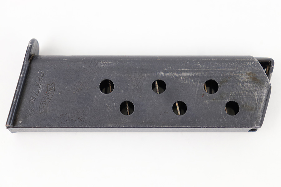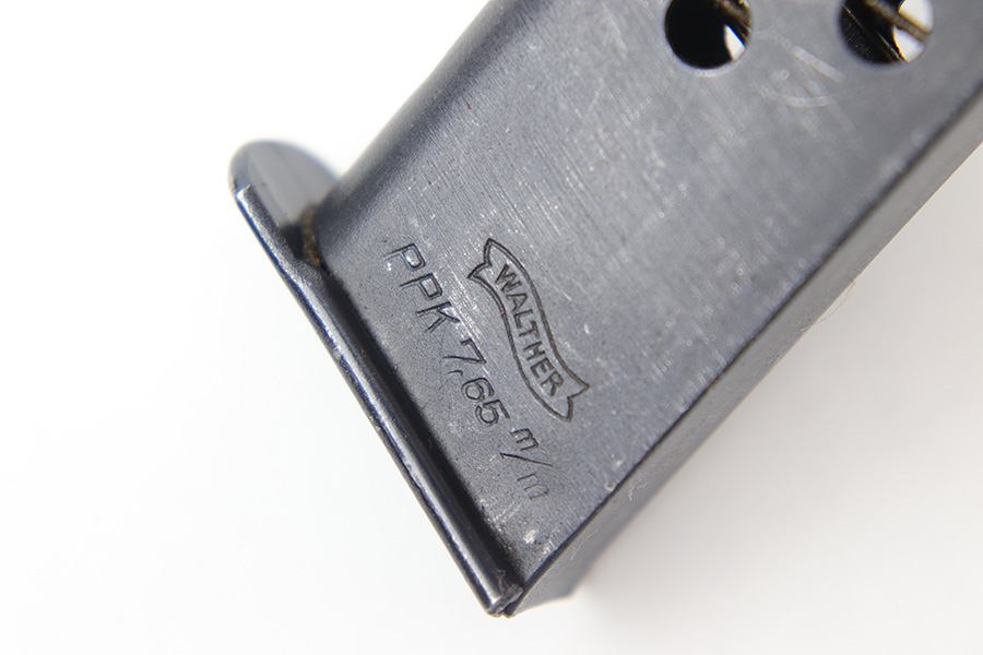 5/17/23 – This is an excellent condition Walther PPK magazine from WW2. Wartime variation with a dull blued finish and caliber information under the Walther banner stamp. Some mild finish loss, but no rust or pitting and a fully functional spring.