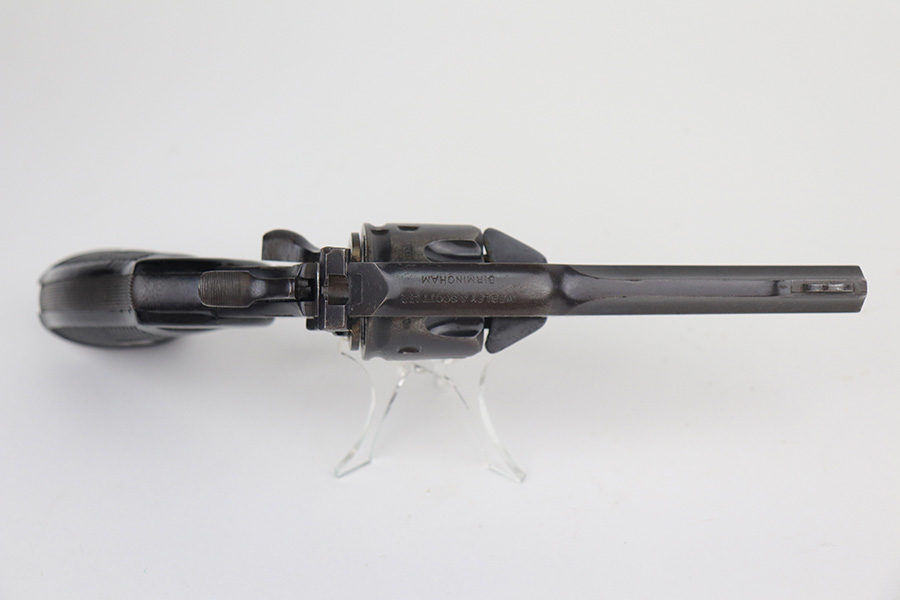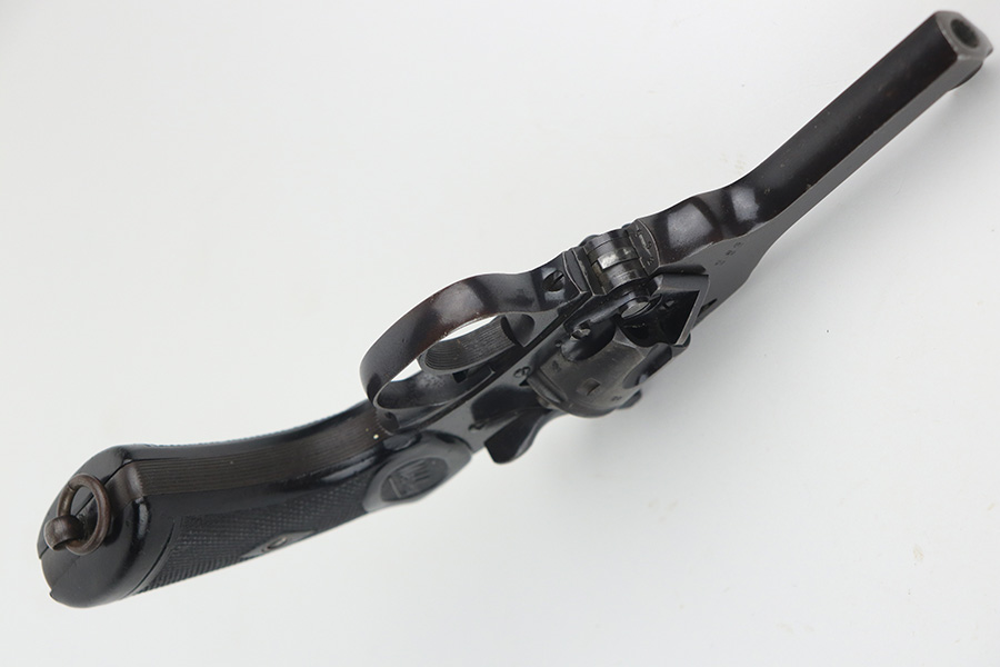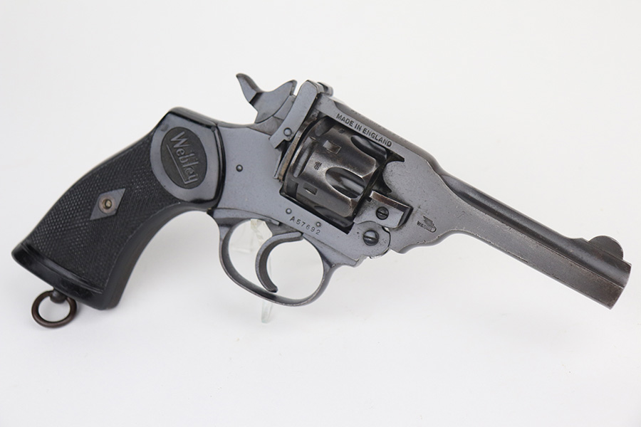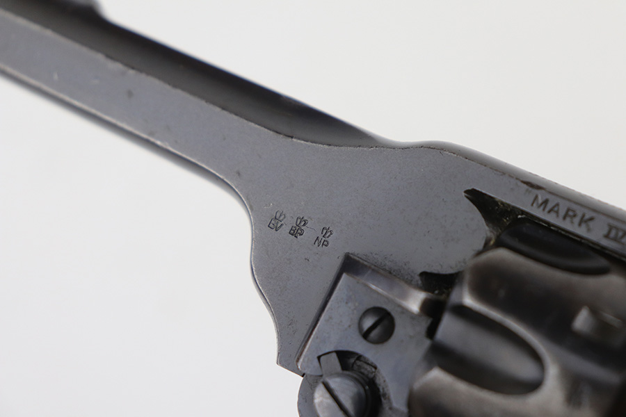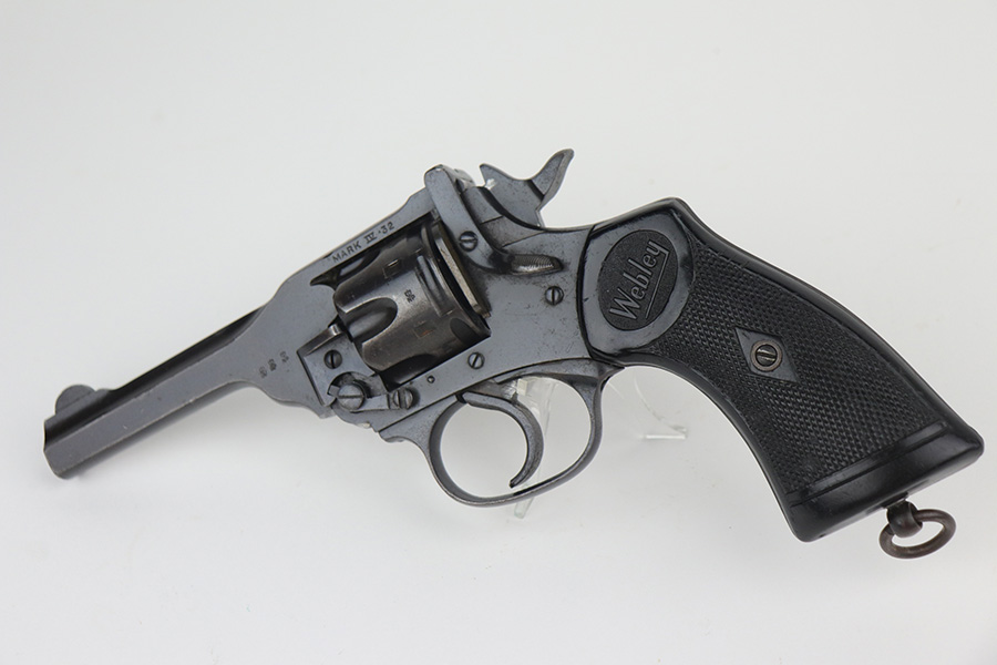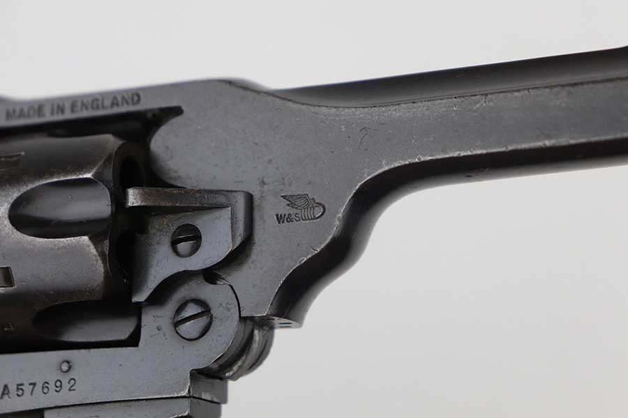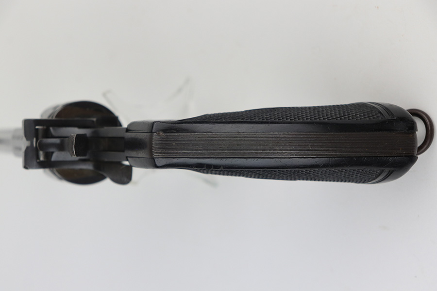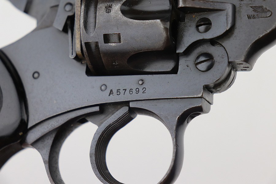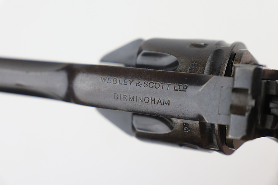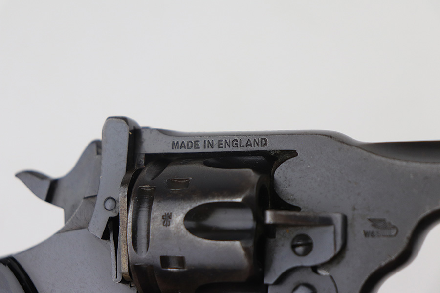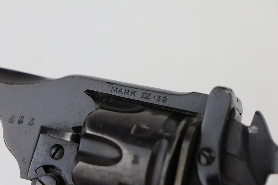 11/19/21 – This is a nice example of a Webley Mark IV revolver from 1949-51 in the less commonly seen .32 (most are .38). It has matching numbers on frame and cylinder. Most of the bluing loss is on the cylinder, and a little more on the trigger guard. Excellent, shiny bore. The gun also has some general oxidation on the frame. The grips have various scuffs or dings but no major defects.