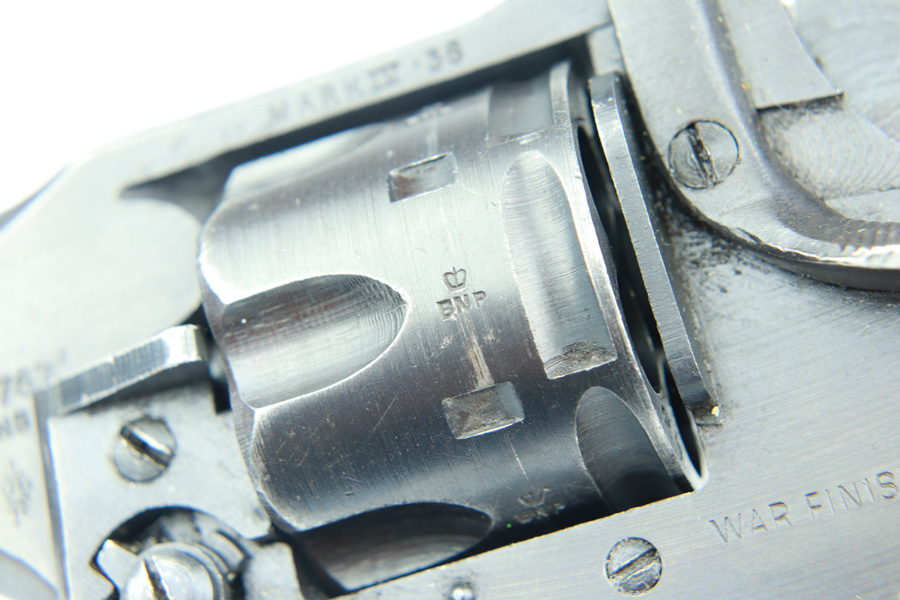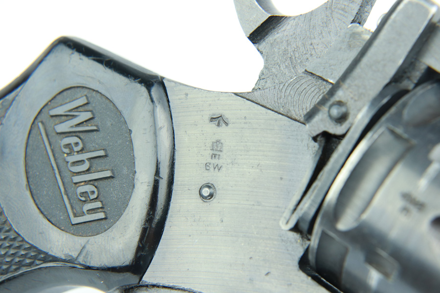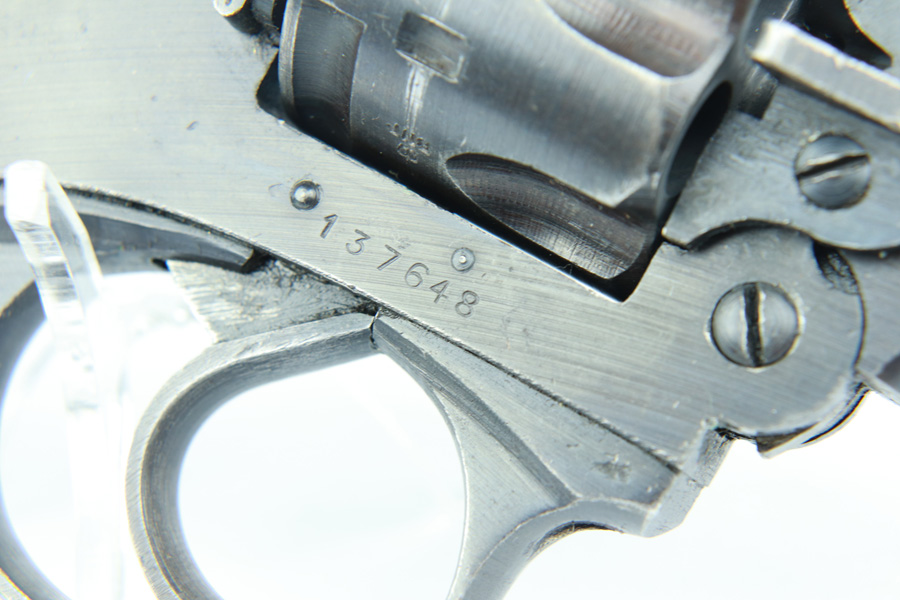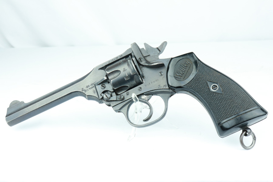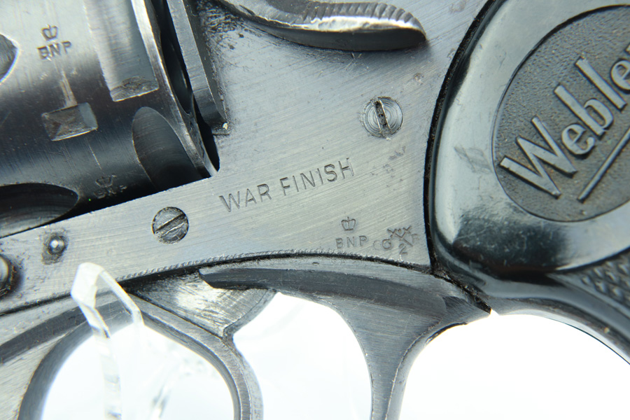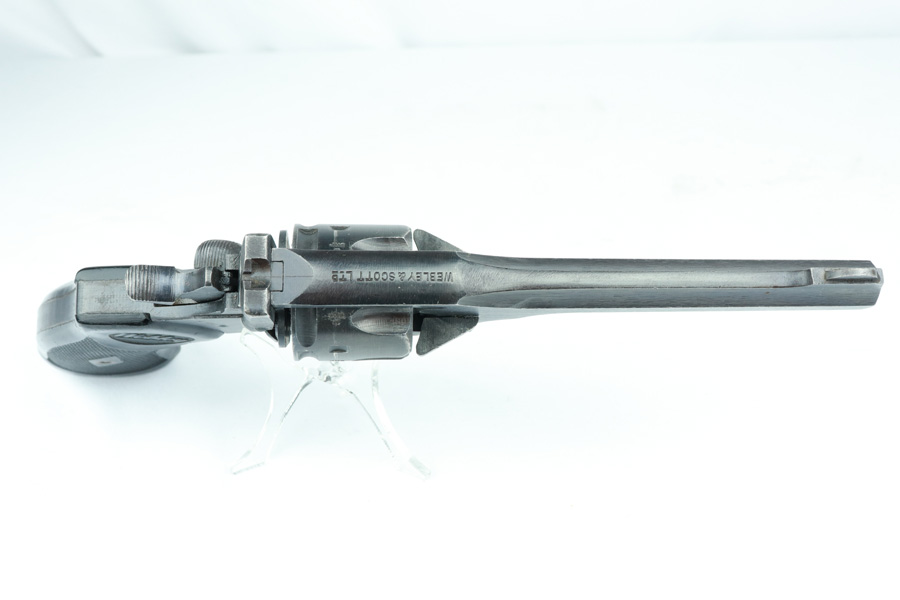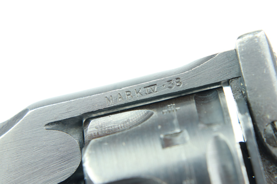 11/7/18 – This is an excellent and all matching Webley Mark IV revolver from 1944. This British revolver was manufactured for the war and chambered in .38 caliber. The original military style bluing rates at 98% with minor muzzle and edge thinning. Excellent bore. Grips show minor scuffs, scratches and dings but no chips or cracks. All original and matching.