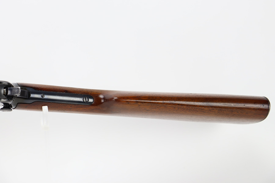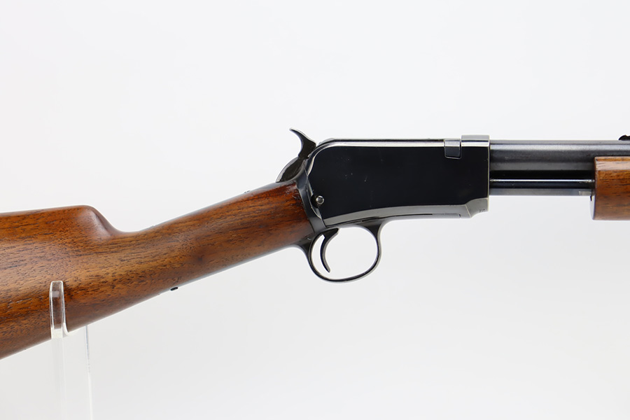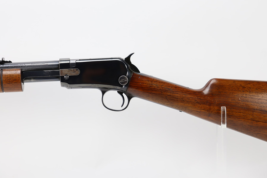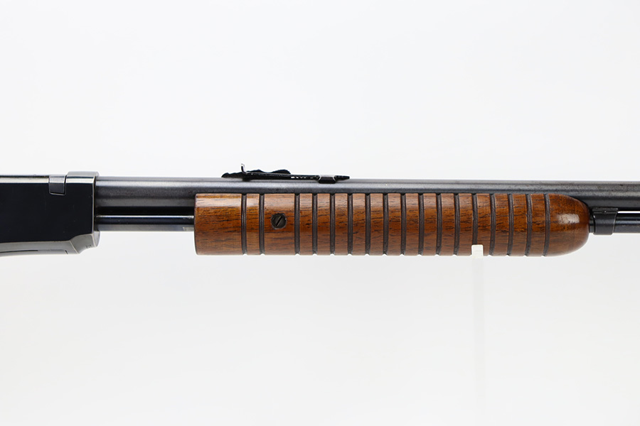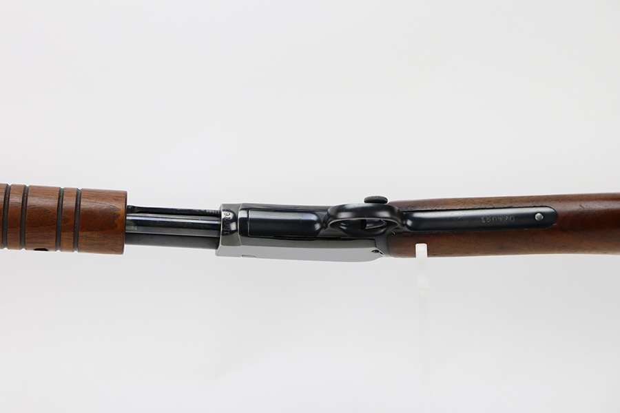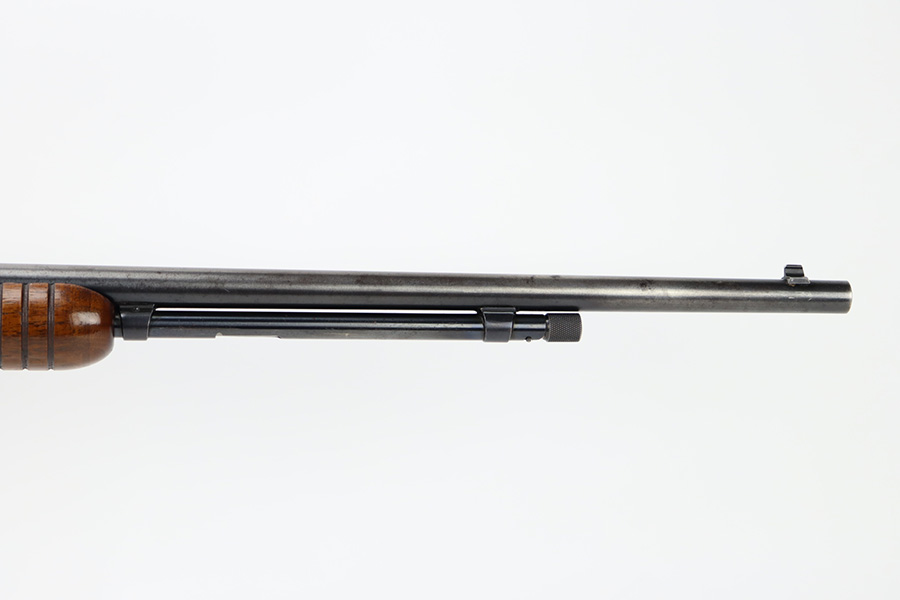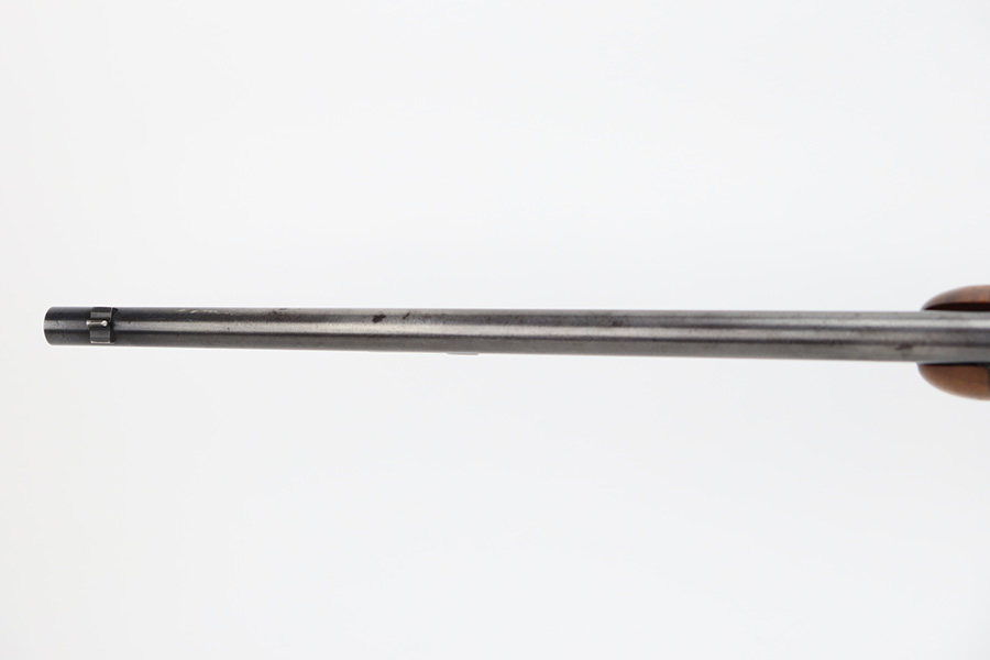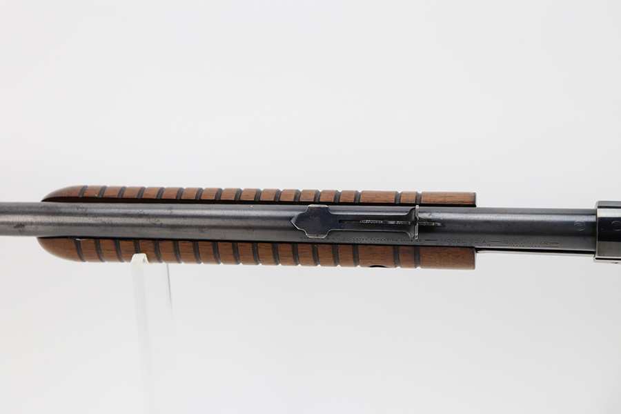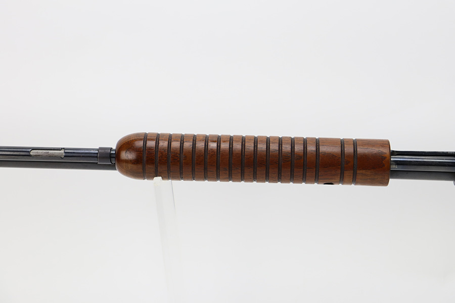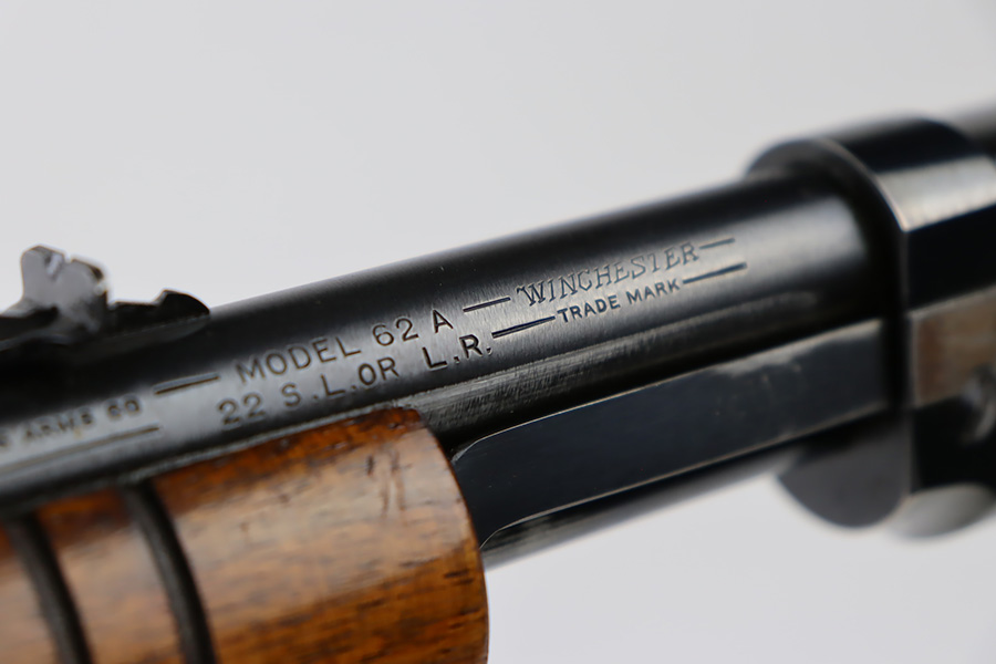 11/6/23 – This is an excellent Winchester Model 62A manufactured in August of 1942, chambered for either .22LR .22SL, and featuring a 23″ barrel. Although produced in 1939 at the beginning of WW2, this rifle is identical to the pre-war models 62 and 62A. It therefore includes several desirable features not found in later variations such as checkered hammer, steel butt plate, and the wooden fore-end used for pumping has complete rings. The tubular magazine is capable of holding 15 rounds. The gun has retained about 98% of its original finish, and most of the wear is concentrated along the top of the barrel, with some very minor thinning, a couple dark spots, and one very small area of finish loss. A few light surface scratches and handling marks on the receiver, as well as some wear along the high edges. Near flawless wood furniture, with just minor handling marks and no major scratches, cracks or damage, and a mint bore. Very difficult to find these in this condition.