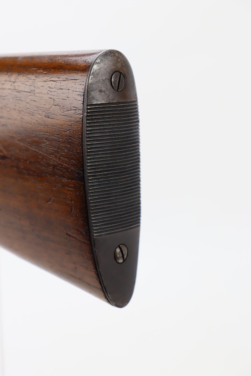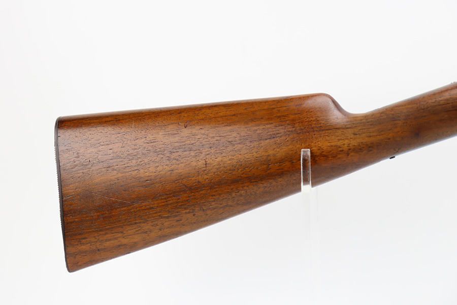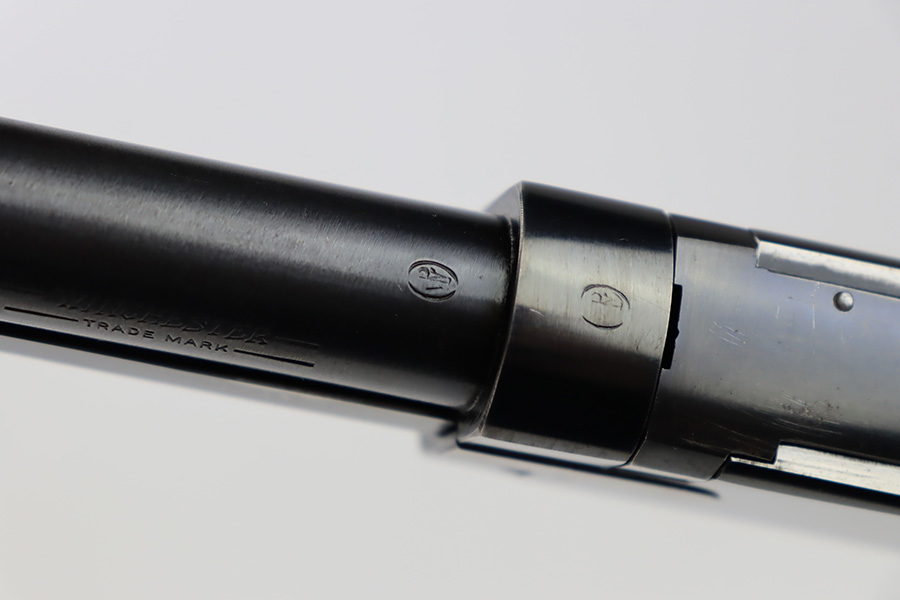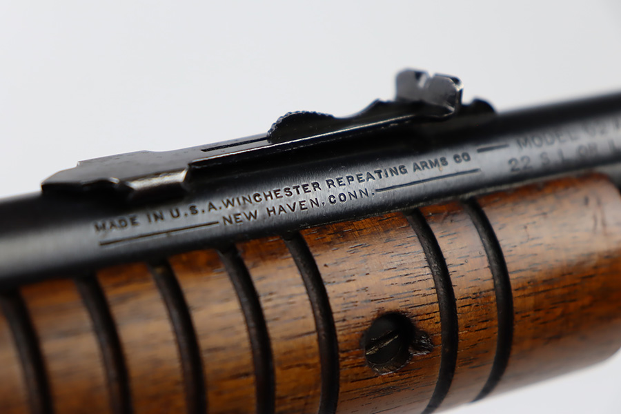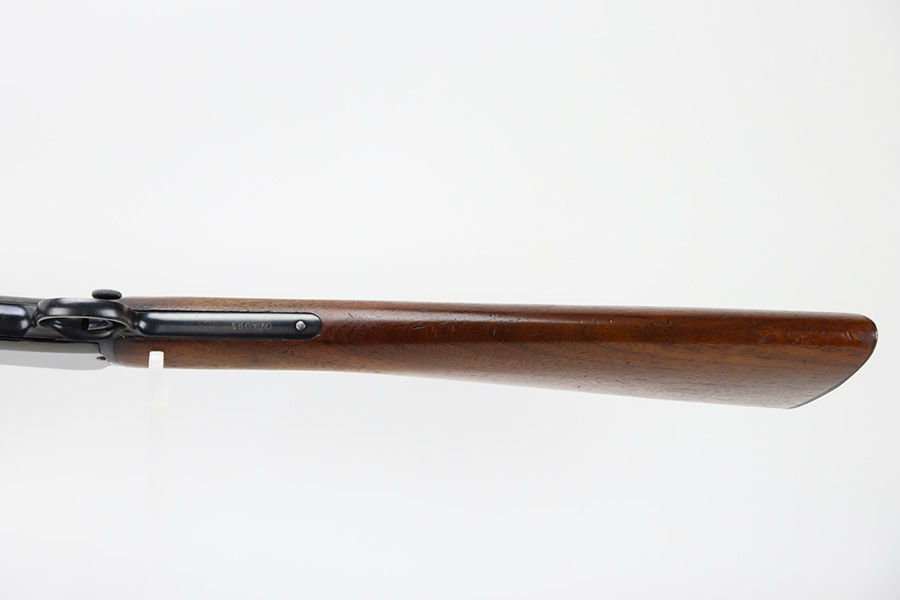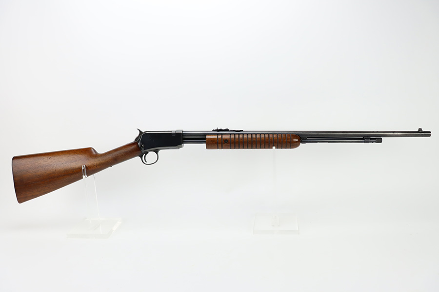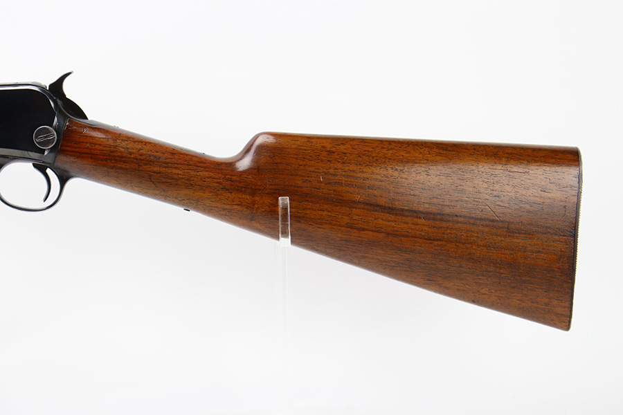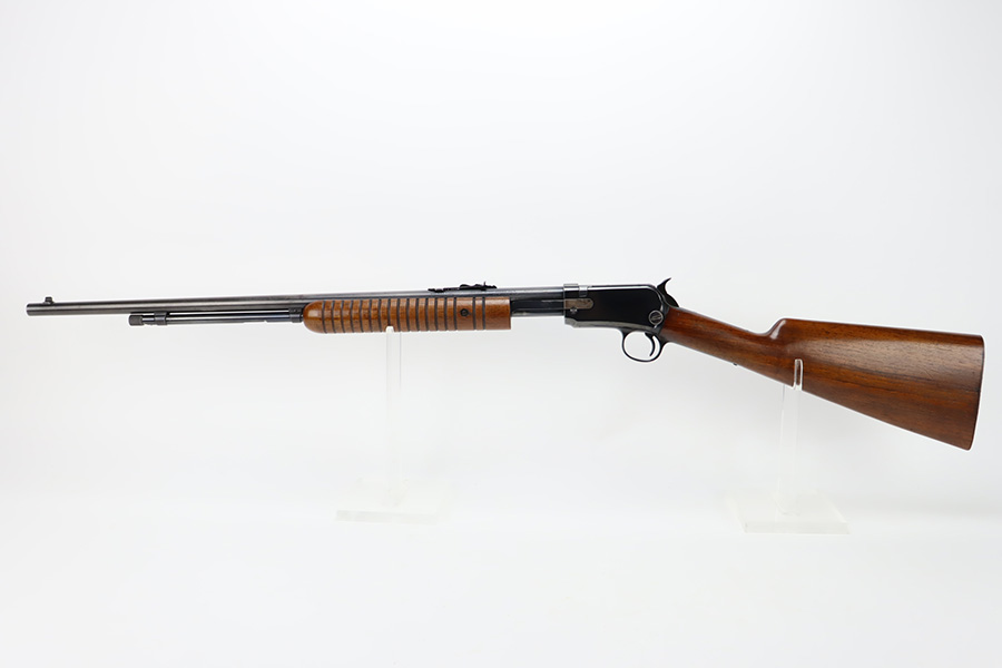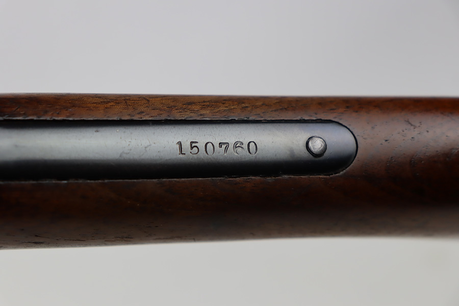 11/6/23 – This is an excellent Winchester Model 62A manufactured in August of 1942, chambered for either .22LR .22SL, and featuring a 23″ barrel. Although produced in 1939 at the beginning of WW2, this rifle is identical to the pre-war models 62 and 62A. It therefore includes several desirable features not found in later variations such as checkered hammer, steel butt plate, and the wooden fore-end used for pumping has complete rings. The tubular magazine is capable of holding 15 rounds. The gun has retained about 98% of its original finish, and most of the wear is concentrated along the top of the barrel, with some very minor thinning, a couple dark spots, and one very small area of finish loss. A few light surface scratches and handling marks on the receiver, as well as some wear along the high edges. Near flawless wood furniture, with just minor handling marks and no major scratches, cracks or damage, and a mint bore. Very difficult to find these in this condition.