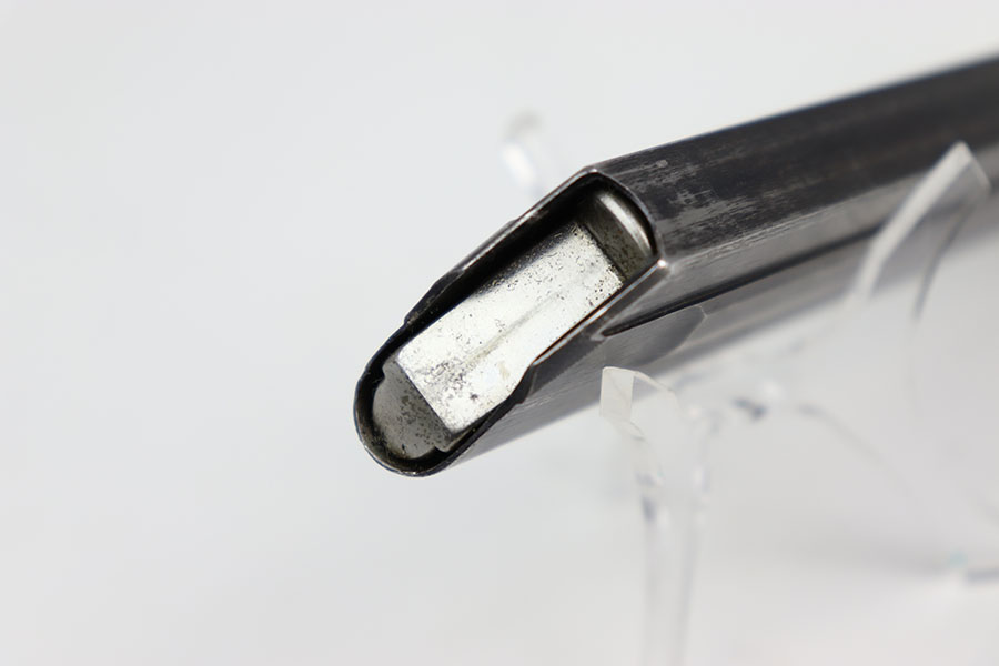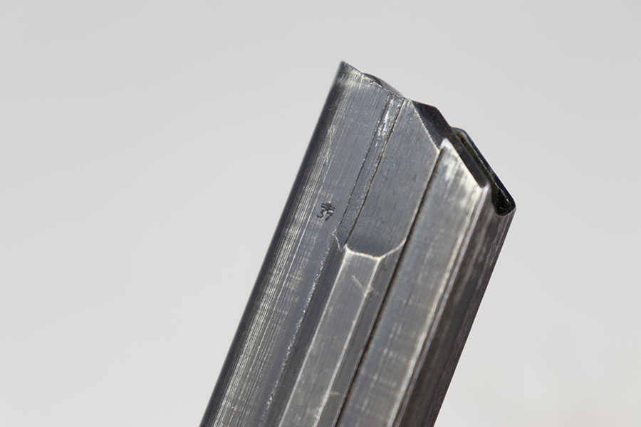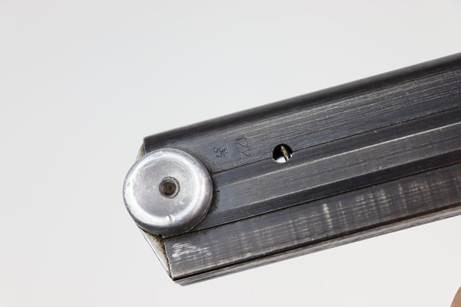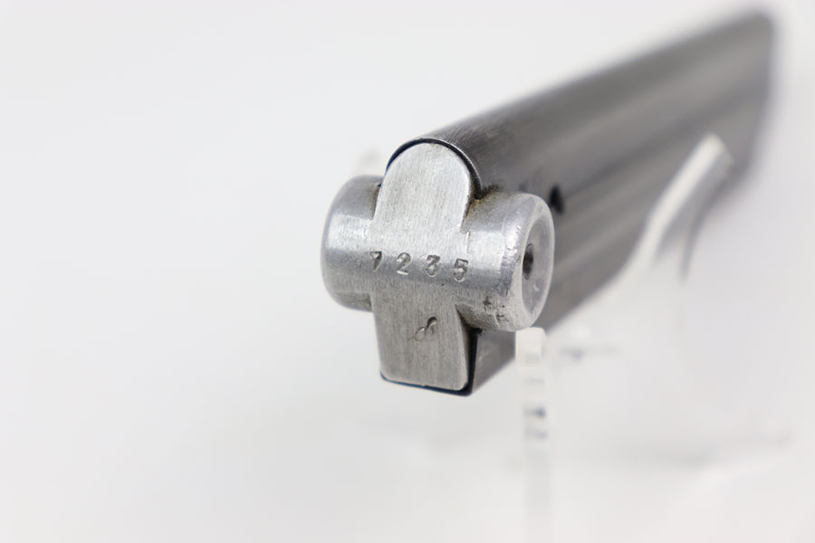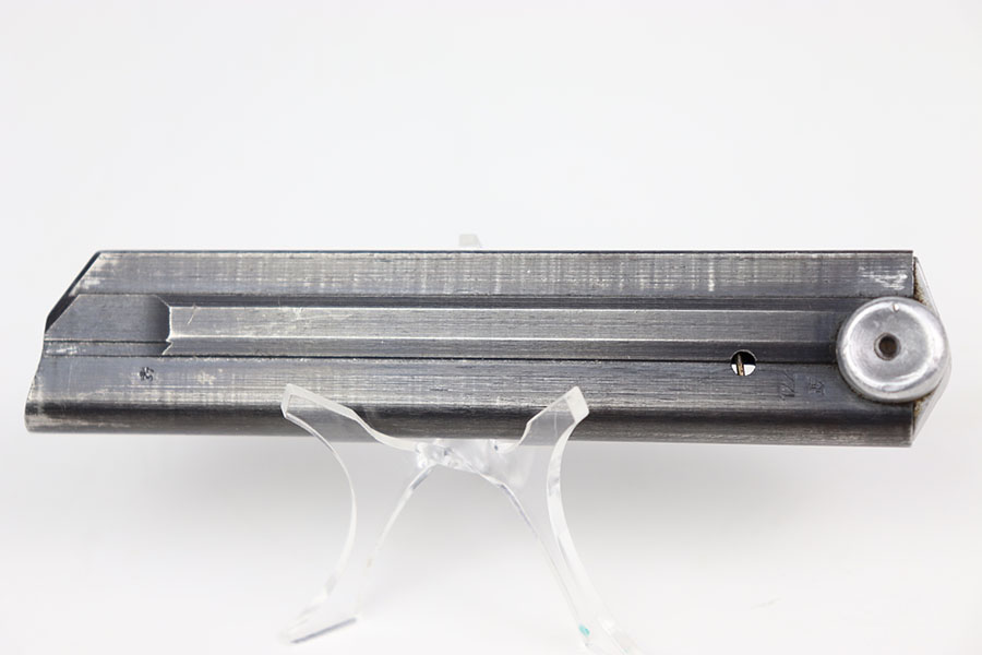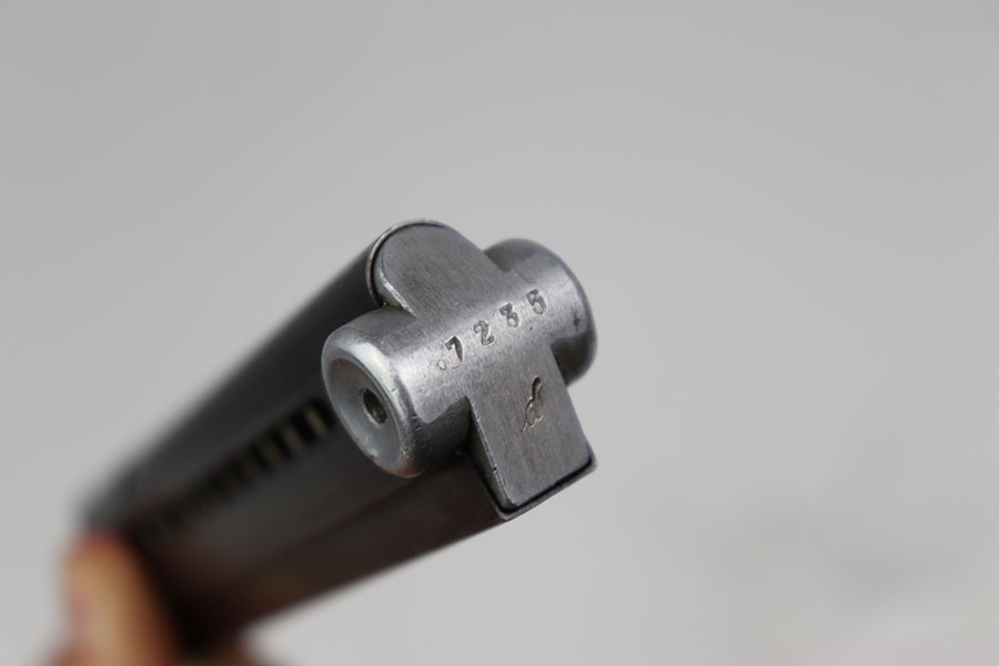 9/7/24 – This is an original “122” code late war variation (1939-41) Luger magazine from WW2. The magazine has a blued tube and aluminum base. The base is marked with the serial number “7235d”. The left side of the tube is “122” code stamped by Haenel with two “Eagle 37” proof stamps. The magazine is in excellent overall condition, with strong bluing throughout the tube. Has a strong and fully functional spring.
