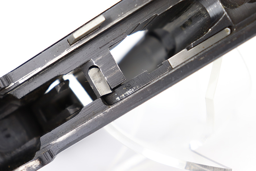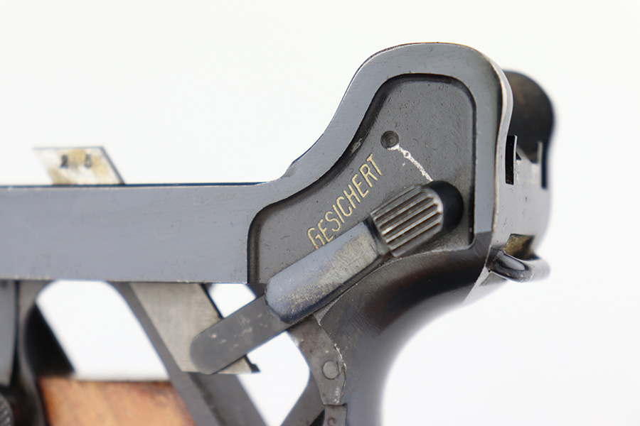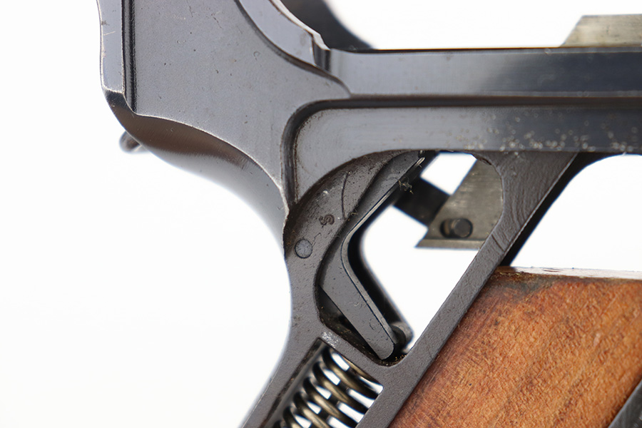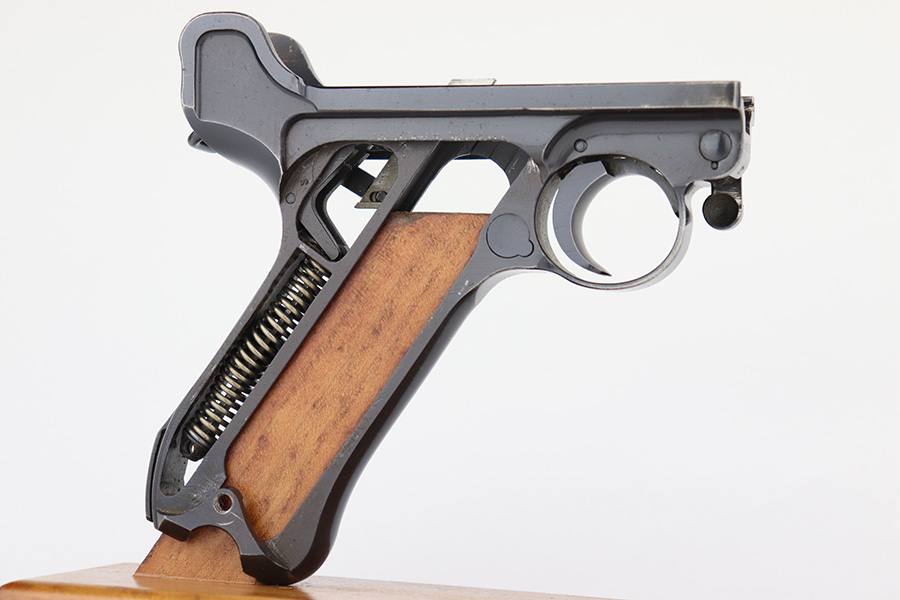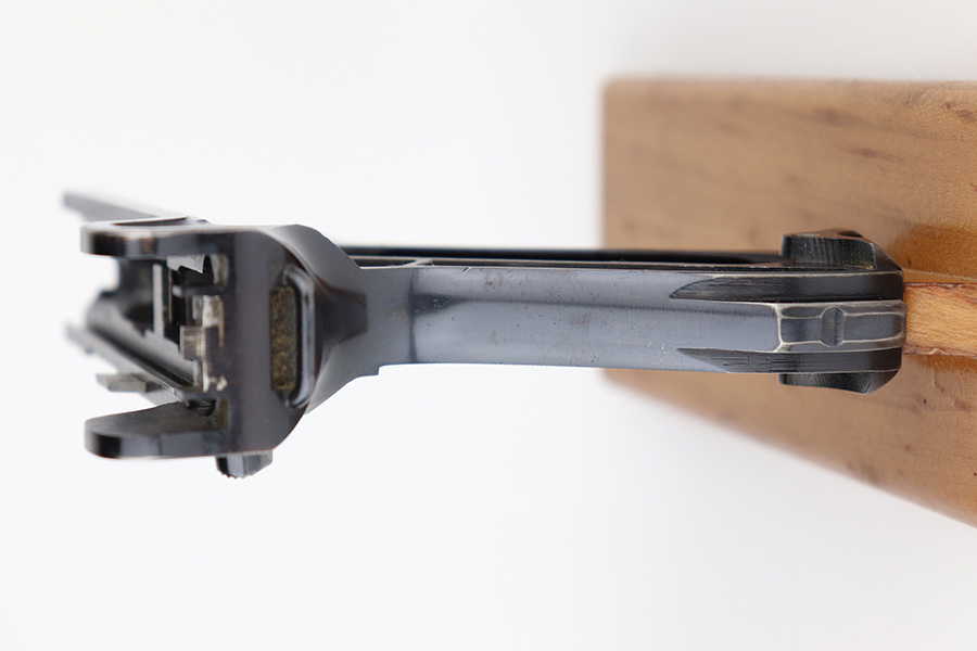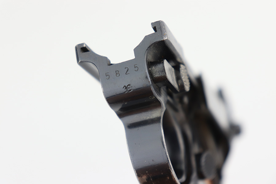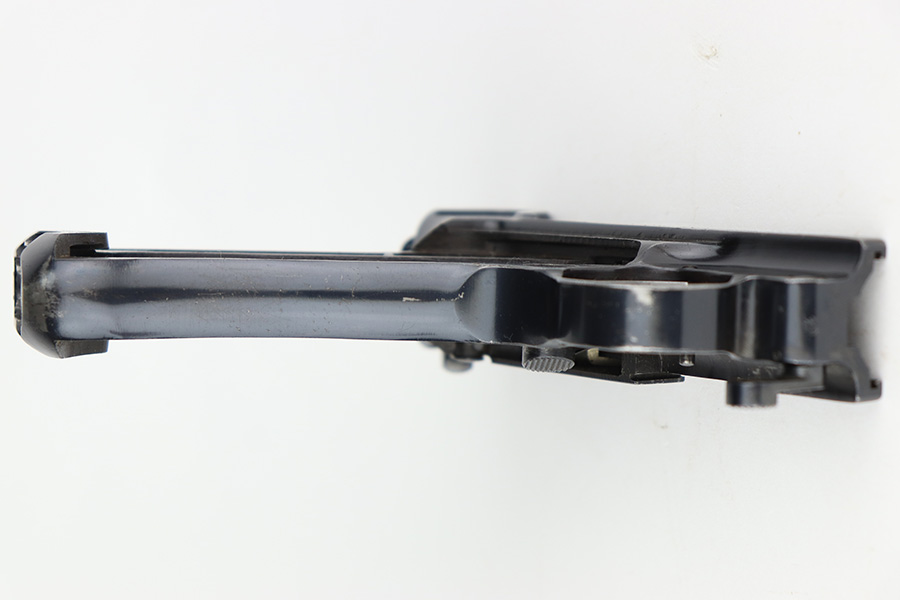 11/28/22 – This is an excellent example of a WW2-era Luger frame. The hump on the frame and the dimple in the slot of the stock lug tells us it was made by Mauser. The serial number is in the “x” block. You’ll notice that the small parts are blued, not straw-colored, so this frame would have been made between 1938 and 1942. Could’ve been a commercial, police, or military gun. All of the parts are matching. The front face of the takedown lever has been buffed. It has retained about 97% of its original bluing. There is very minor high edge wear in general, small spots of wear on the underside of the trigger guard and base of the front strap, and some tiny dings and light scratches on the front strap. The wood in the photos is our stand – it does not come with grips.