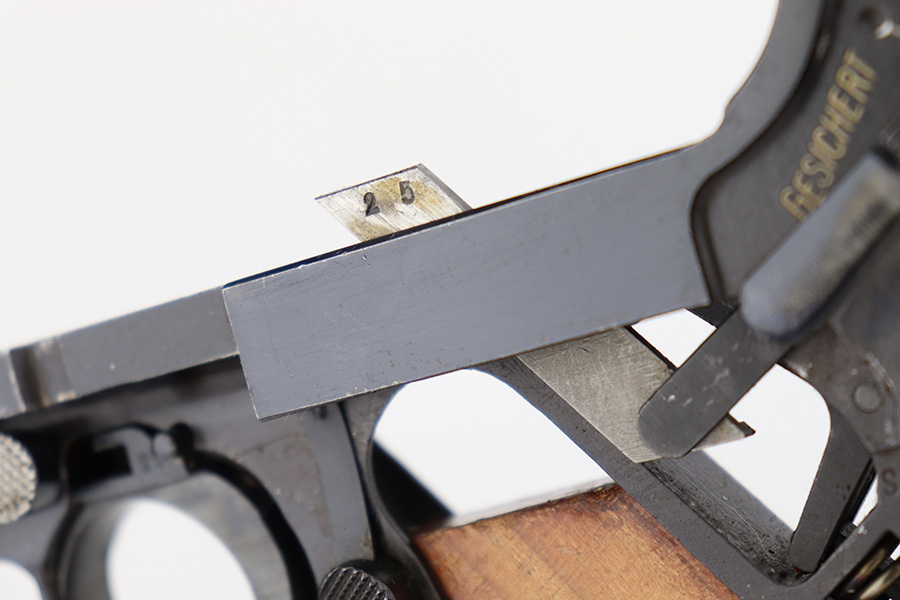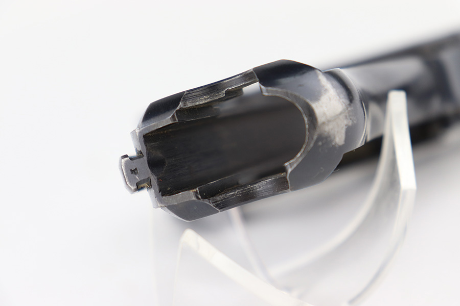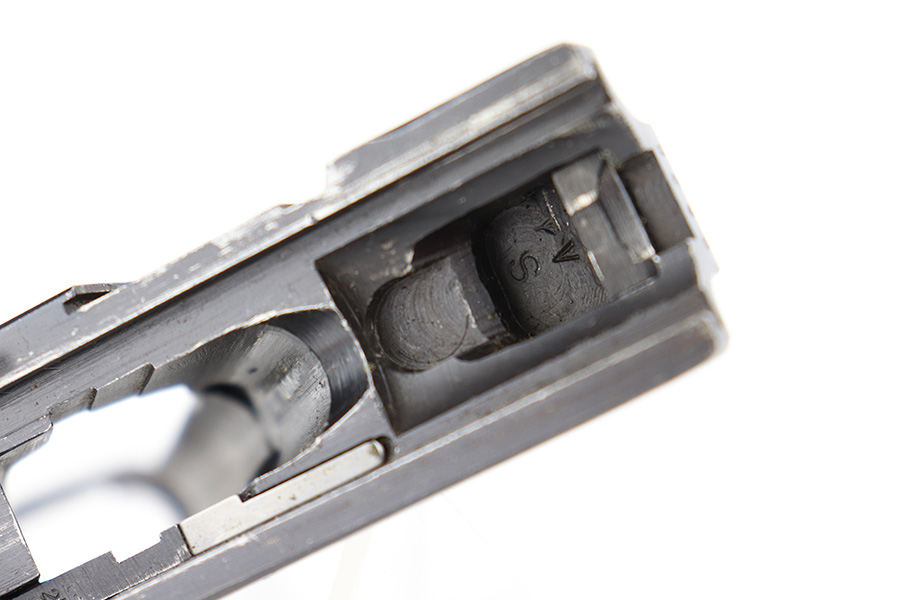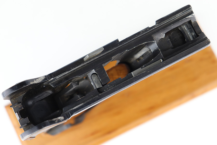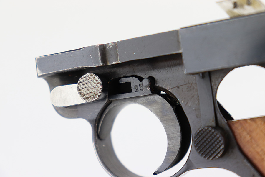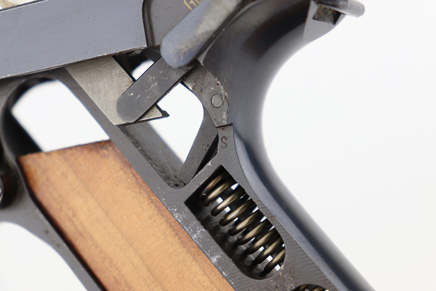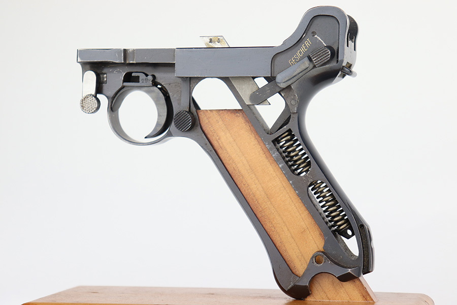 11/28/22 – This is an excellent example of a WW2-era Luger frame. The hump on the frame and the dimple in the slot of the stock lug tells us it was made by Mauser. The serial number is in the “x” block. You’ll notice that the small parts are blued, not straw-colored, so this frame would have been made between 1938 and 1942. Could’ve been a commercial, police, or military gun. All of the parts are matching. The front face of the takedown lever has been buffed. It has retained about 97% of its original bluing. There is very minor high edge wear in general, small spots of wear on the underside of the trigger guard and base of the front strap, and some tiny dings and light scratches on the front strap. The wood in the photos is our stand – it does not come with grips.