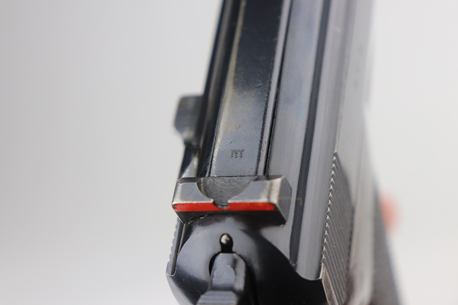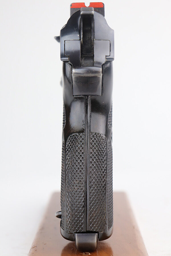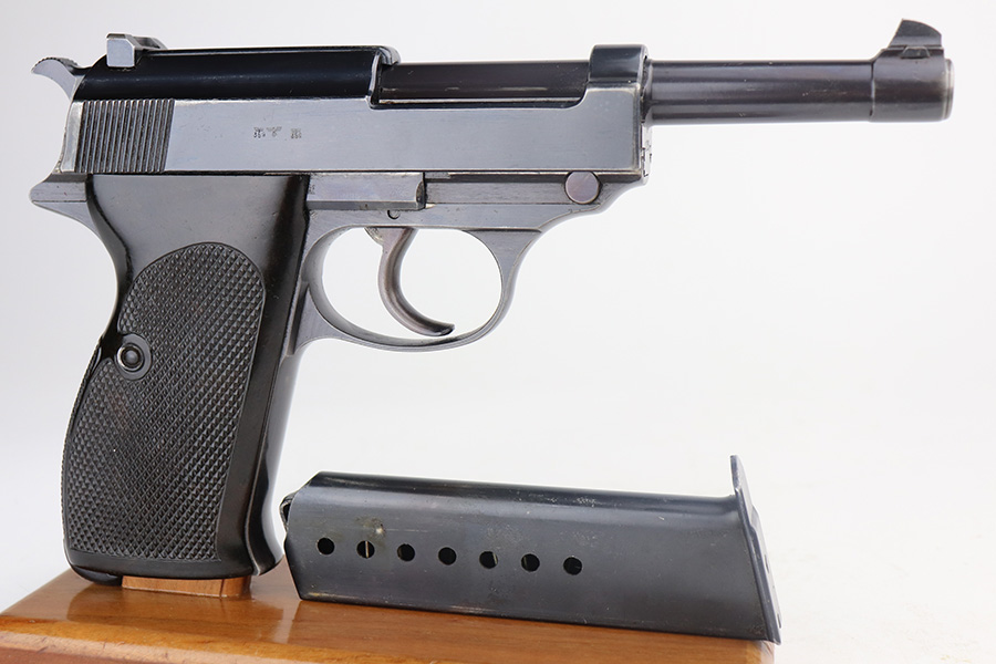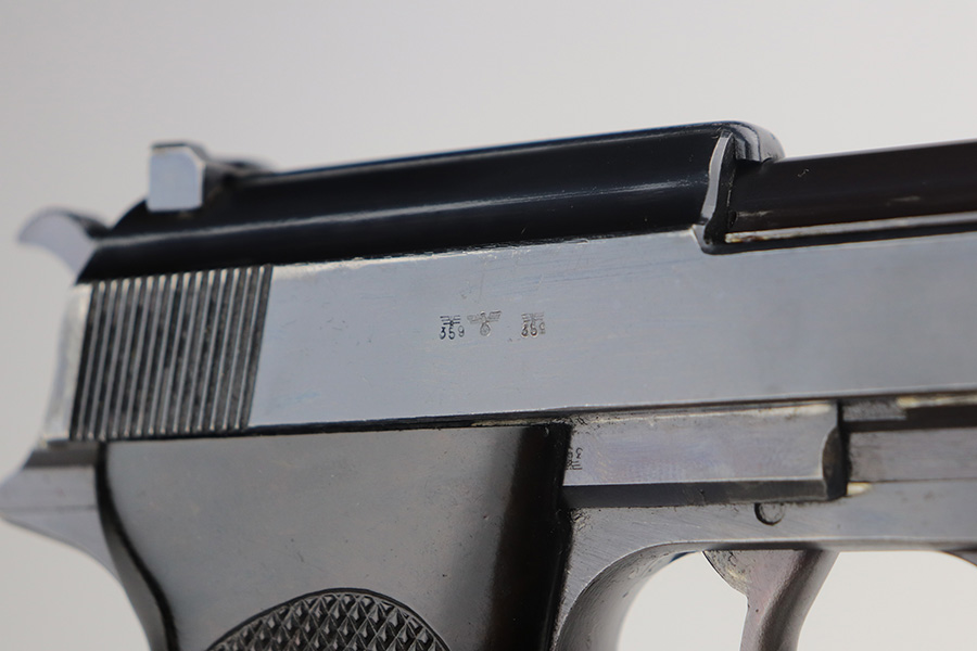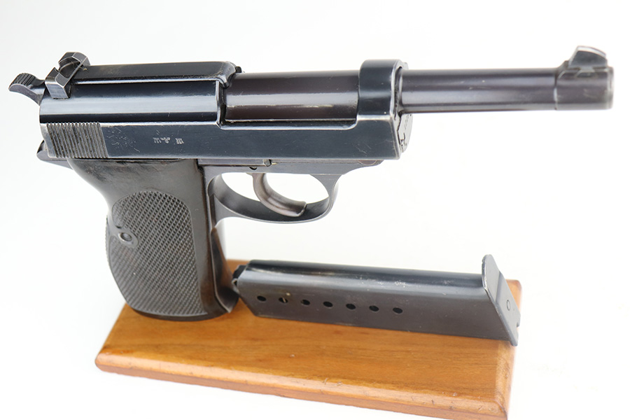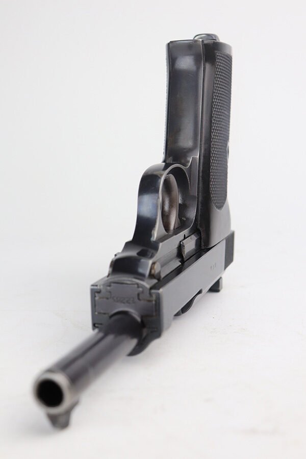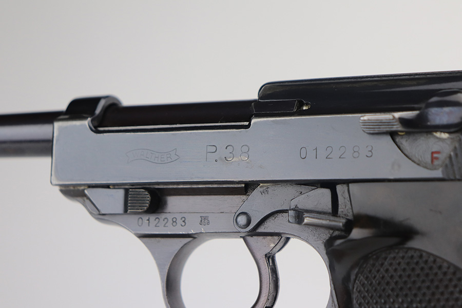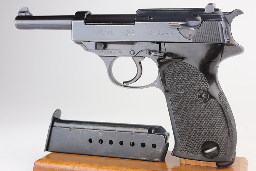 6/2/21 – This is an excellent example of a Zero Series Walther P.38 issued to the Nazi military in early 1940. The gun is all matching and has the proper “Eagle 359” military proofs throughout, even on the small parts. It has retained about 94-95% of its original high polish finish. There areas of wear on the underside of the trigger guard, high edges of the slide, and around the muzzle. One small spot of wear on the left side of the slide. Minor spotty wear and patina on the front strap. Comes with excellent matching grips and an un-numbered Walther magazine. Very nice bore with strong rifling. Painted rear sight. De-cocker is functional.