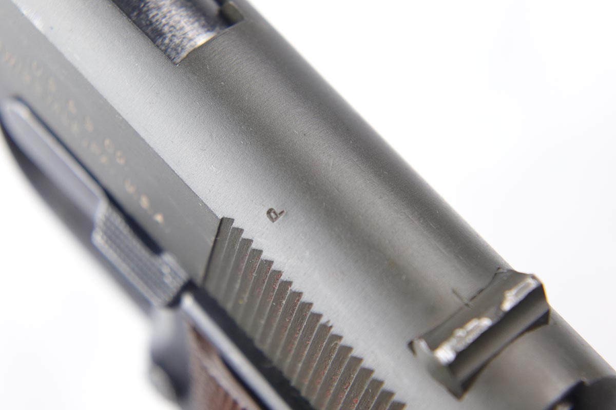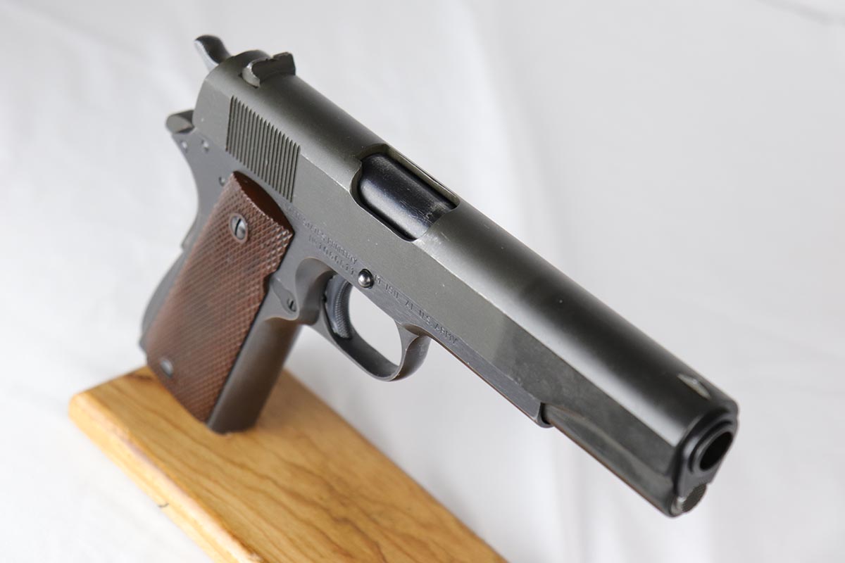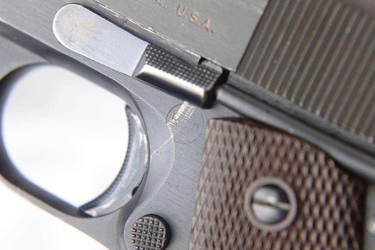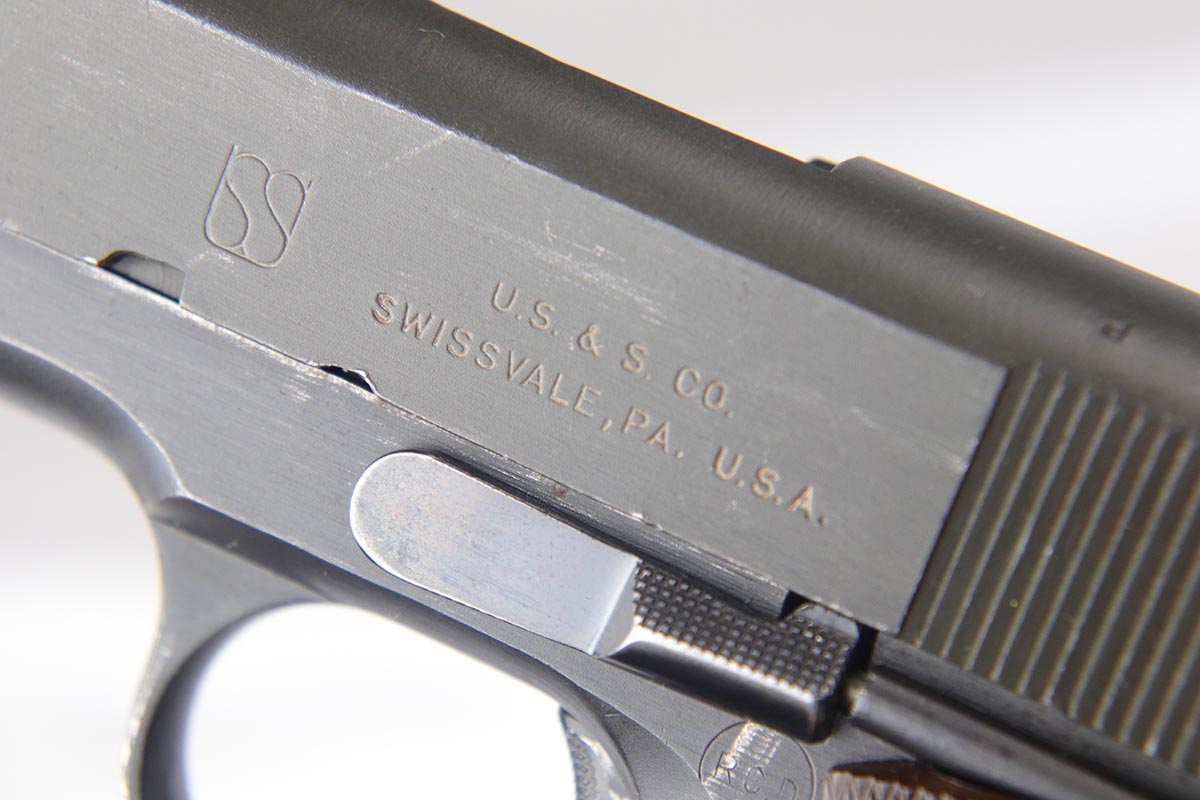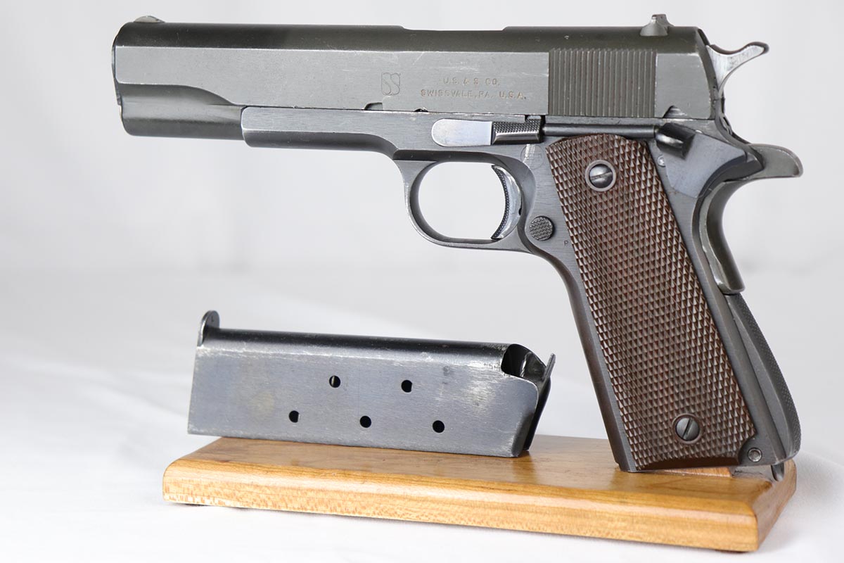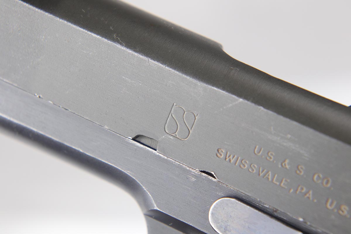 The Union Switch & Signal company of Swissvale Pennsylvania, primarily made railroad signaling equipment but received a contract on May 5, 1942 for the manufacture of M1911A1 pistols. The first pistols were accepted by Ordnance inspectors in January 1943, but the company received word that their contract would be canceled. Within a month U.S.&S. had signed a contract to supply carbine parts. On March 8, 1943 the company was officially notified that their contract had been cut back from 200,000 pistols to 30,000 pistols. However on June 26th, when the contract was nearly complete, and many of the workers had been transferred to Carbine operations, the company received a letter of intent to purchase an additional 25,000 pistols. The last of the pistols was shipped on November 27, 1943. 55,000 Union Switch and Signal pistols were delivered serial numbered from 1041405 to 1096404. U.S.&S. pistols are the second rarest of the M1911A1s (55,000 produced), only the Singer is rarer (500 produced). None of the Union Switch & Signal 1911A1s have the crossed cannons ordnance stamp. We are told these were issued to the Army Air Corps during the war.