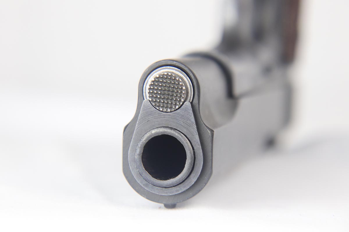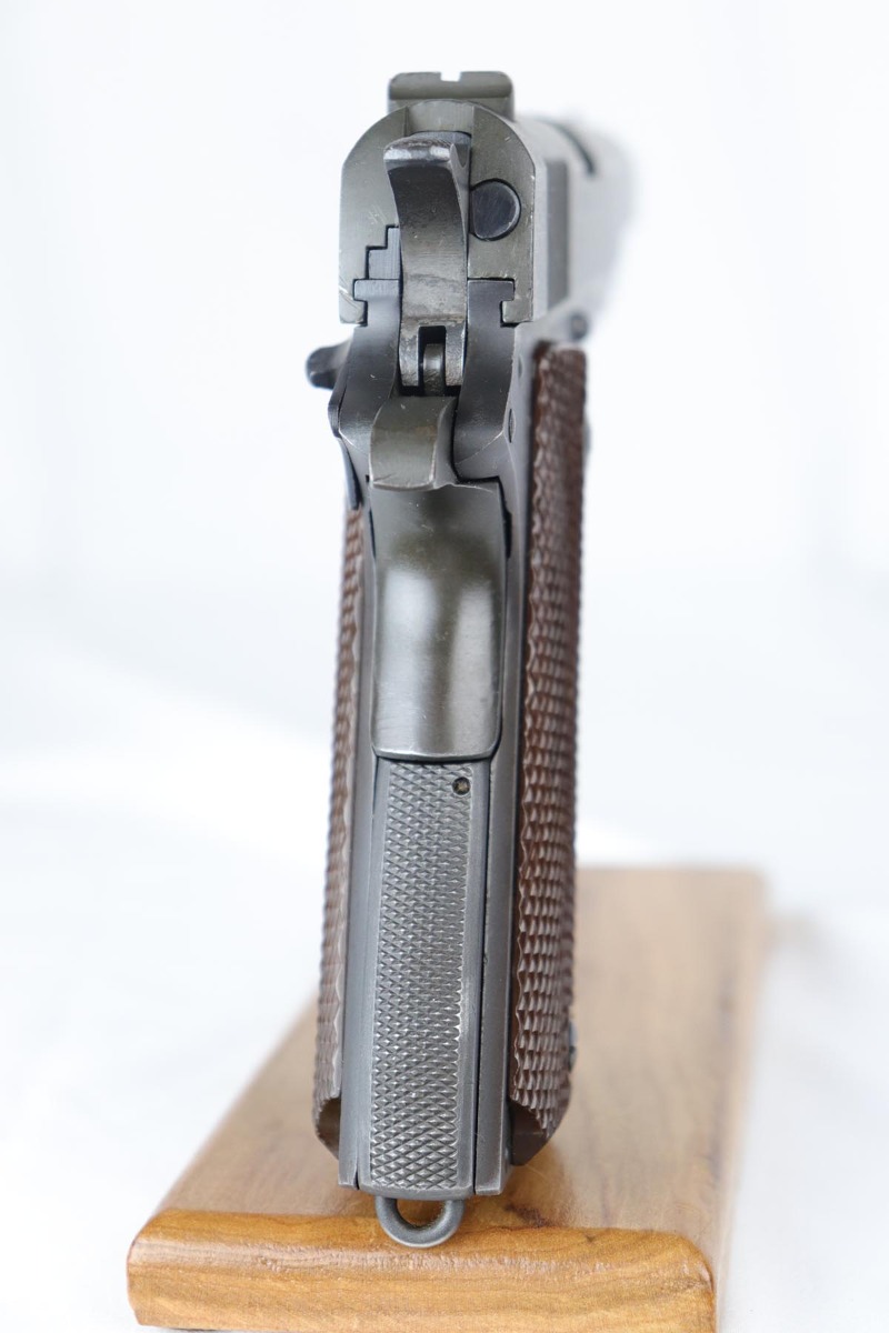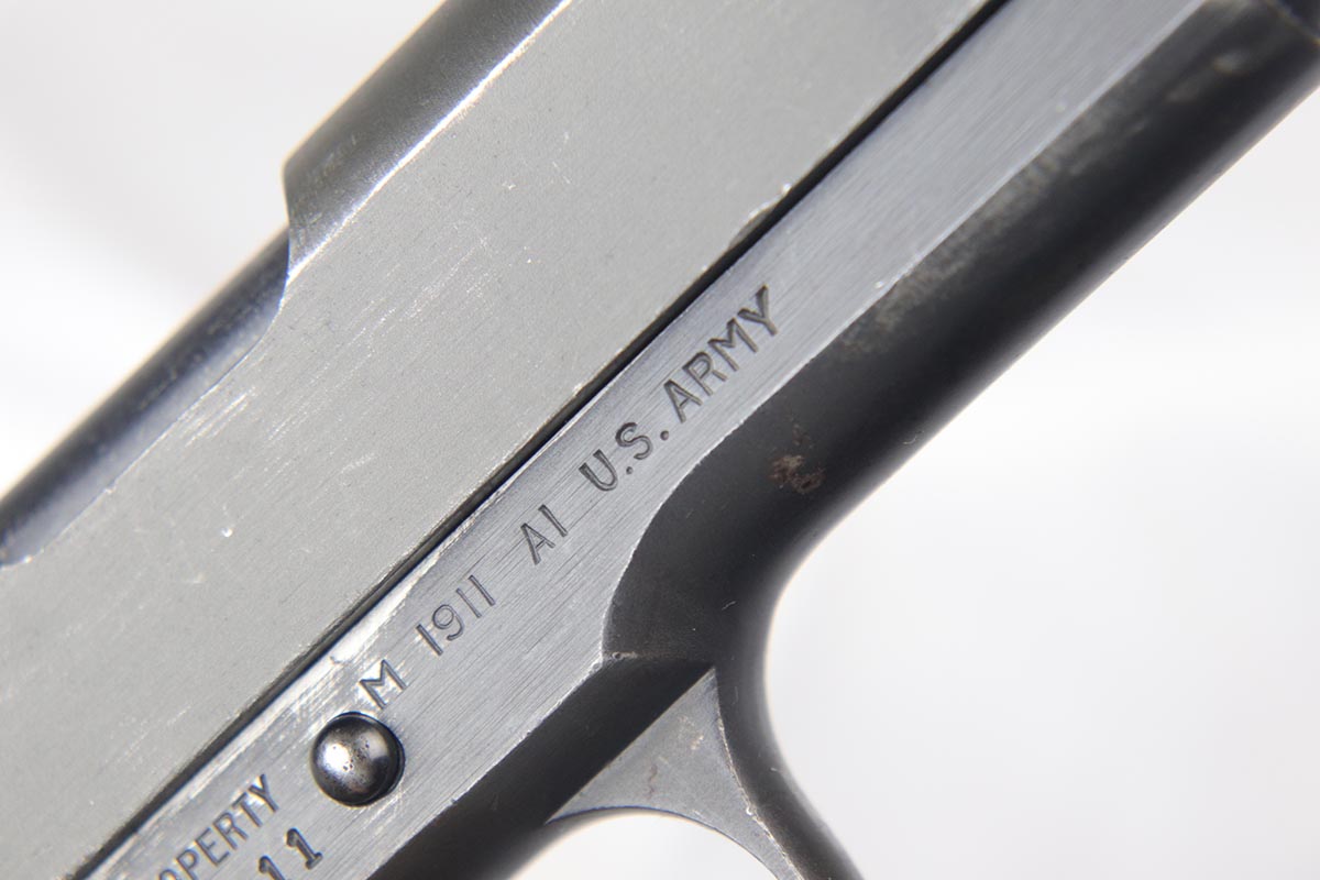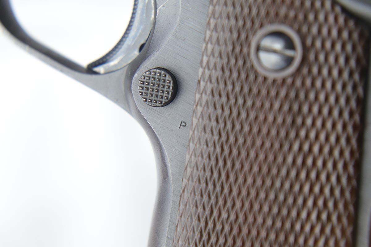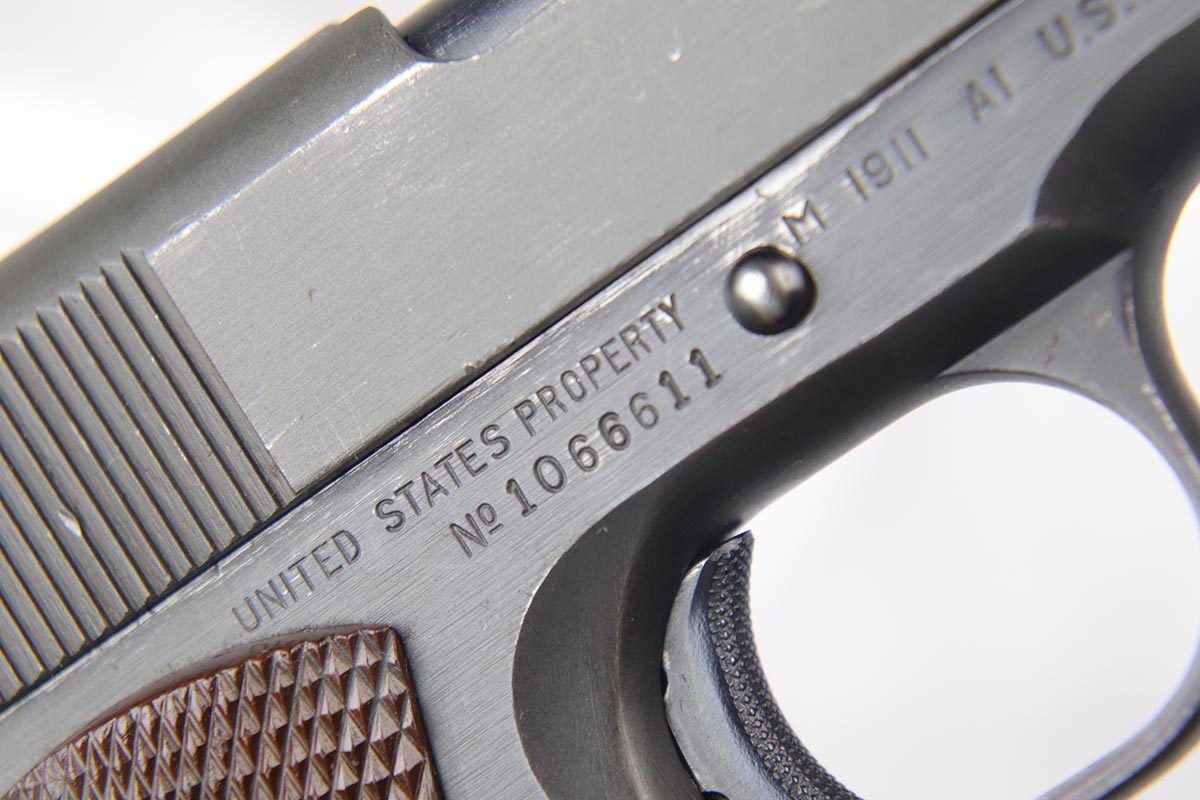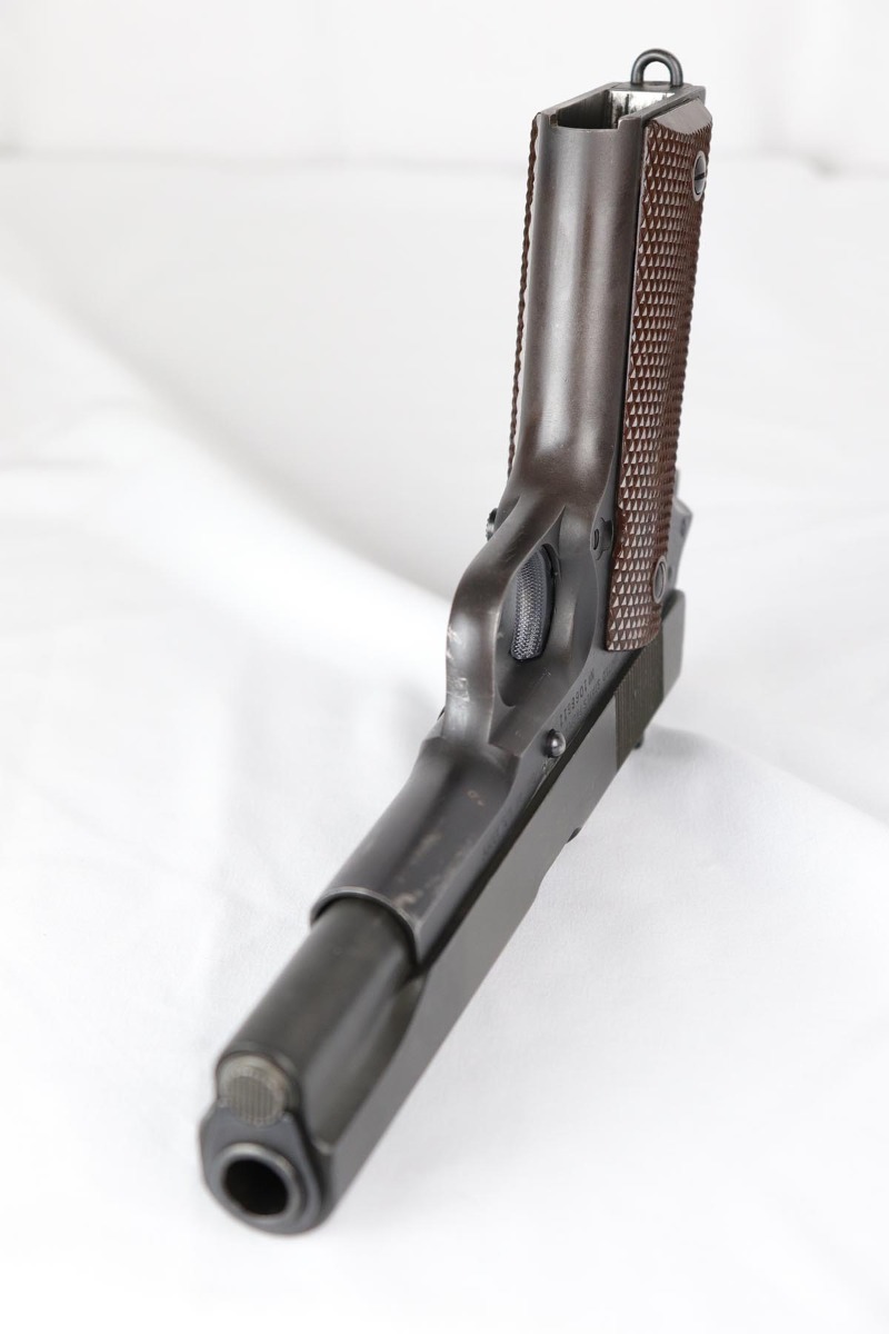 The Union Switch & Signal company of Swissvale Pennsylvania, primarily made railroad signaling equipment but received a contract on May 5, 1942 for the manufacture of M1911A1 pistols. The first pistols were accepted by Ordnance inspectors in January 1943, but the company received word that their contract would be canceled. Within a month U.S.&S. had signed a contract to supply carbine parts. On March 8, 1943 the company was officially notified that their contract had been cut back from 200,000 pistols to 30,000 pistols. However on June 26th, when the contract was nearly complete, and many of the workers had been transferred to Carbine operations, the company received a letter of intent to purchase an additional 25,000 pistols. The last of the pistols was shipped on November 27, 1943. 55,000 Union Switch and Signal pistols were delivered serial numbered from 1041405 to 1096404. U.S.&S. pistols are the second rarest of the M1911A1s (55,000 produced), only the Singer is rarer (500 produced). None of the Union Switch & Signal 1911A1s have the crossed cannons ordnance stamp. We are told these were issued to the Army Air Corps during the war.