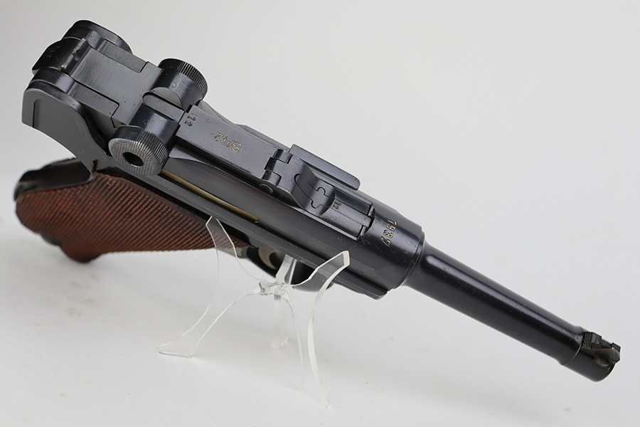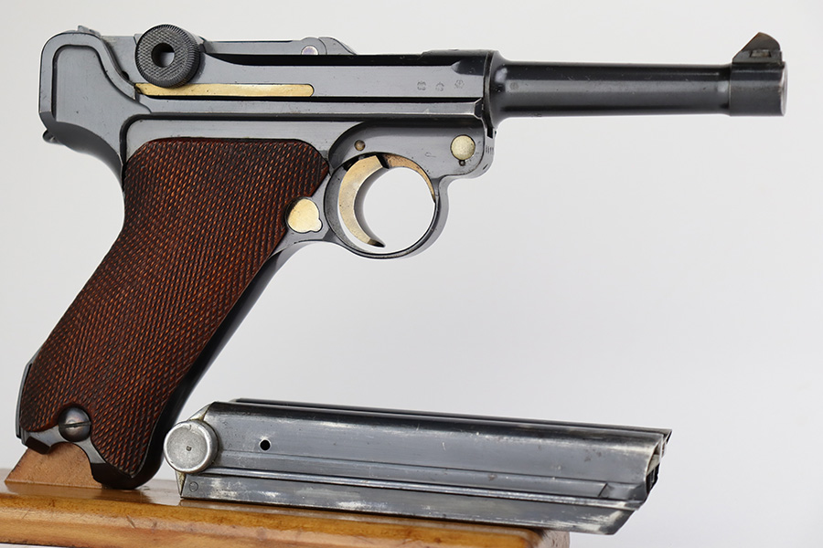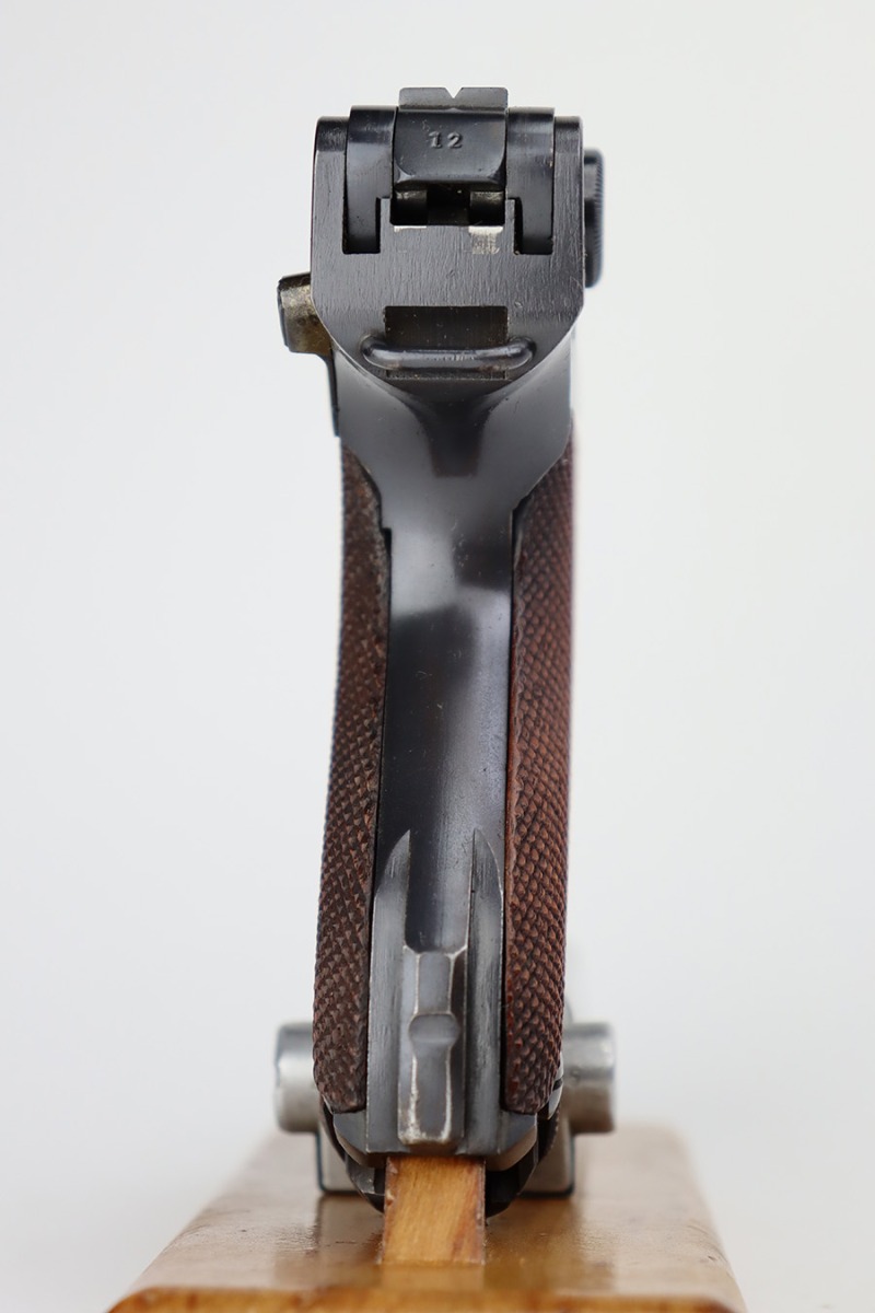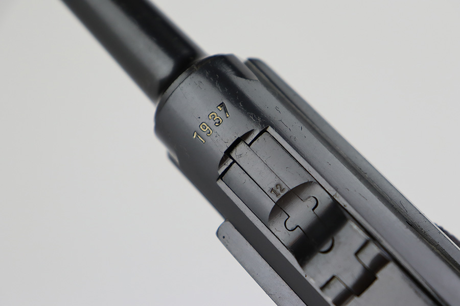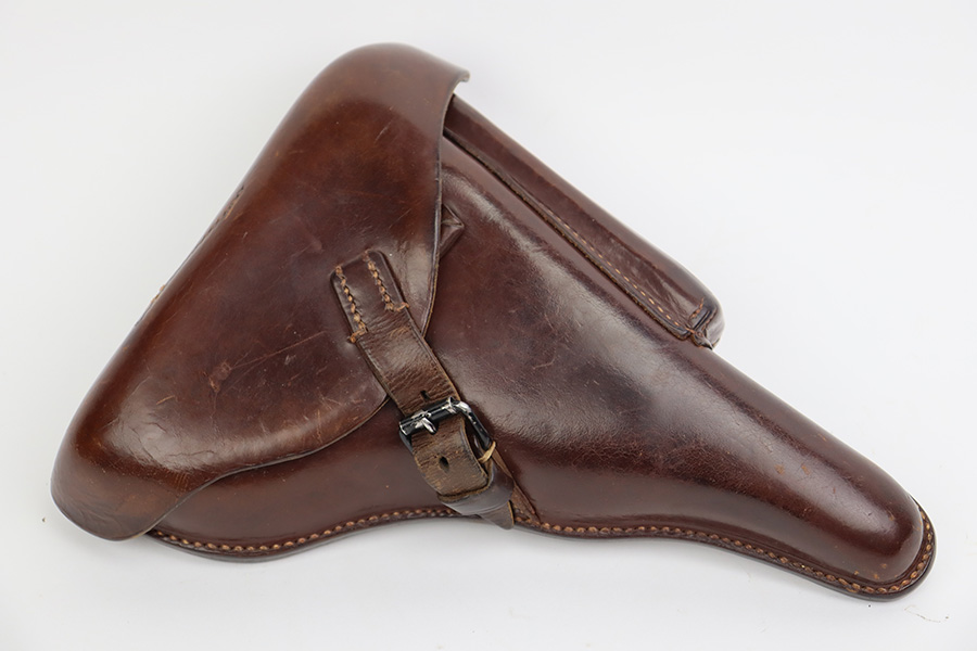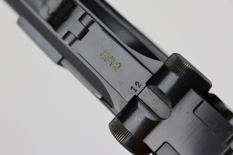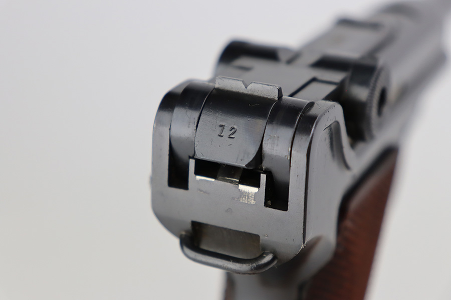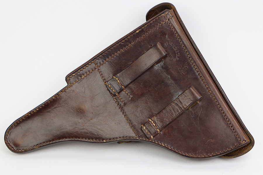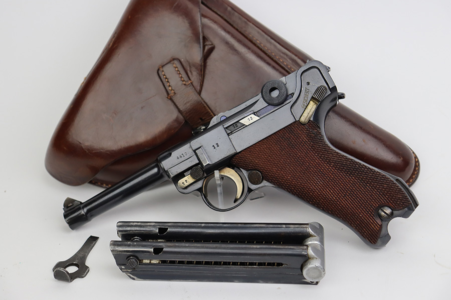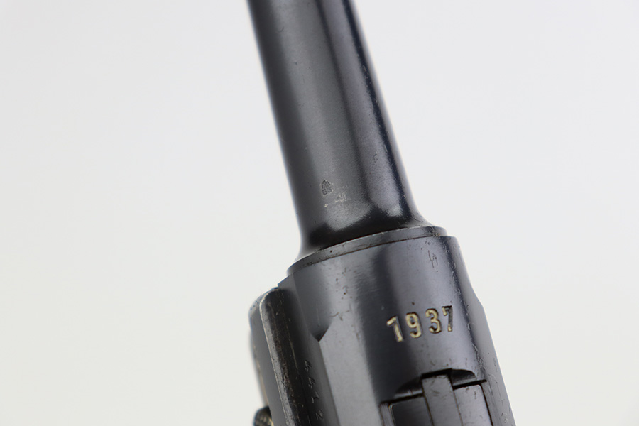7/11/23 – This is an exceptional example of a complete Army Mauser Luger rig from 1937. It’s a first variation example with strawed small parts. The original blue rates at 97-98% with minor wear on the muzzle/sideplate and a little more on the front strap. Original, matching grips and one of the original, matching magazines. The grips are beautiful with sharp checkering but there is a small, repaired chip under the safety. Strong, shiny bore with minor signs of use. The rig includes a period original but mismatched magazine, as well as a droop E/63 tool. It is completed by a gorgeous brown leather holster, which shows no notable defects.