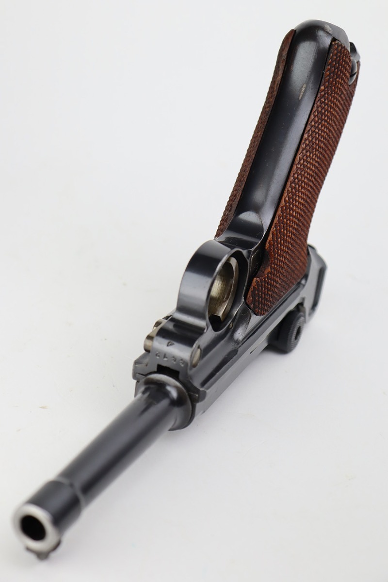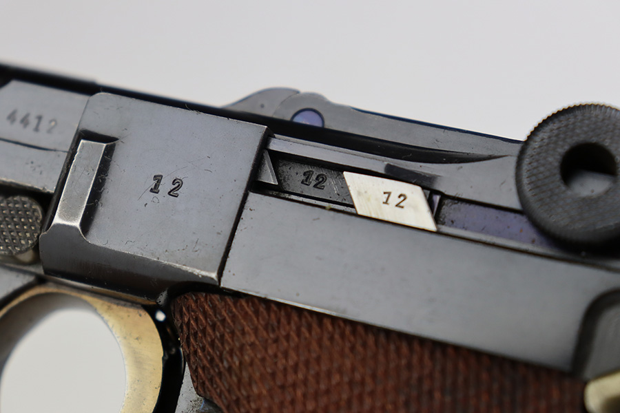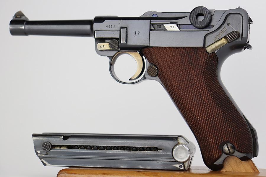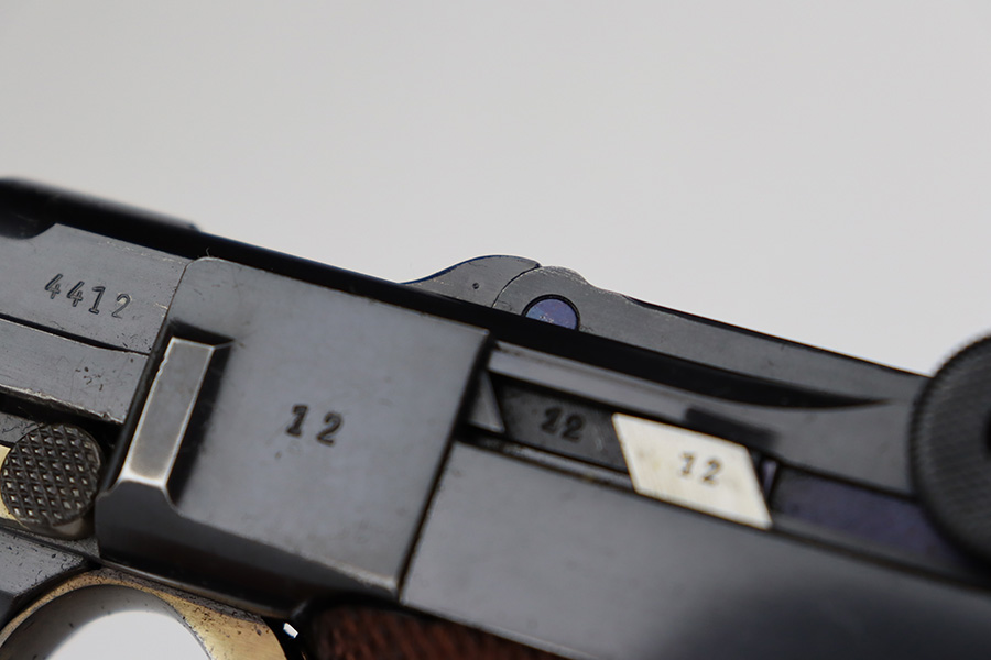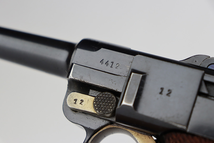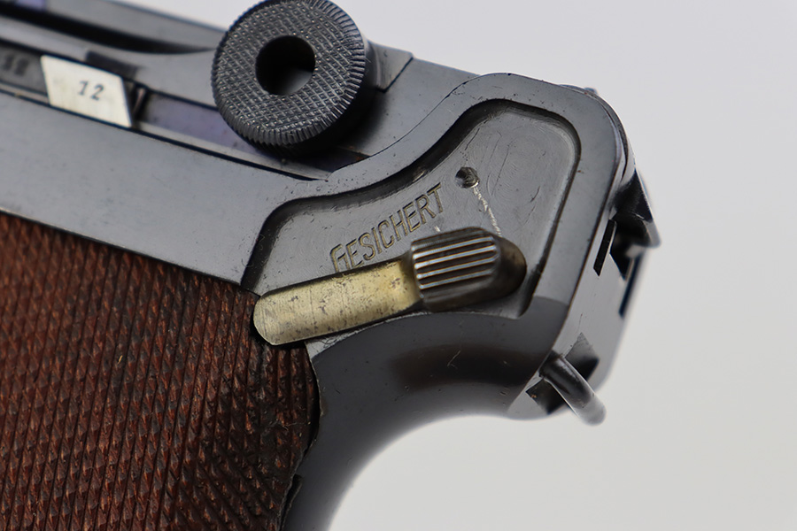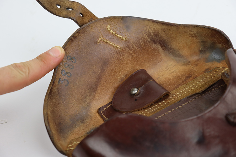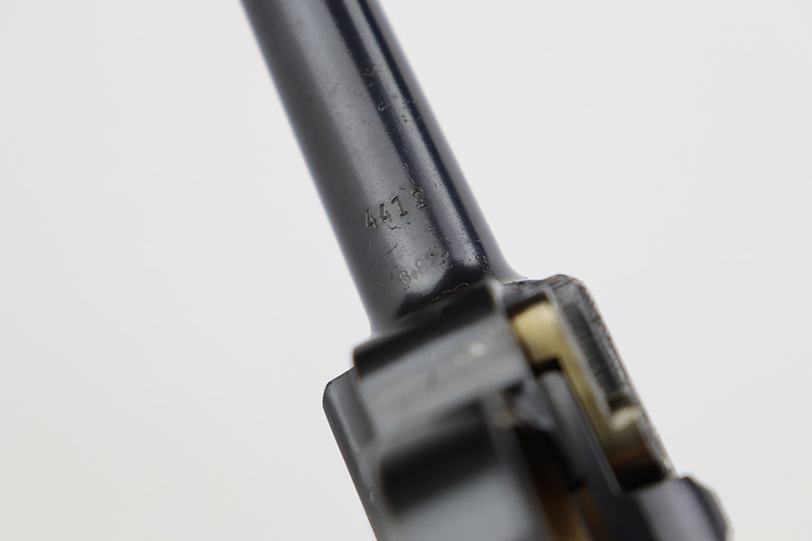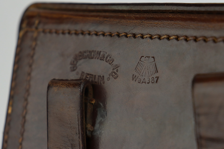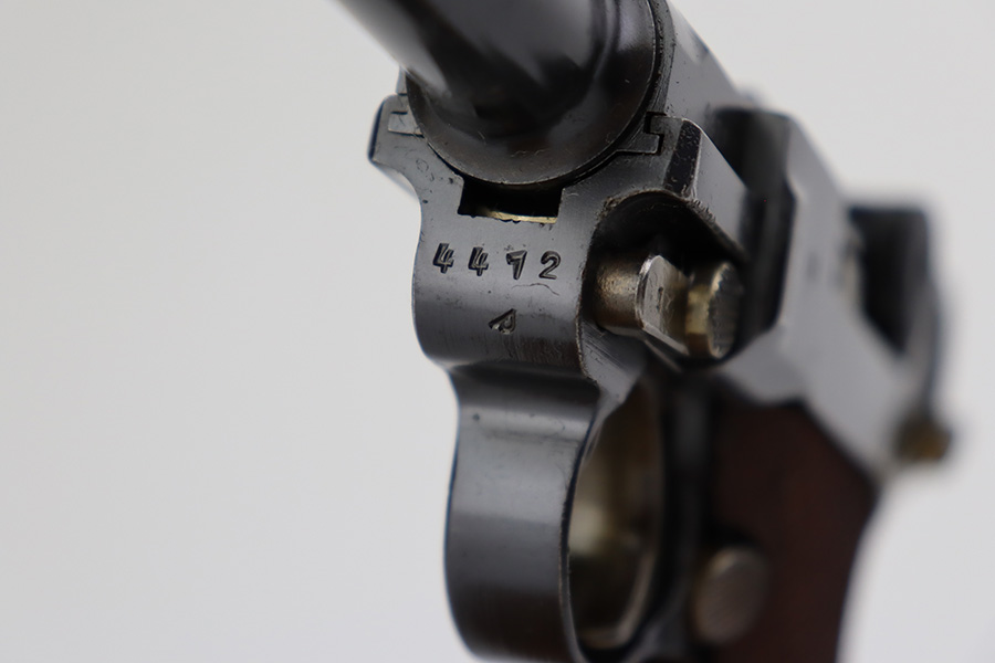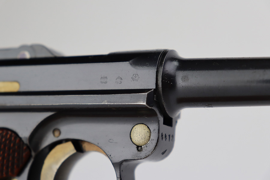 7/11/23 – This is an exceptional example of a complete Army Mauser Luger rig from 1937. It’s a first variation example with strawed small parts. The original blue rates at 97-98% with minor wear on the muzzle/sideplate and a little more on the front strap. Original, matching grips and one of the original, matching magazines. The grips are beautiful with sharp checkering but there is a small, repaired chip under the safety. Strong, shiny bore with minor signs of use. The rig includes a period original but mismatched magazine, as well as a droop E/63 tool. It is completed by a gorgeous brown leather holster, which shows no notable defects.