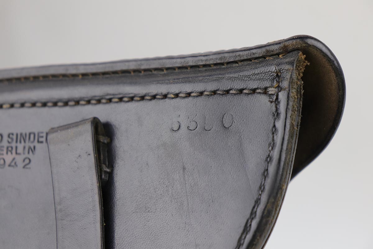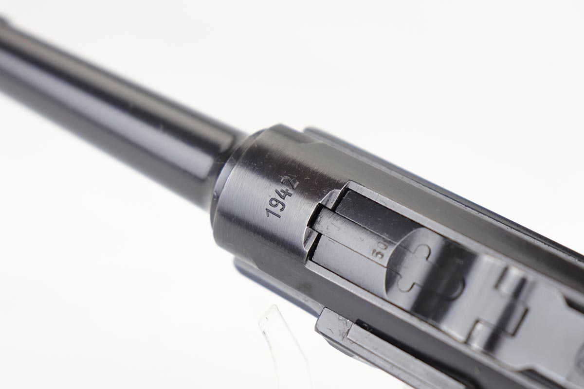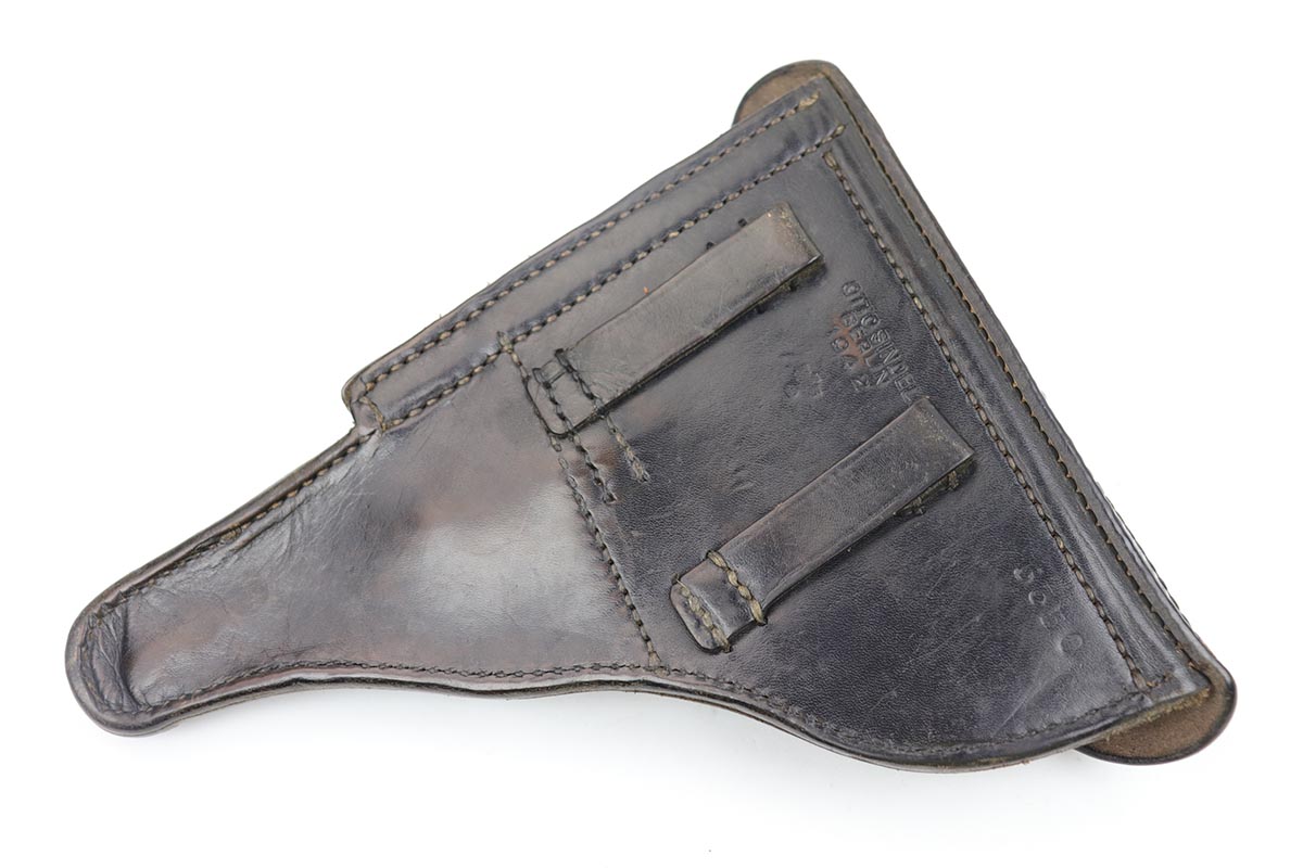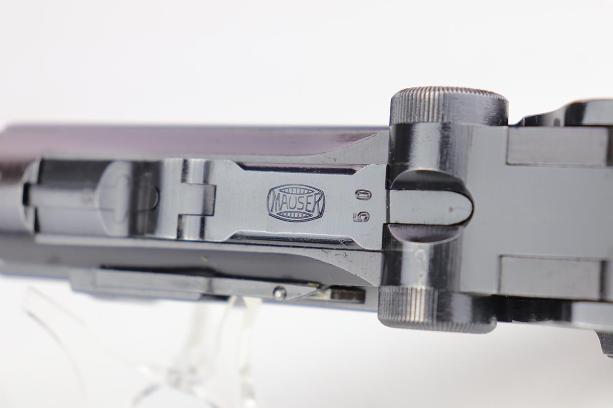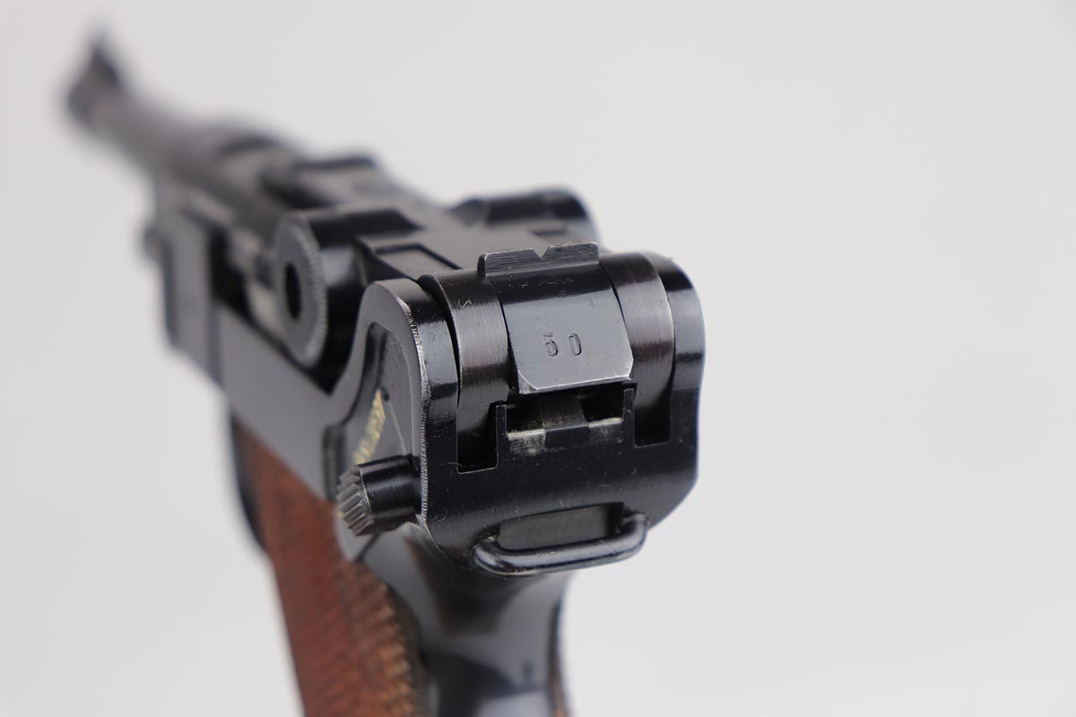3/3/20 – This is an exceptional and complete Police Mauser Luger rig from 1942, with both matching magazines, and matching numbered holster and tool. There were only about 4,700 of this variation produced. The pistol has 99% of the original blue remaining, with only minor high point wear from the holster. Everything in this listing is numbered and matching, including the grips. Pistol has a mint bore and the grips are nearly as nice. The holster is 1942 dated with Otto Sindel maker mark, and is numbered to the gun in the upper right corner. Tool is unmarked other than the matching serial of the pistol.