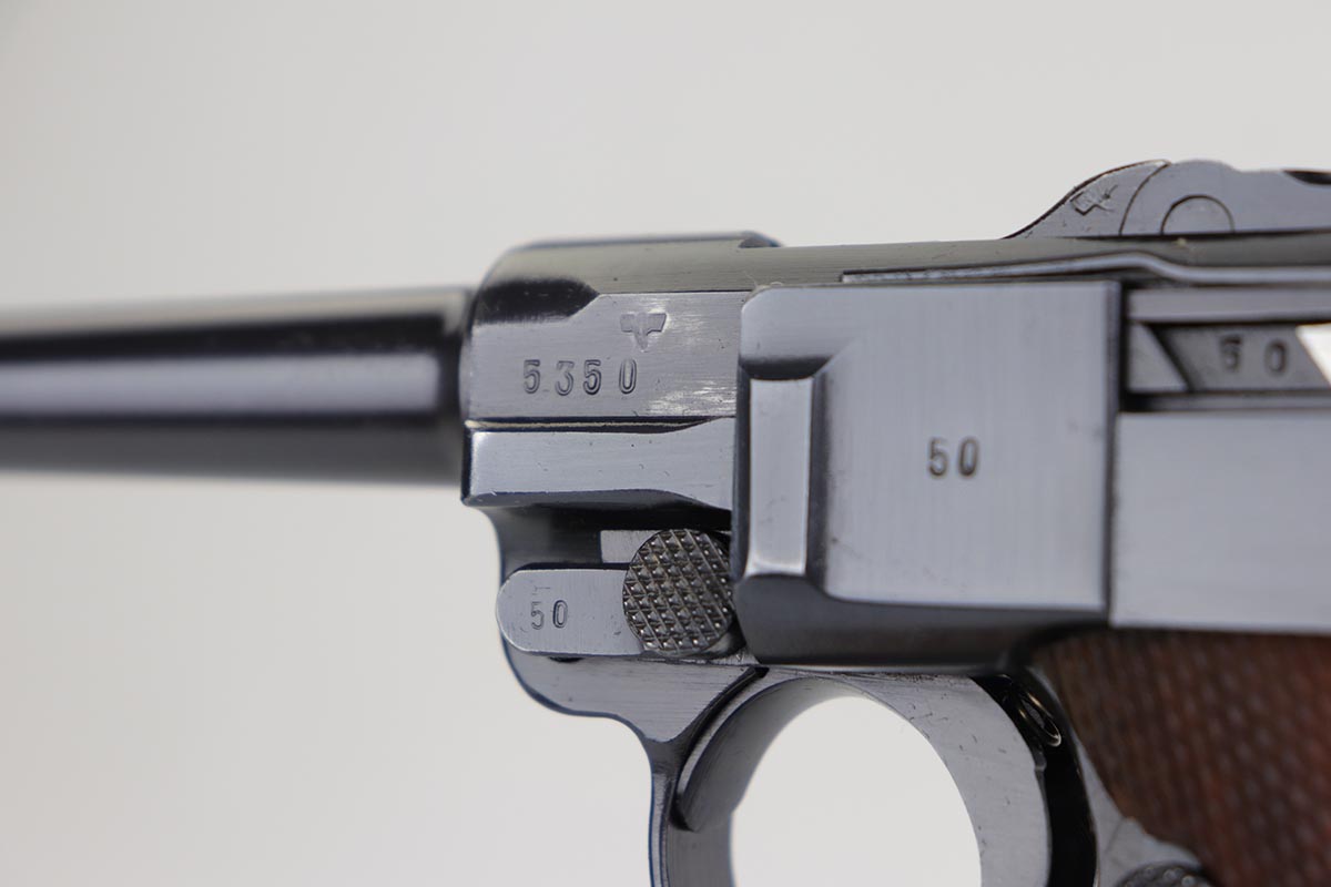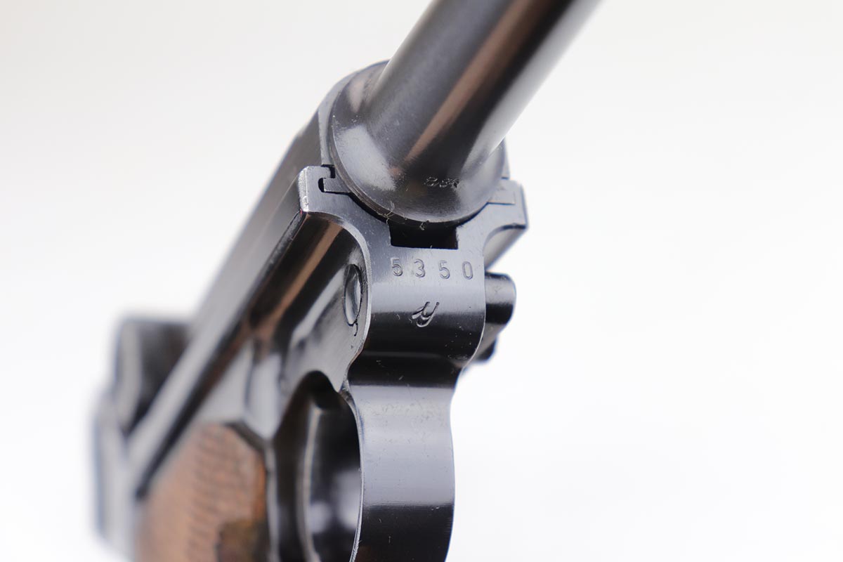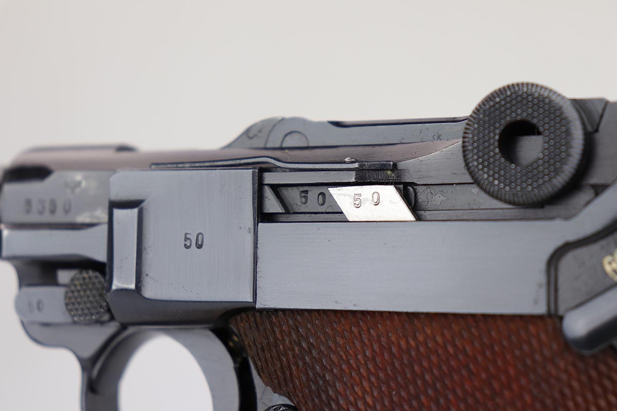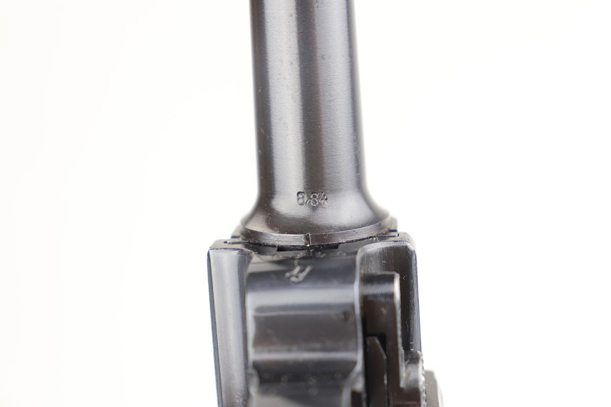 3/3/20 – This is an exceptional and complete Police Mauser Luger rig from 1942, with both matching magazines, and matching numbered holster and tool. There were only about 4,700 of this variation produced. The pistol has 99% of the original blue remaining, with only minor high point wear from the holster. Everything in this listing is numbered and matching, including the grips. Pistol has a mint bore and the grips are nearly as nice. The holster is 1942 dated with Otto Sindel maker mark, and is numbered to the gun in the upper right corner. Tool is unmarked other than the matching serial of the pistol.